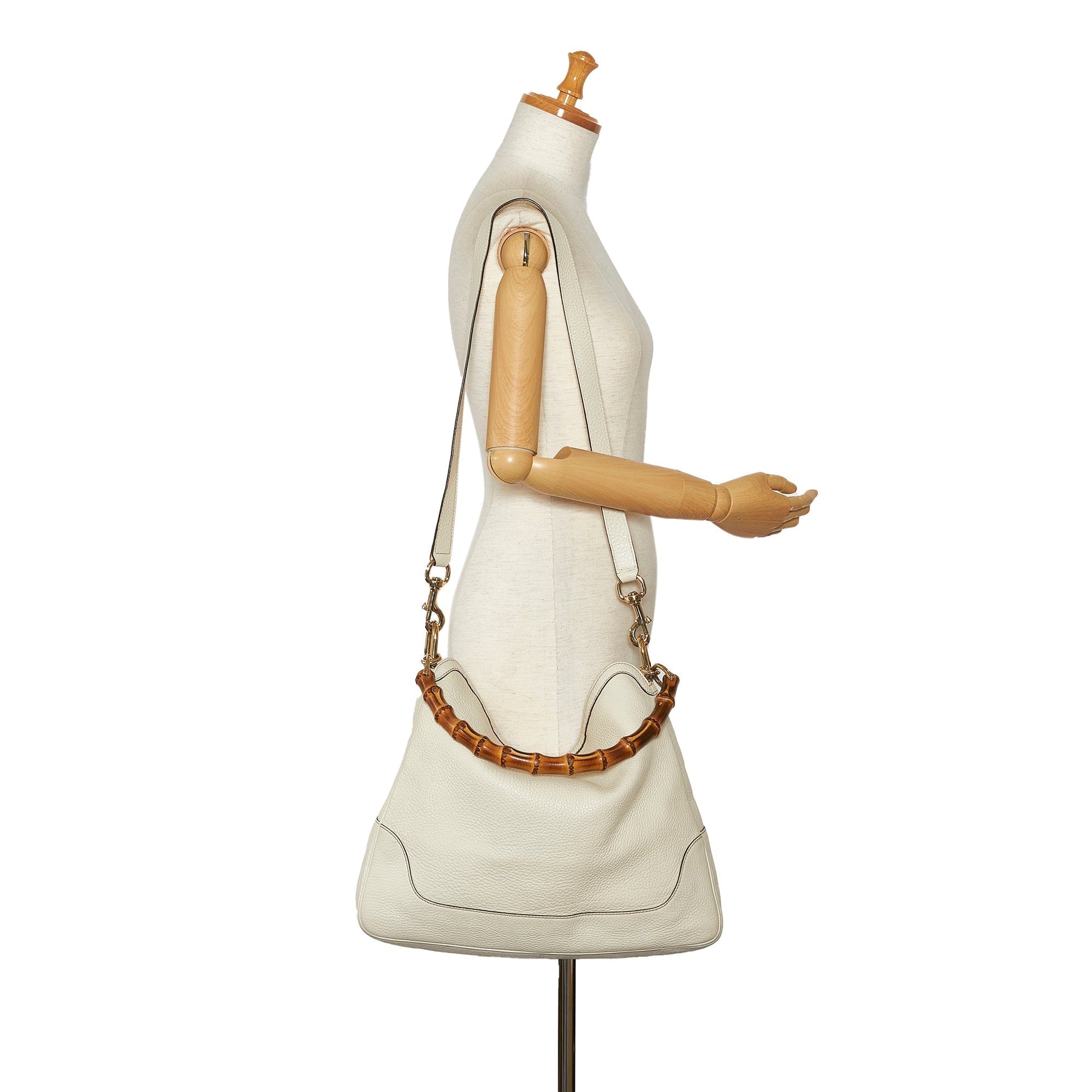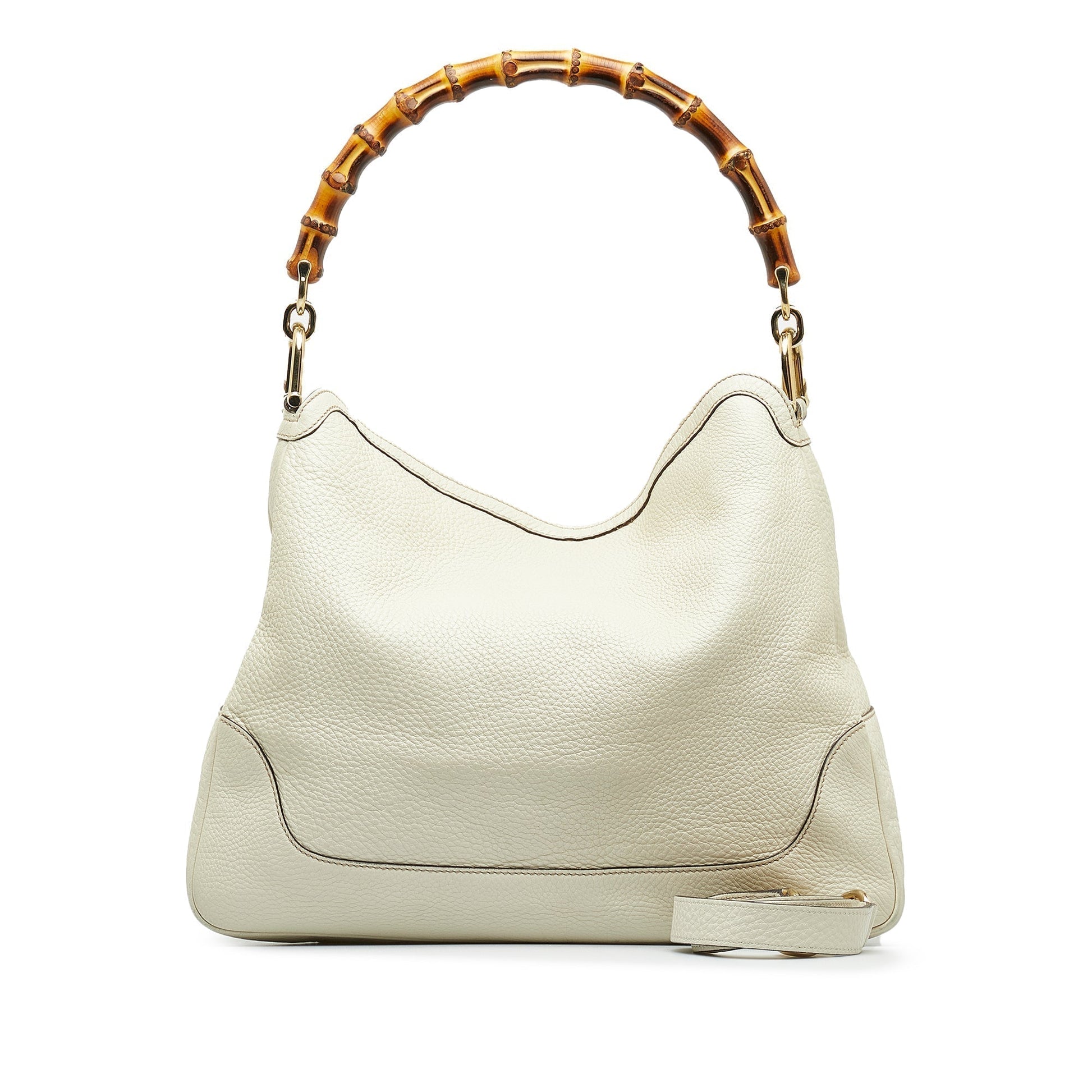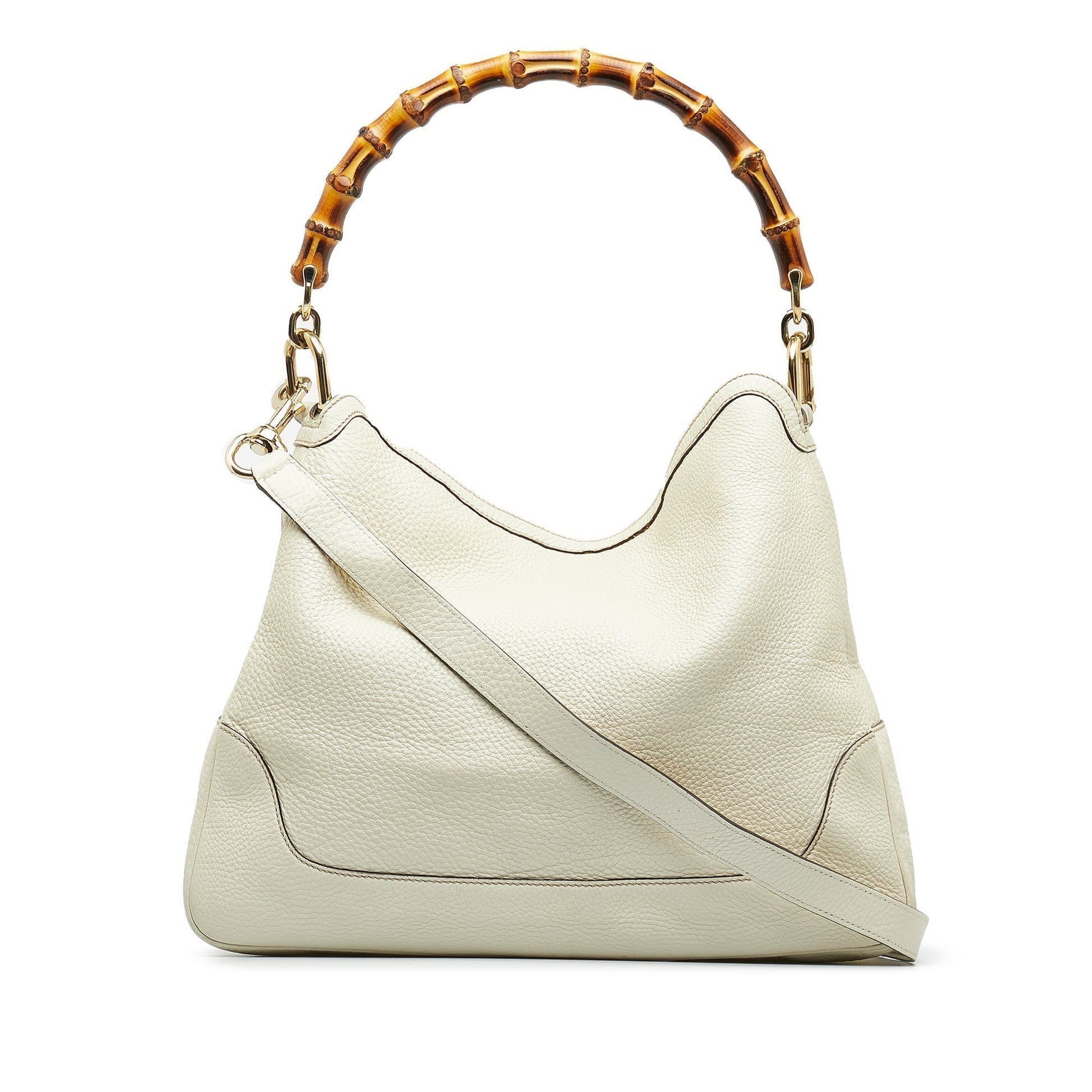 The Bamboo Diana features a leather body, a bamboo handle, a detachable strap, an open top, and interior zip and slip pockets.
