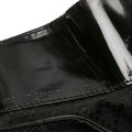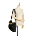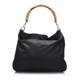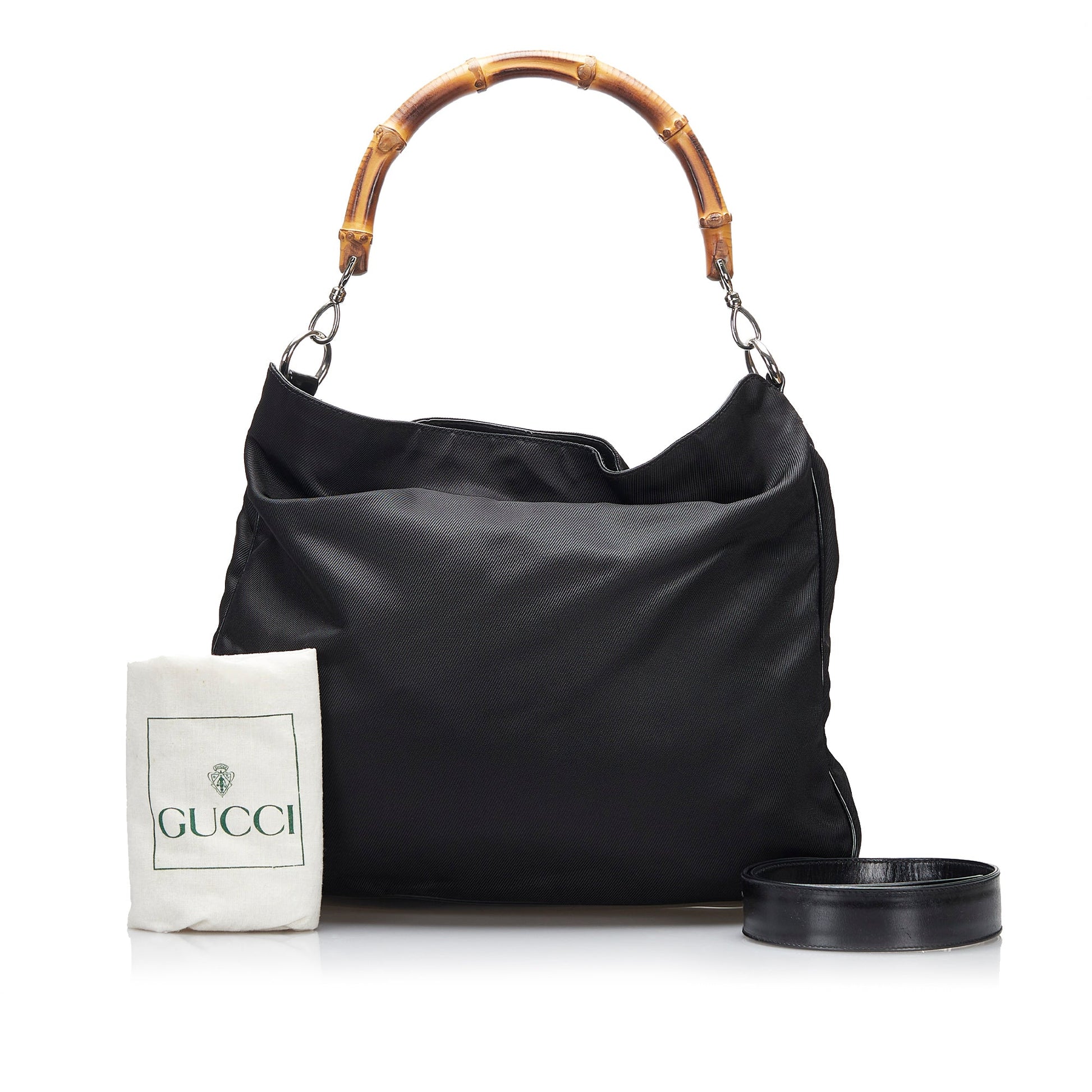 This satchel features a nylon body, a bamboo top handle, a flat leather strap, an open top with a magnetic snap closure, and an interior zip pocket. Comes with dust bag