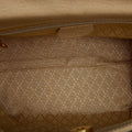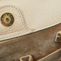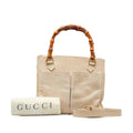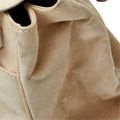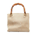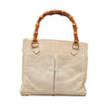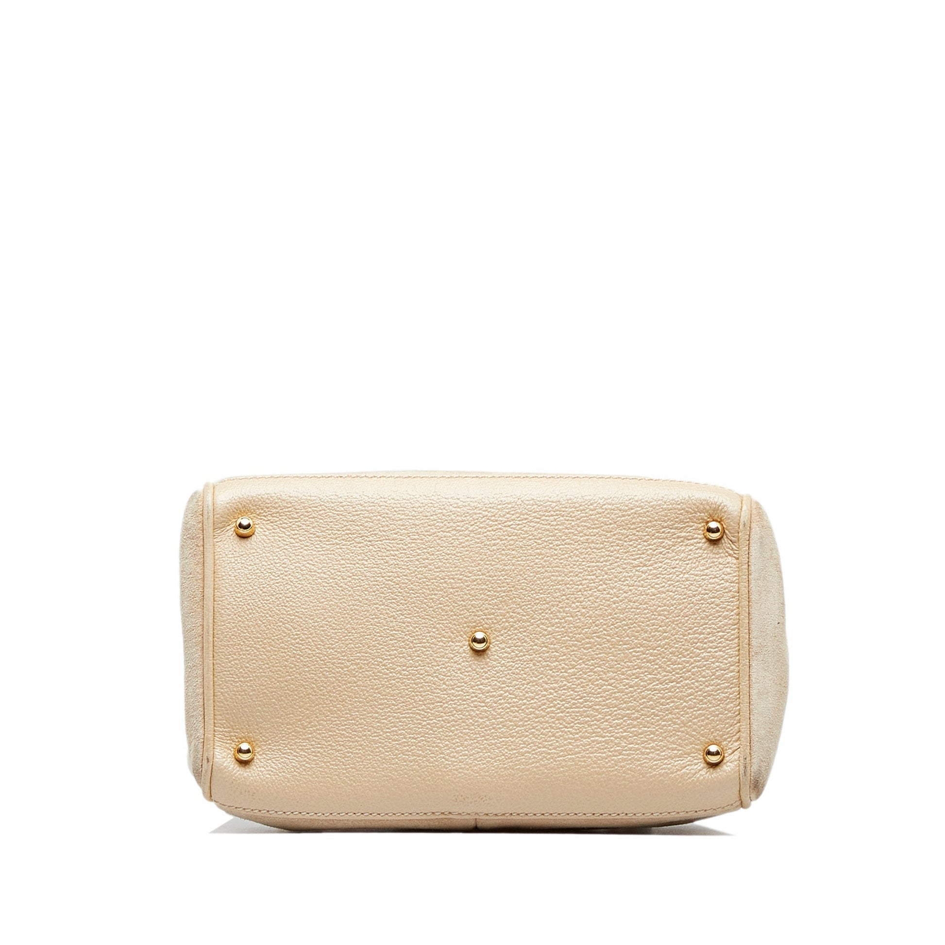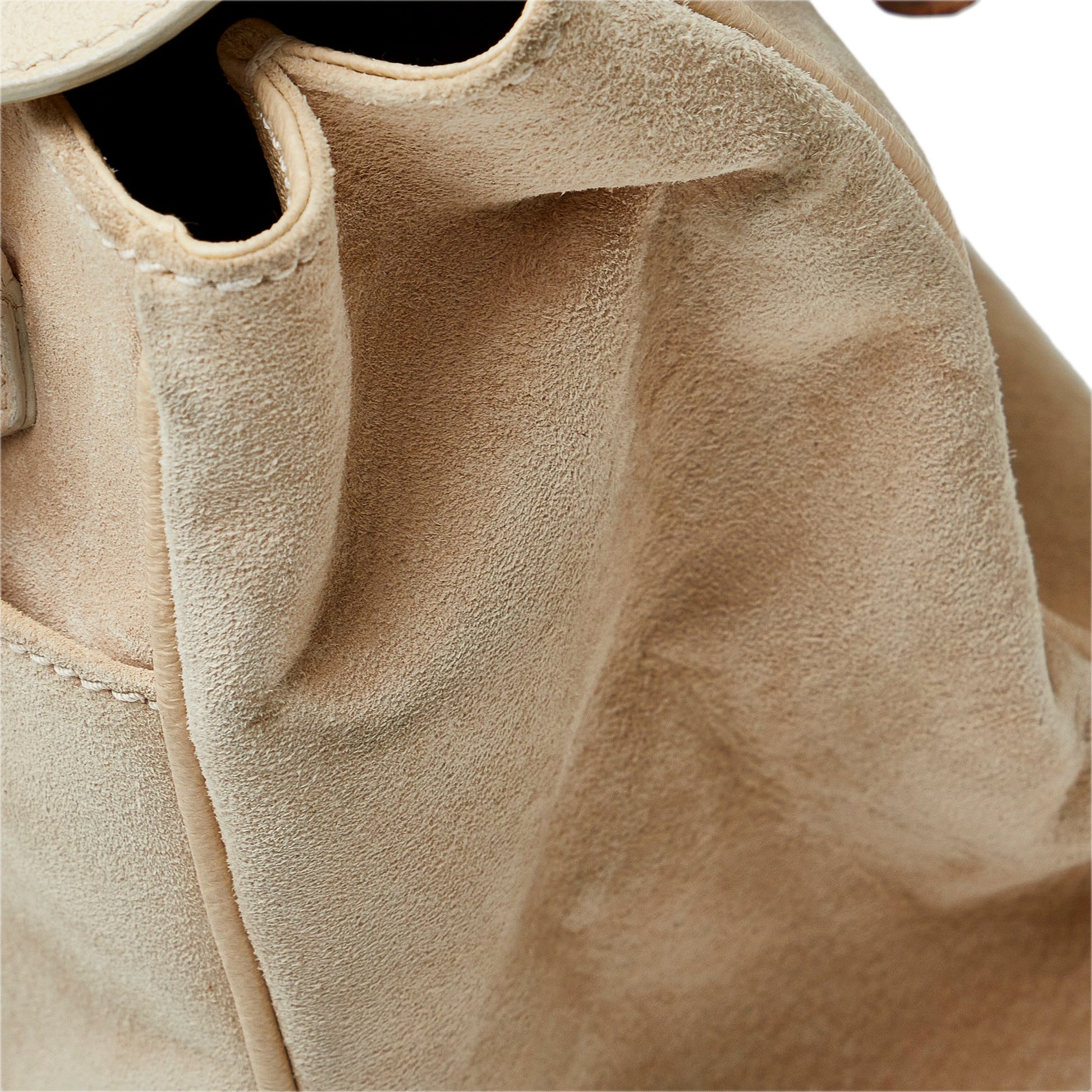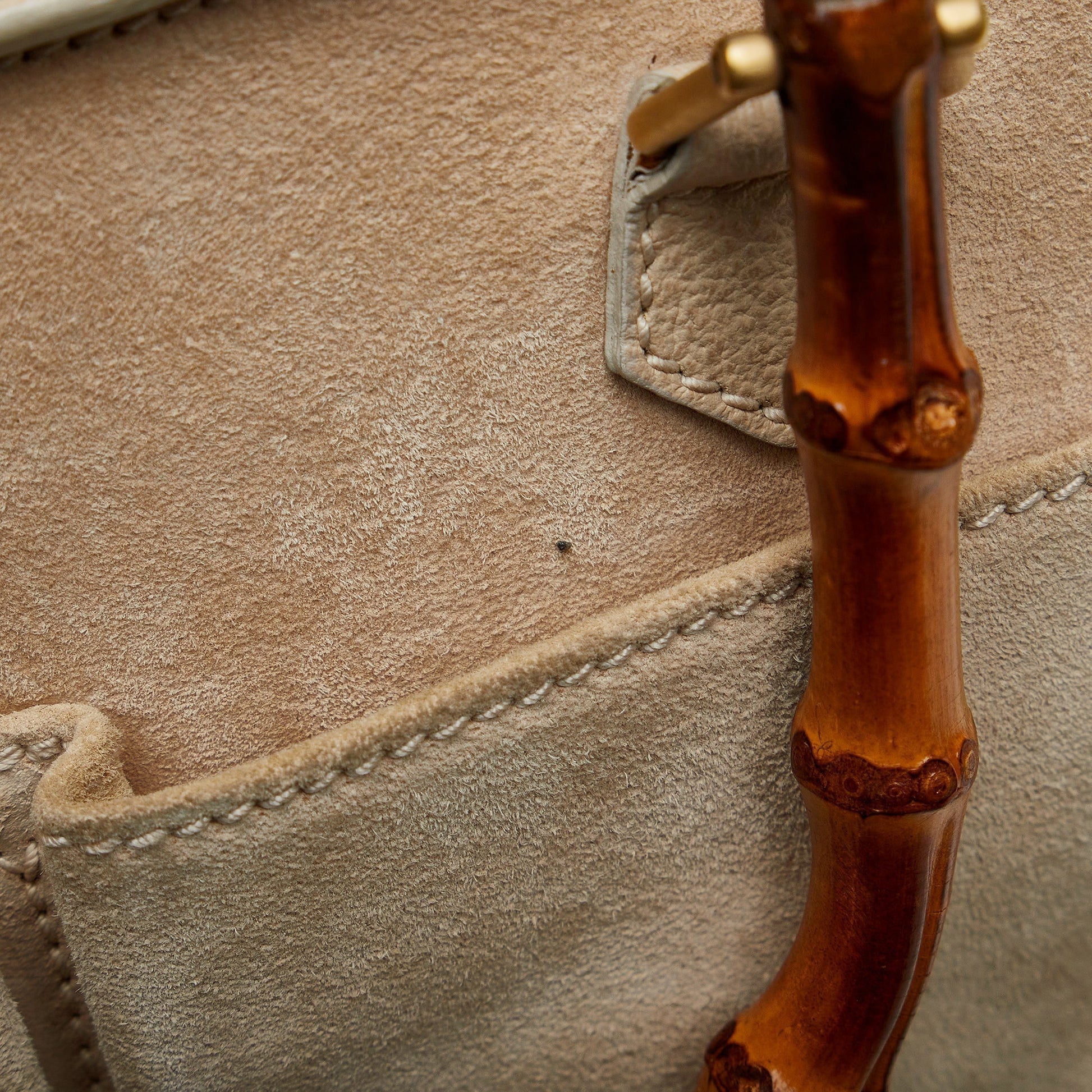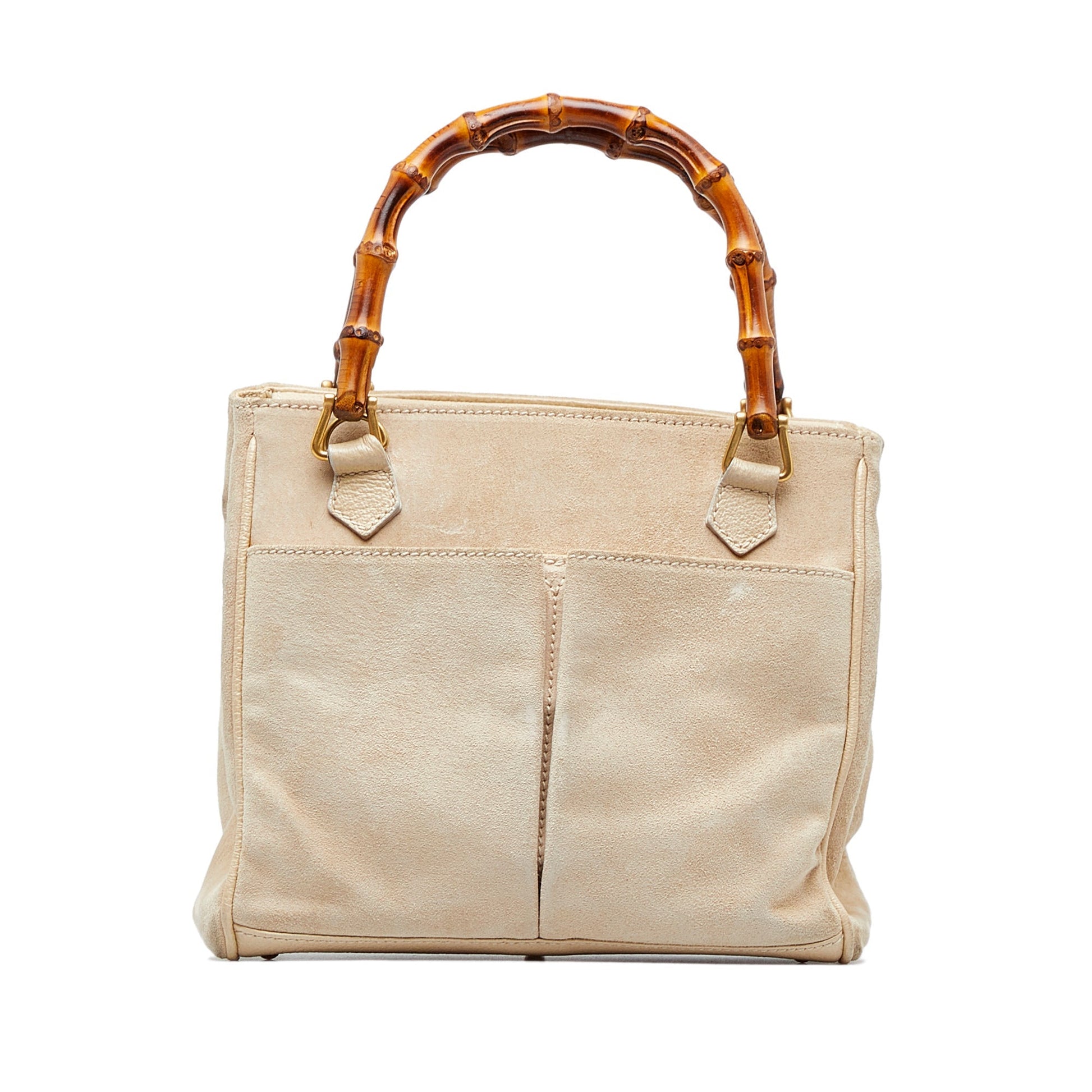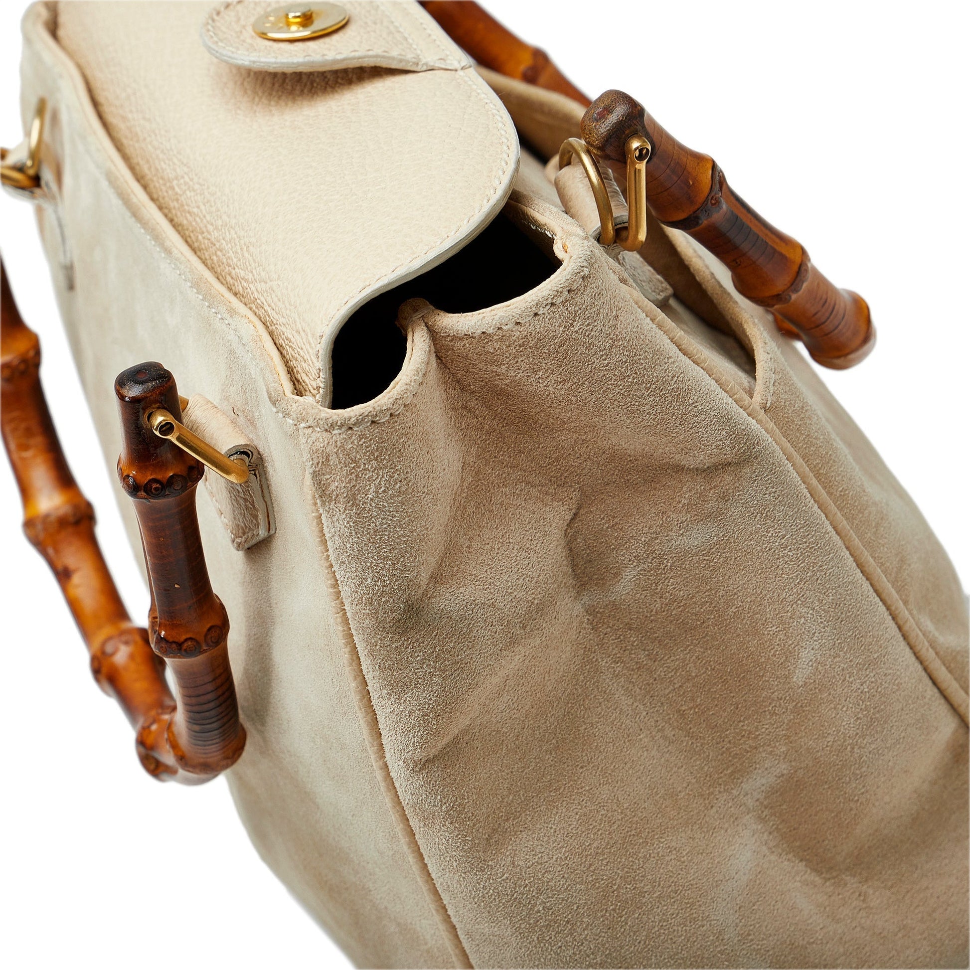 This satchel features a suede body, two exterior front slip pockets, bamboo top handles, a detachable flat leather strap, a magnetic snap closure, and an interior zip pocket. Comes with dust bag