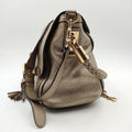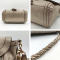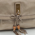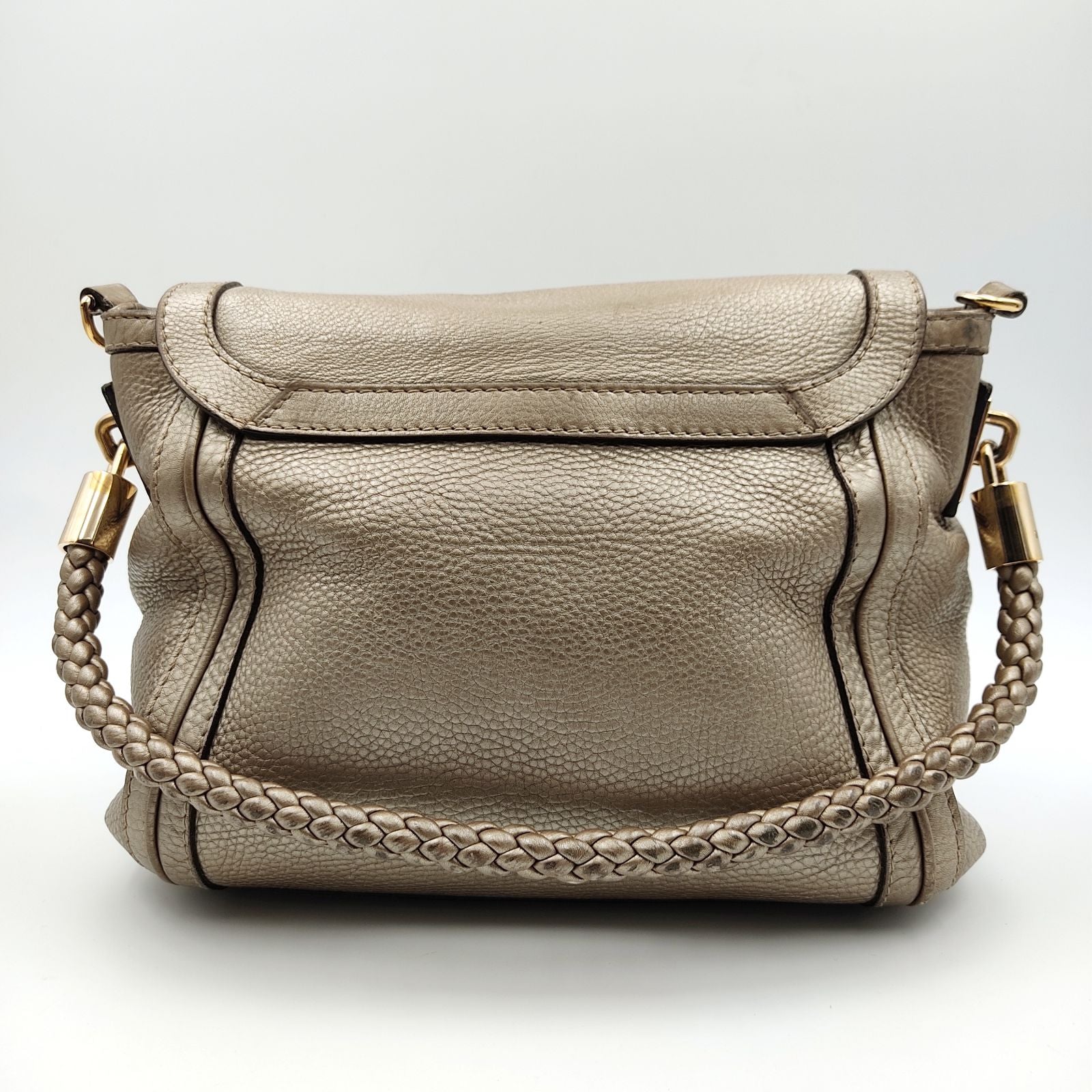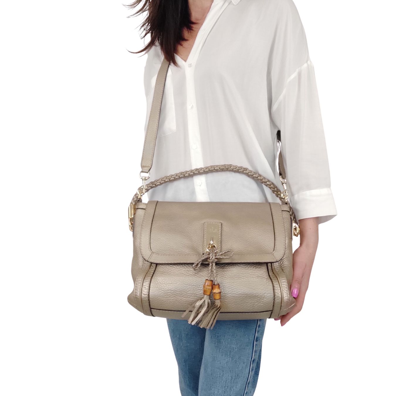 It can be by hand thanks to its short handle in woven leather, or more comfortably over the shoulder.