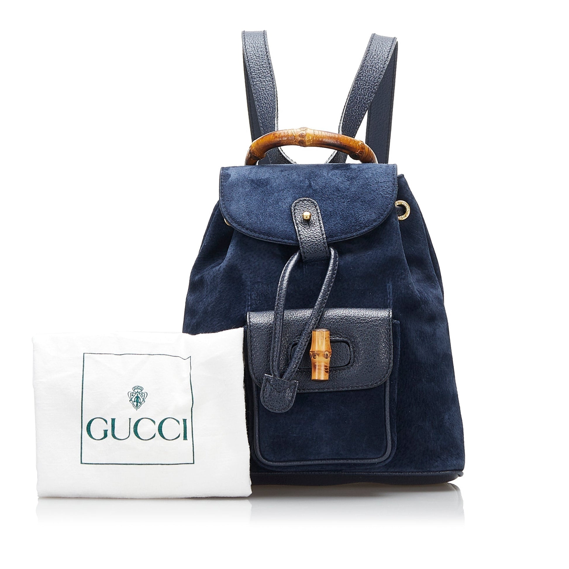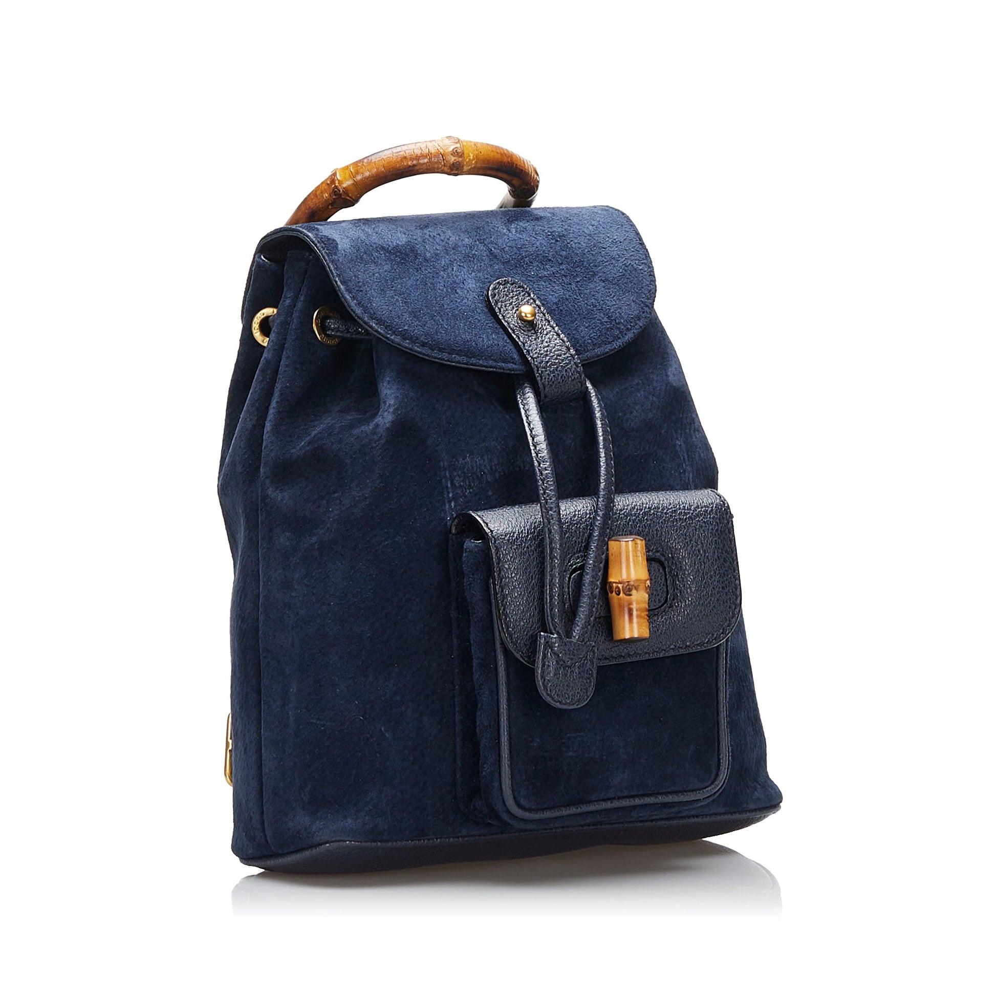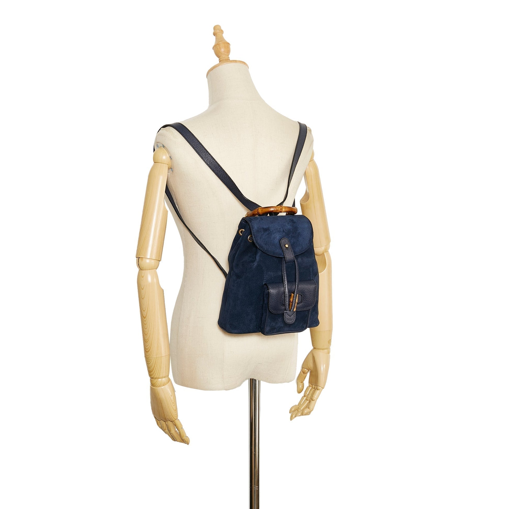 This backpack features a suede body, a bamboo top handle, adjustable flat leather back straps, a flap with pin tuck closure, a top drawstring closure, an exterior front flap pocket with bamboo turn lock closure, and an interior zip pocket. Comes with dust bag
