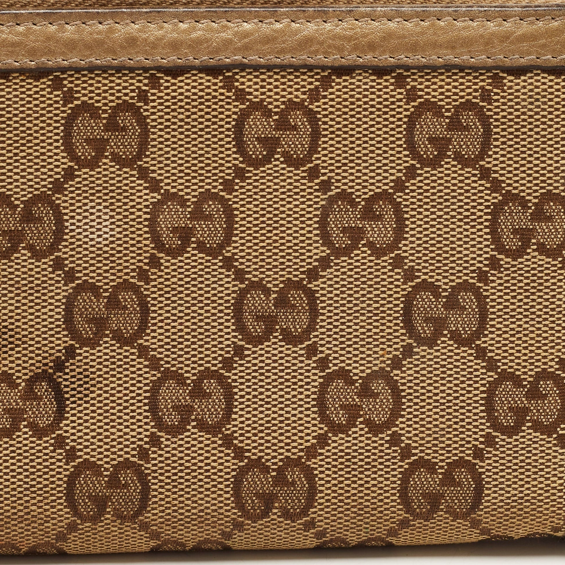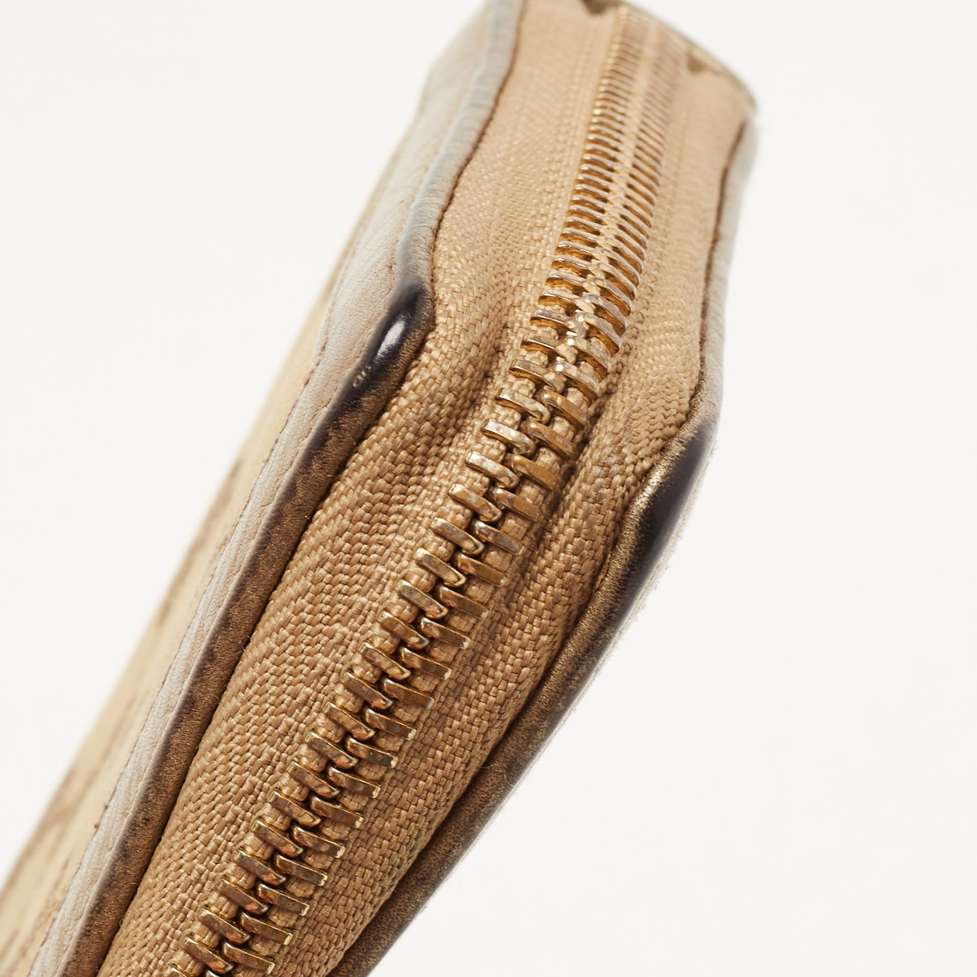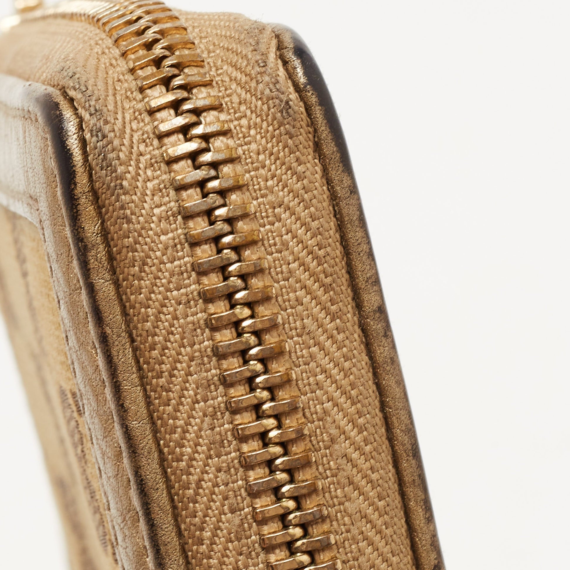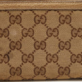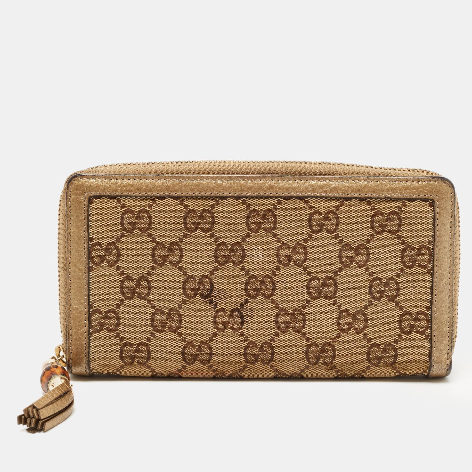 Keep your cards and currencies in place and organized with this zip around wallet from the House of Gucci. Created using beige GG canvas and leather this wallet features a Bamboo tassel motif gold tone hardware and a leather interior. This Gucci wallet is a great accessory to own.