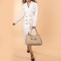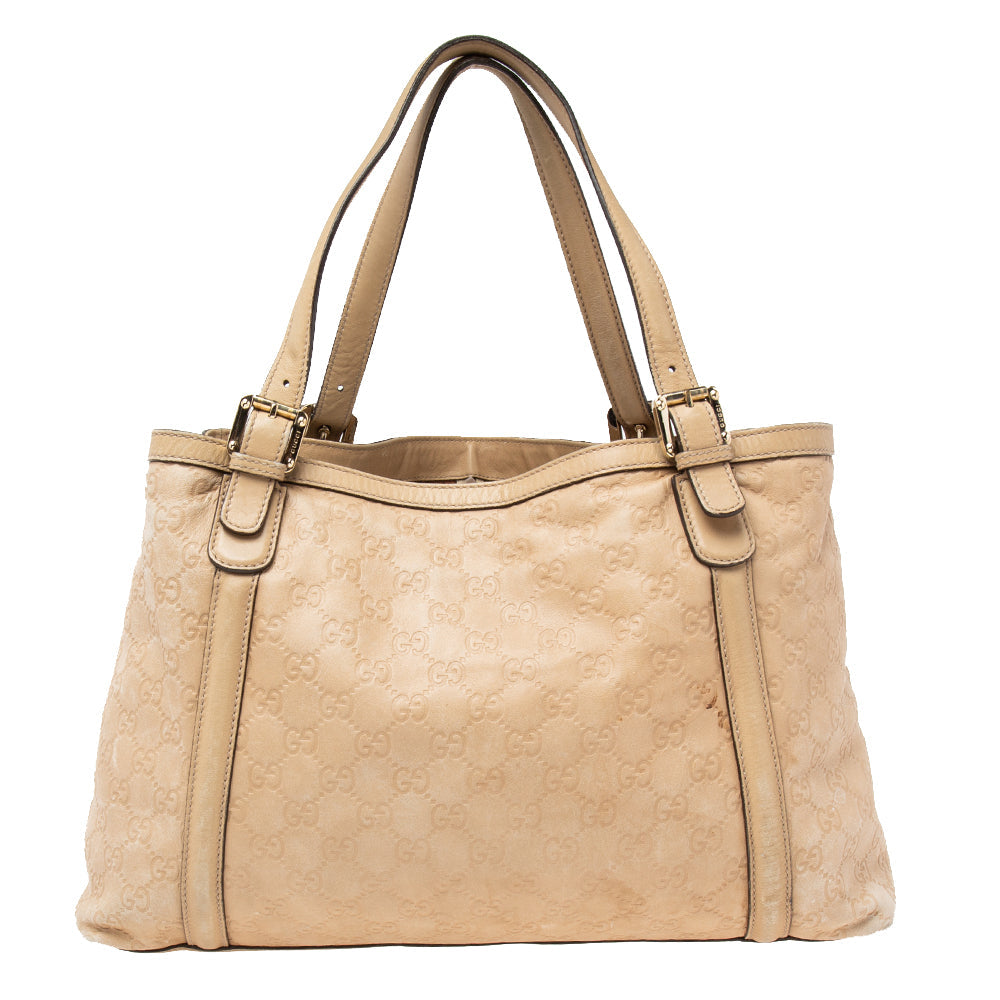 Gucci has become renowned for its rich heritage and classic styles. This gorgeous tote is made from beige leather and comes with dual top handles. It features a bold gold tone GG logo on the front. The fabric lined interior is secured with a snap closure and houses a zipped pocket for extra storage space. It is the perfect daytime bag to flaunt