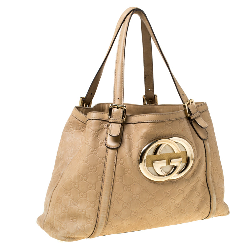The iconic Gucci label has become renowned for its rich heritage and classic styles. This tote is made from beige leather and comes with dual top handles. It features a bold gold tone GG logo embellished at the front. The fabric lined interior is secured with a snap closure and houses a zipped pocket with a Gucci label.