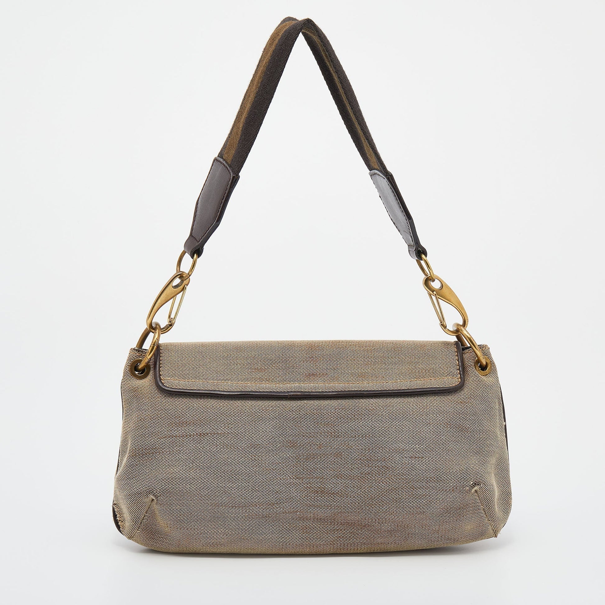 Elegance meets luxury in this shoulder bag from the House of Gucci. It is created using beige brown canvas and leather and has a roomy fabric lined interior gold tone hardware and a 20 cm handle drop. This Gucci bag will elevate the look of your outfit immediately