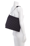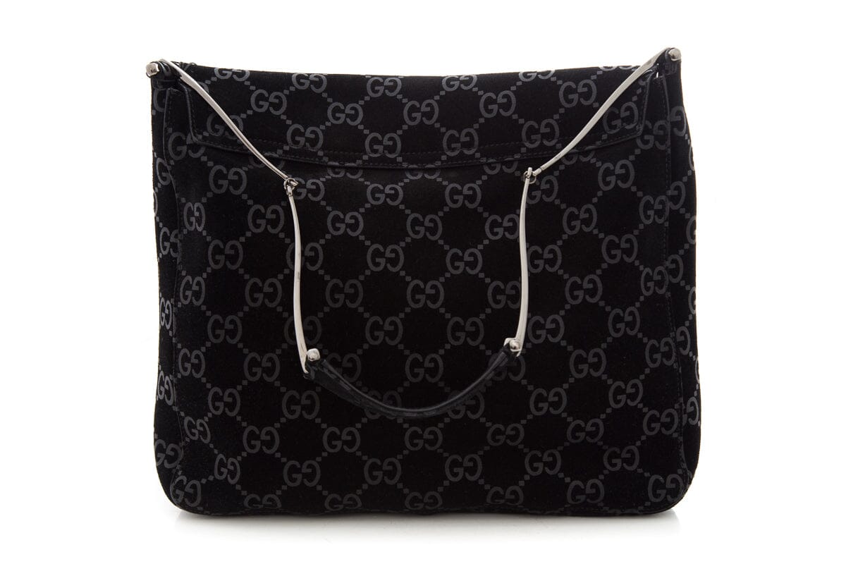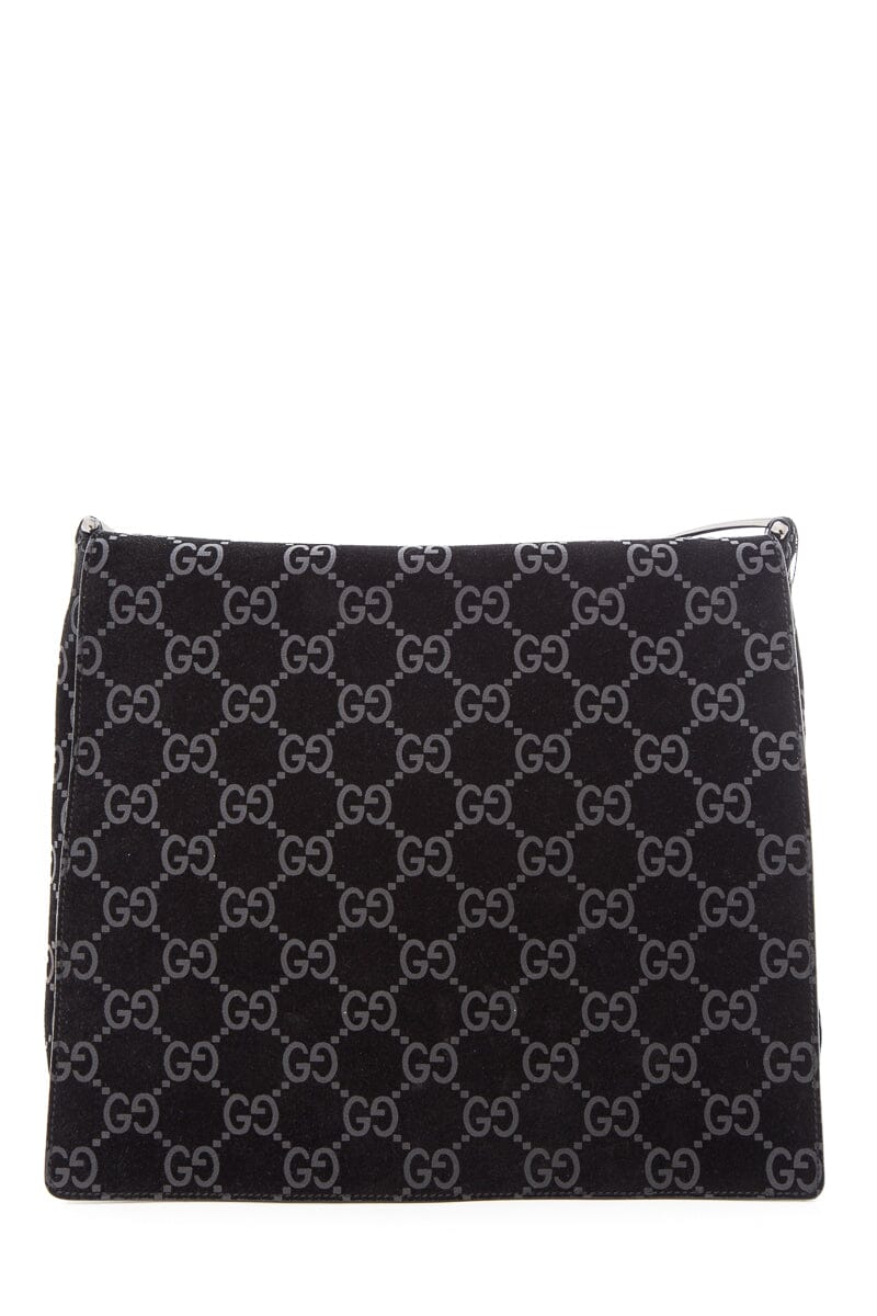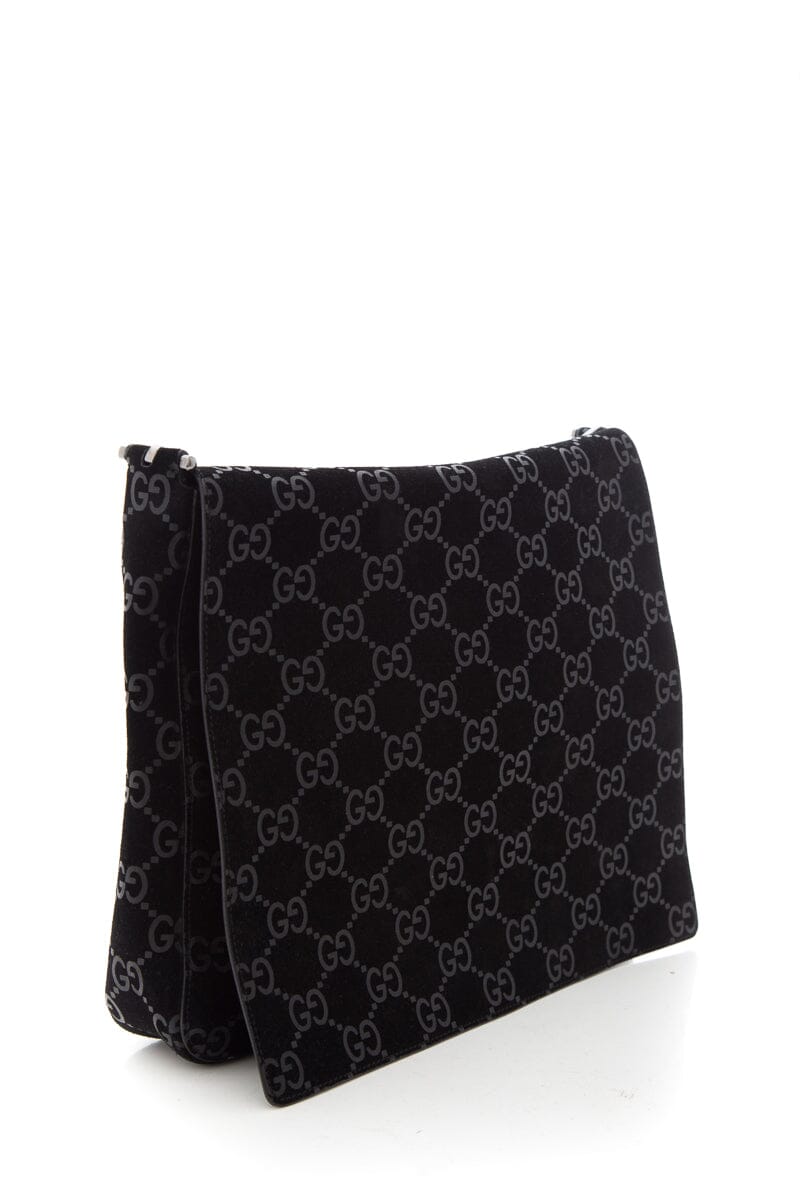 Gucci Black Monogram Suede Handbag with Metal Handle. This item is in very good condition.