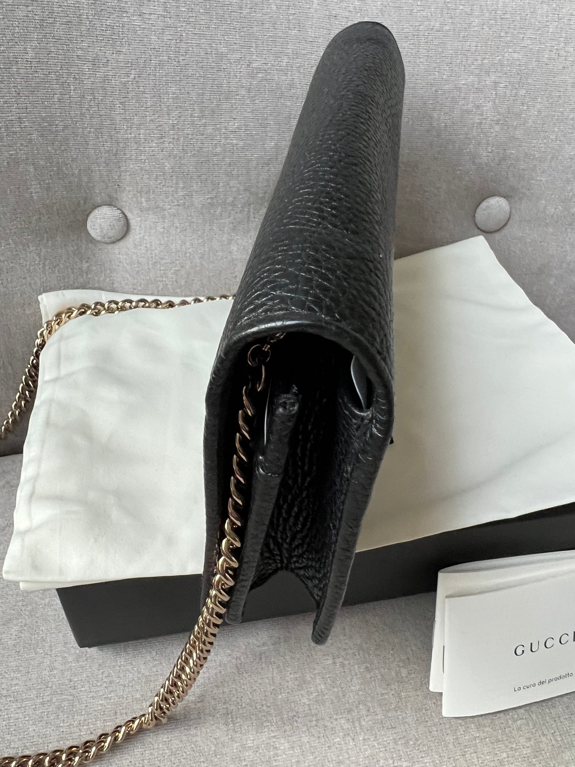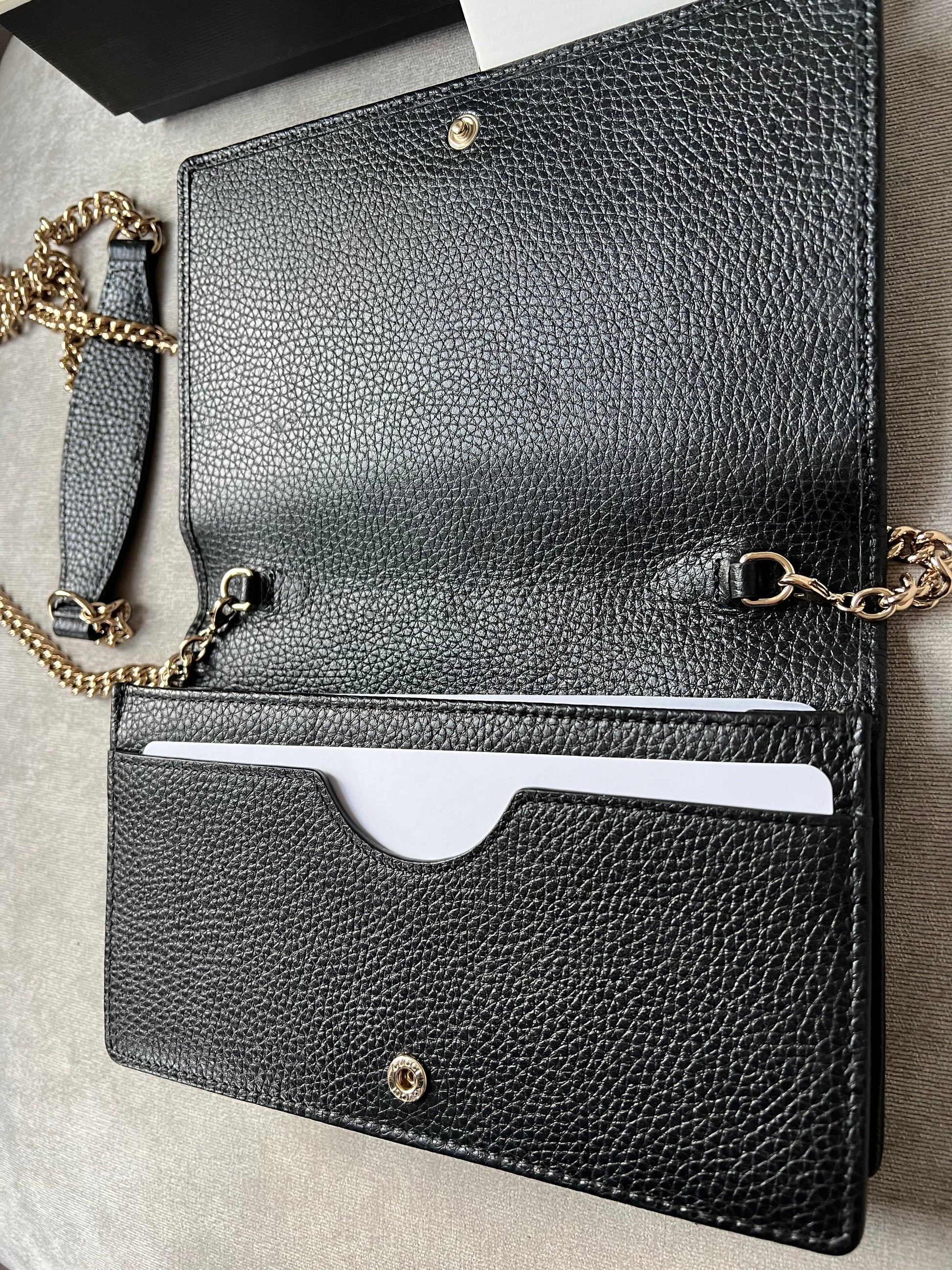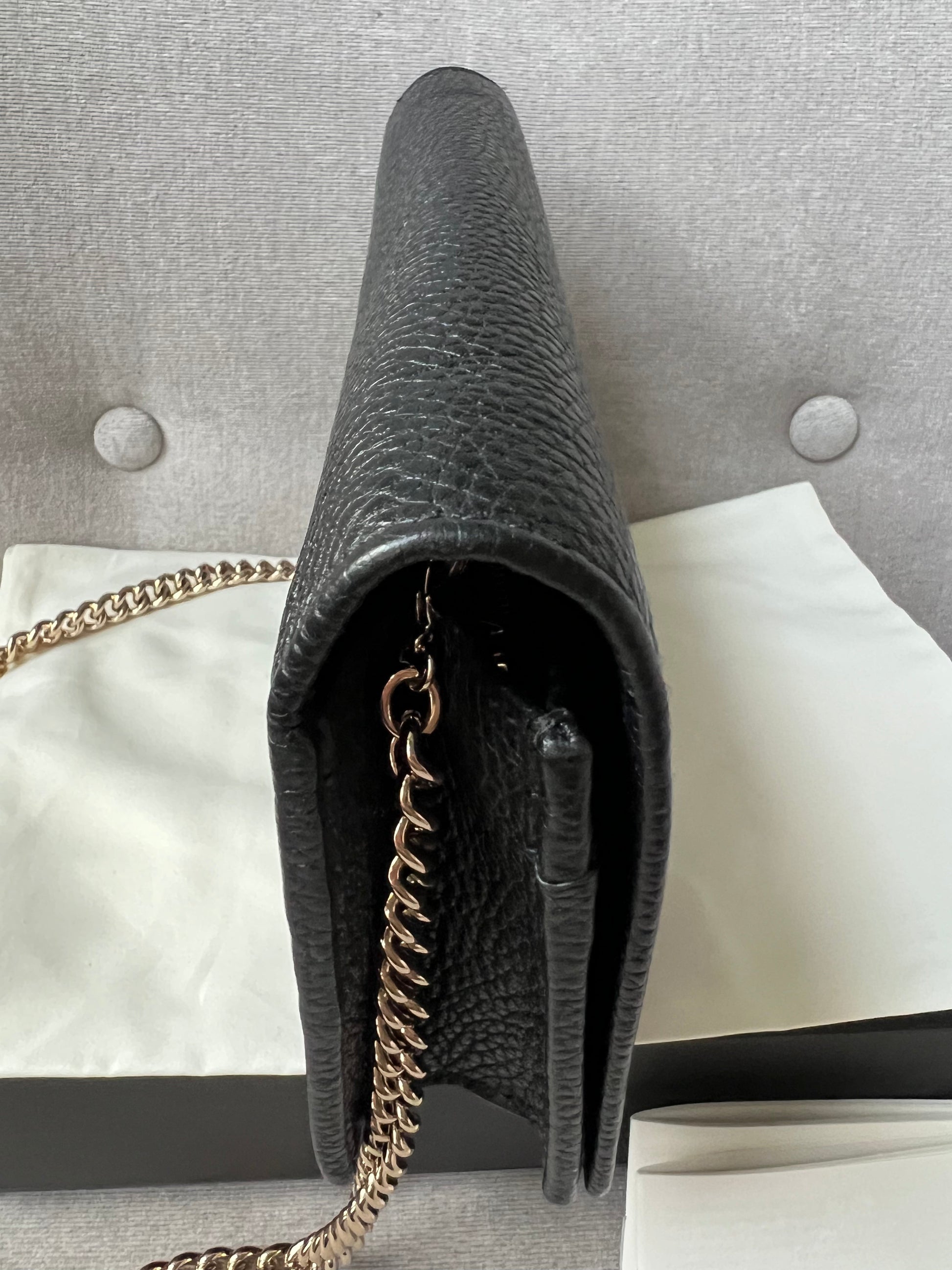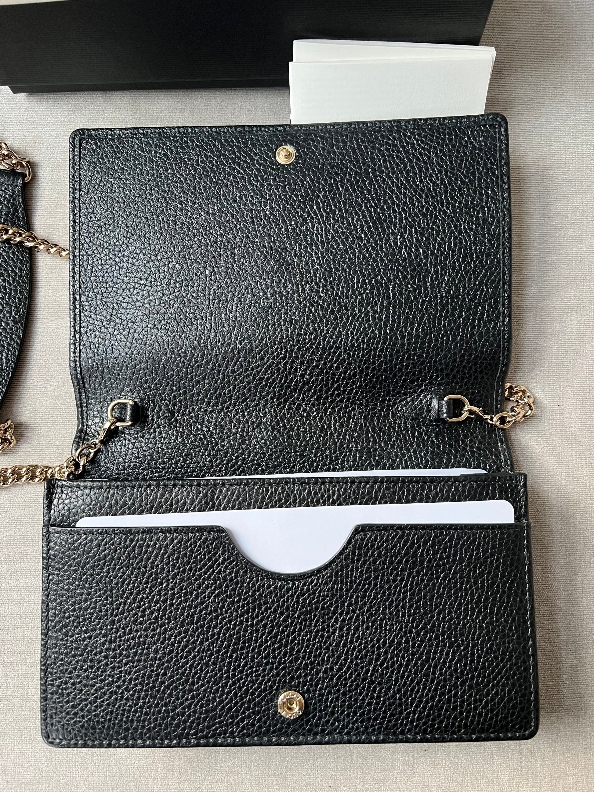 Gucci Soho Chain wallet in Black grained calfskin with gold hardware. Flap/popper closure featuring GG logo. With a zipped inner section, there is plenty of room for coins, cards and bills. Chain strap is detachable. Six credit card slots, a flat pocket, a gusset pocket, a zipped coin purse and scallop feature front pocket.