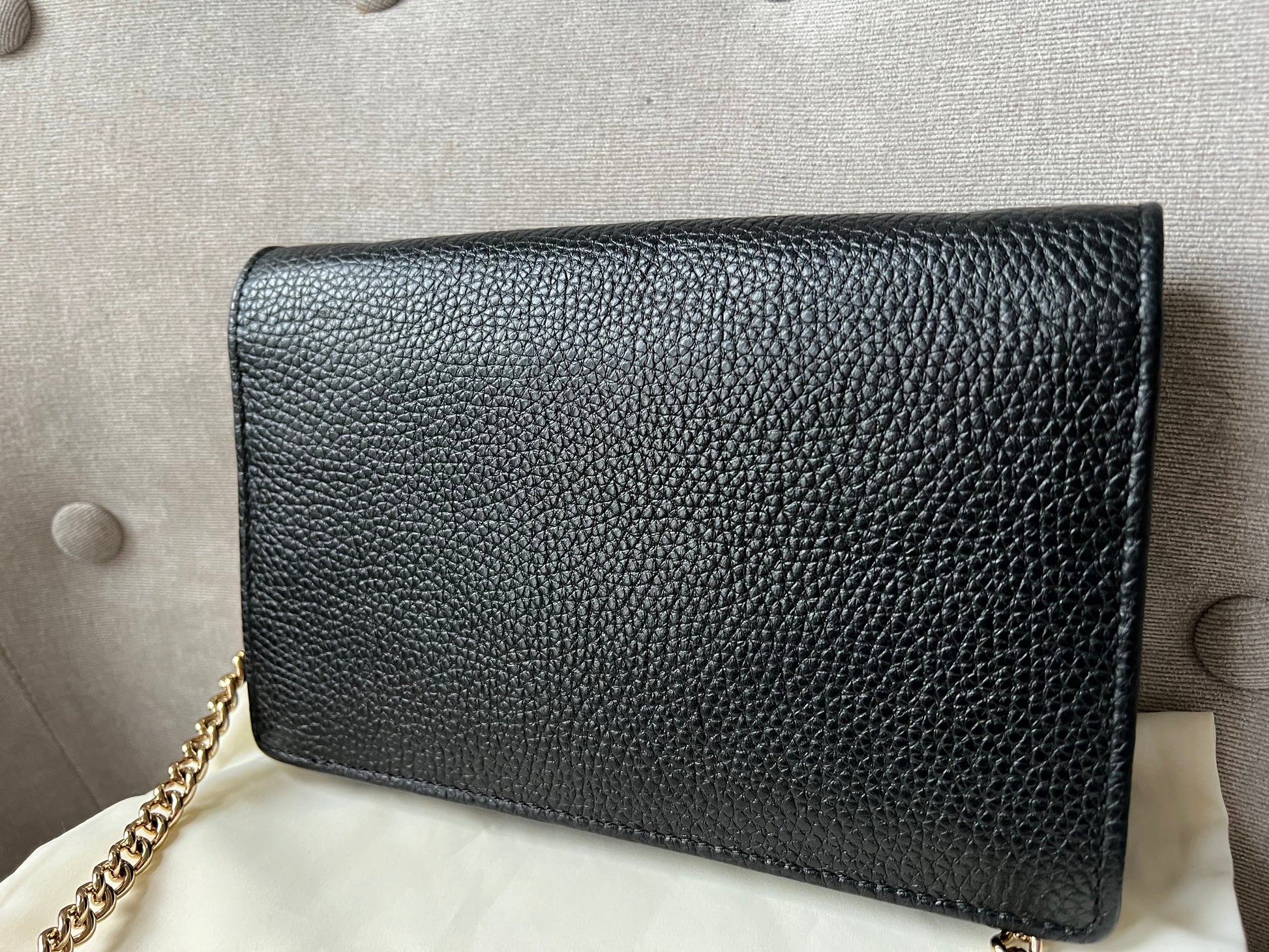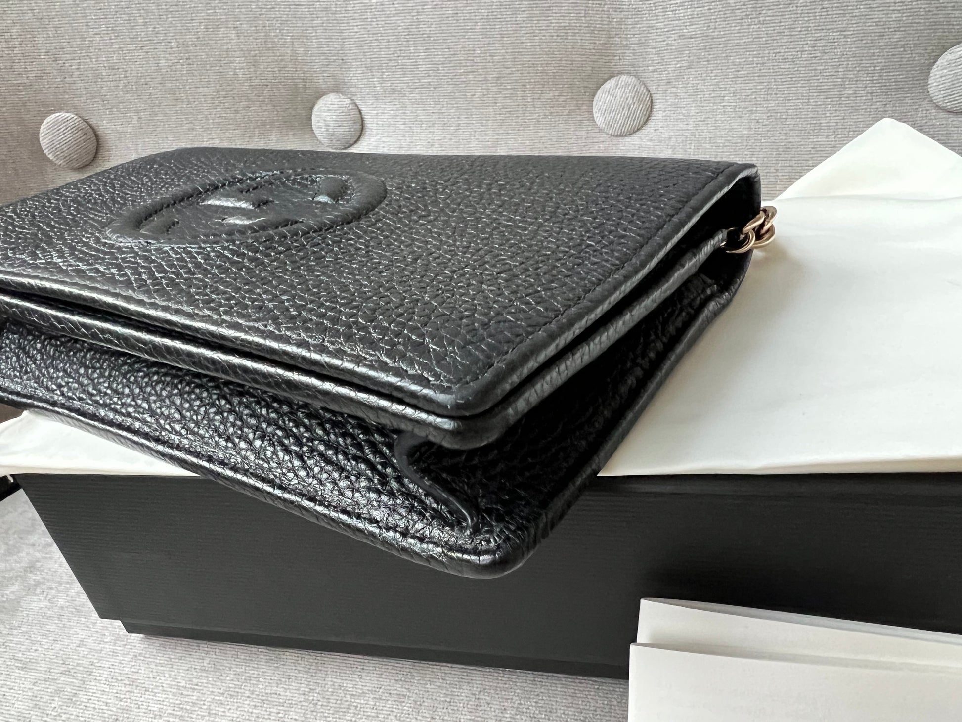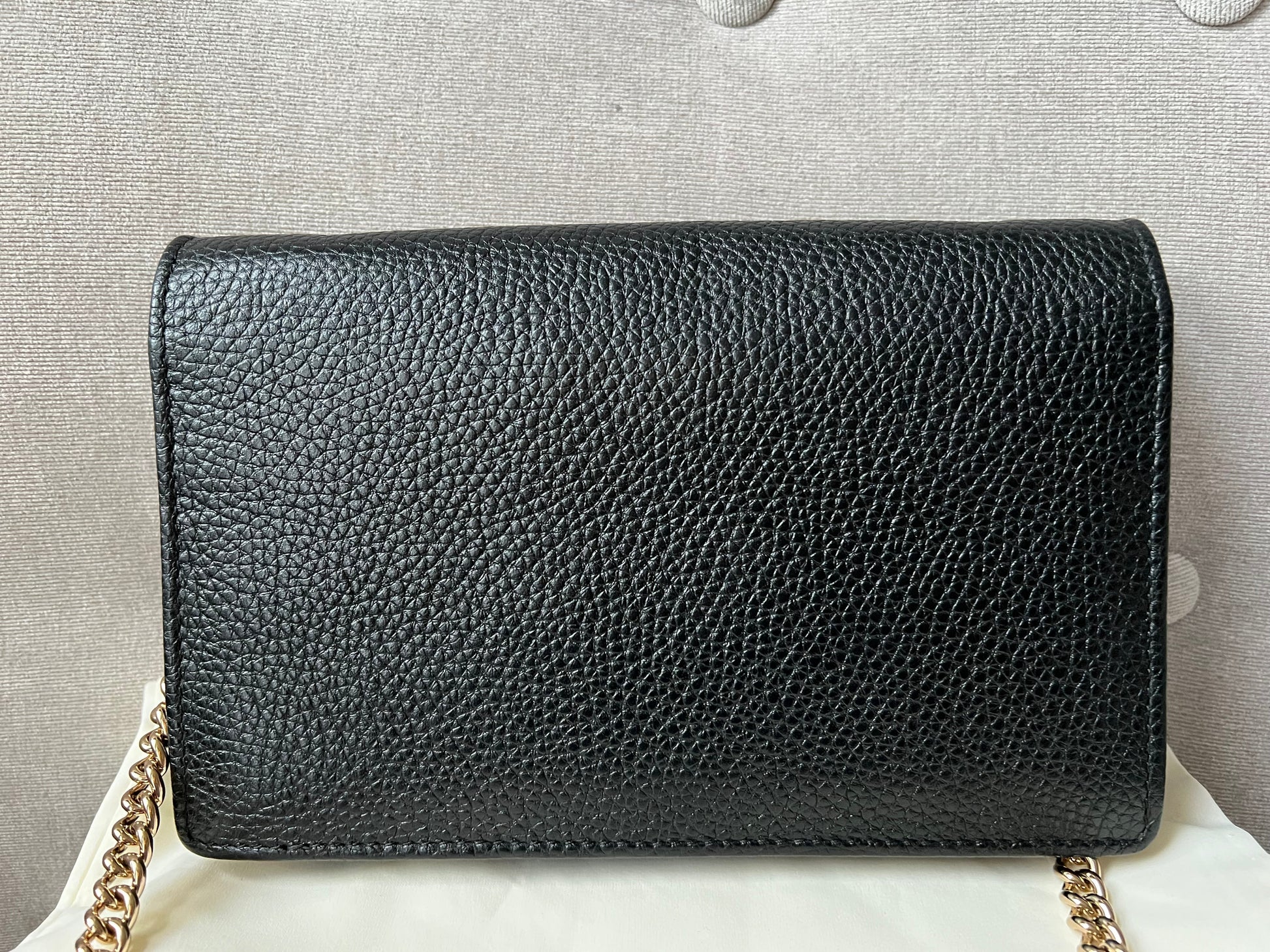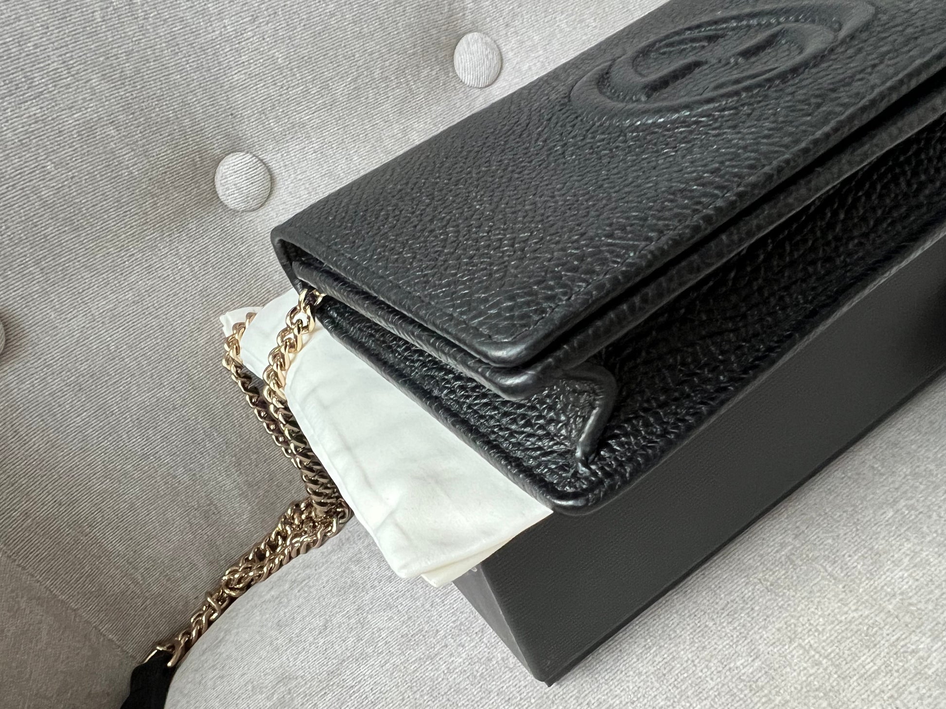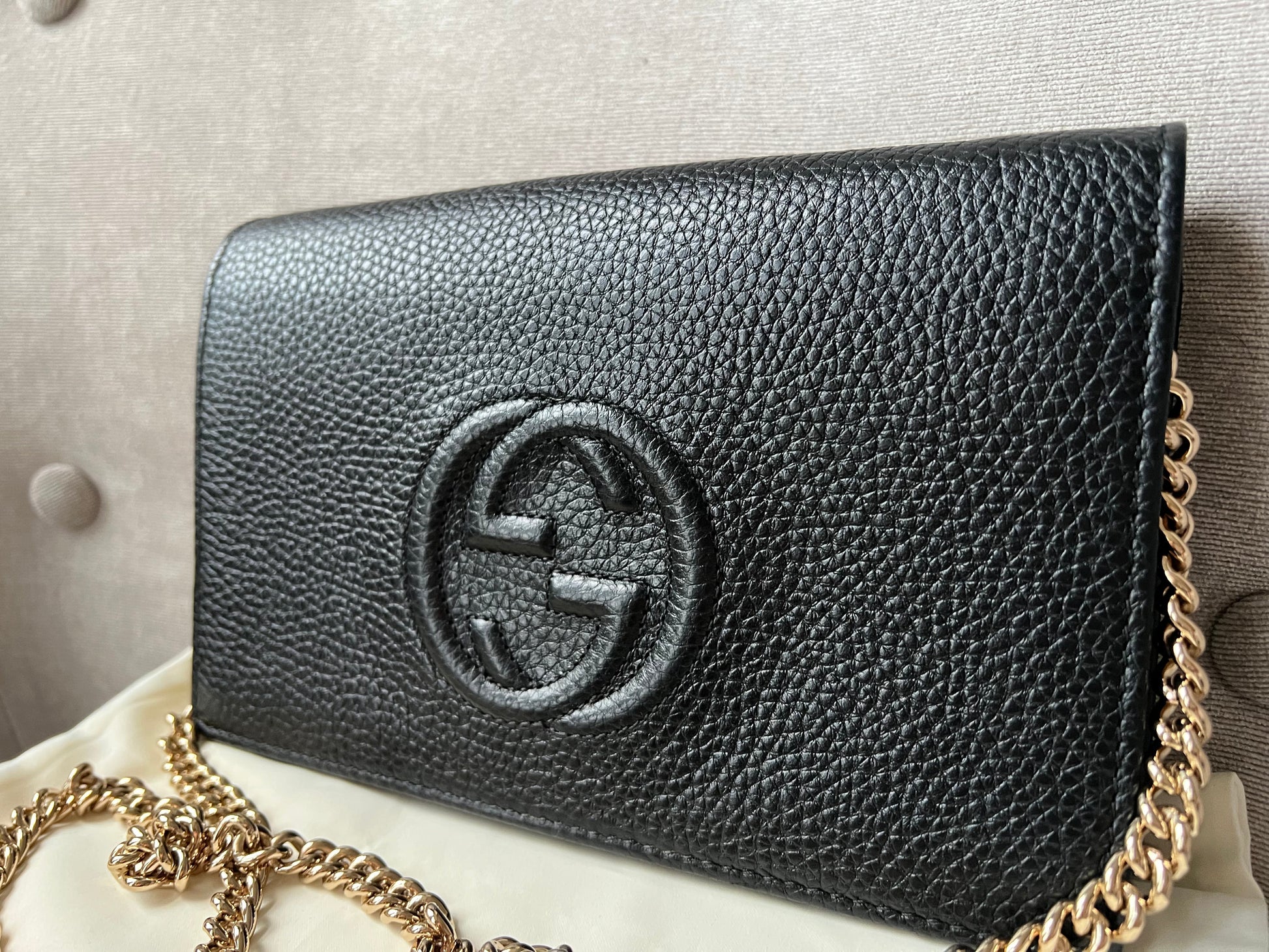 Gucci Soho Chain wallet in Black grained calfskin with gold hardware. Flap/popper closure featuring GG logo. With a zipped inner section, there is plenty of room for coins, cards and bills. Chain strap is detachable. Six credit card slots, a flat pocket, a gusset pocket, a zipped coin purse and scallop feature front pocket.