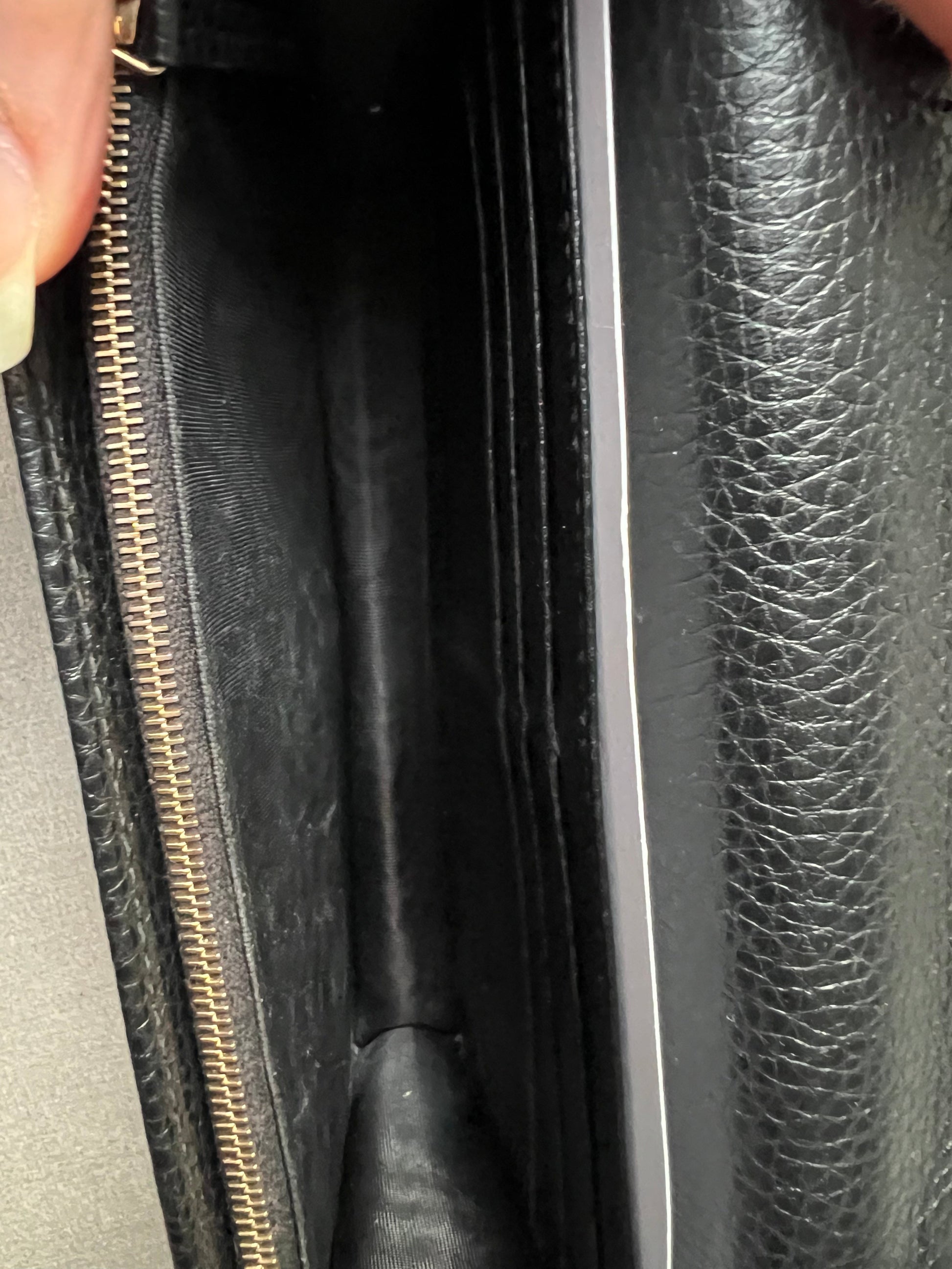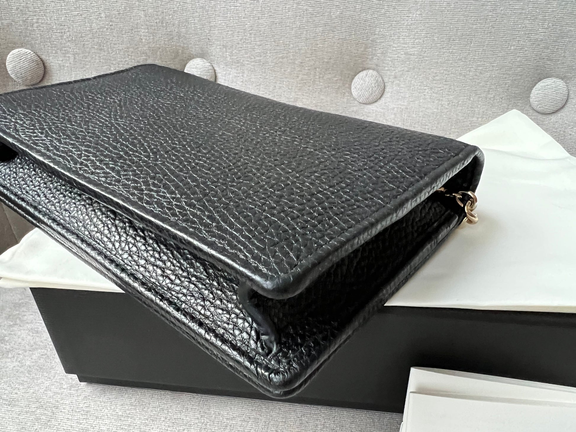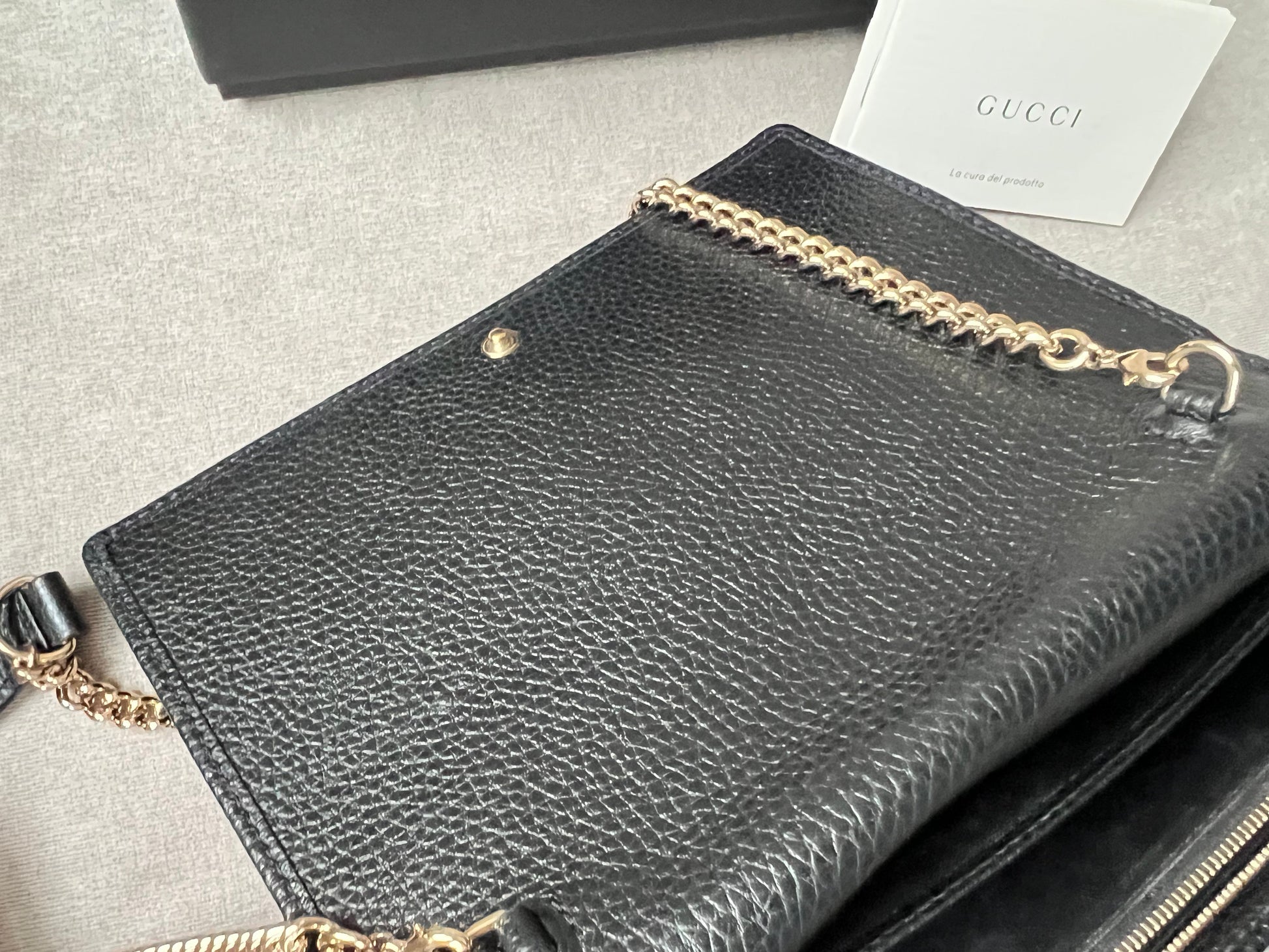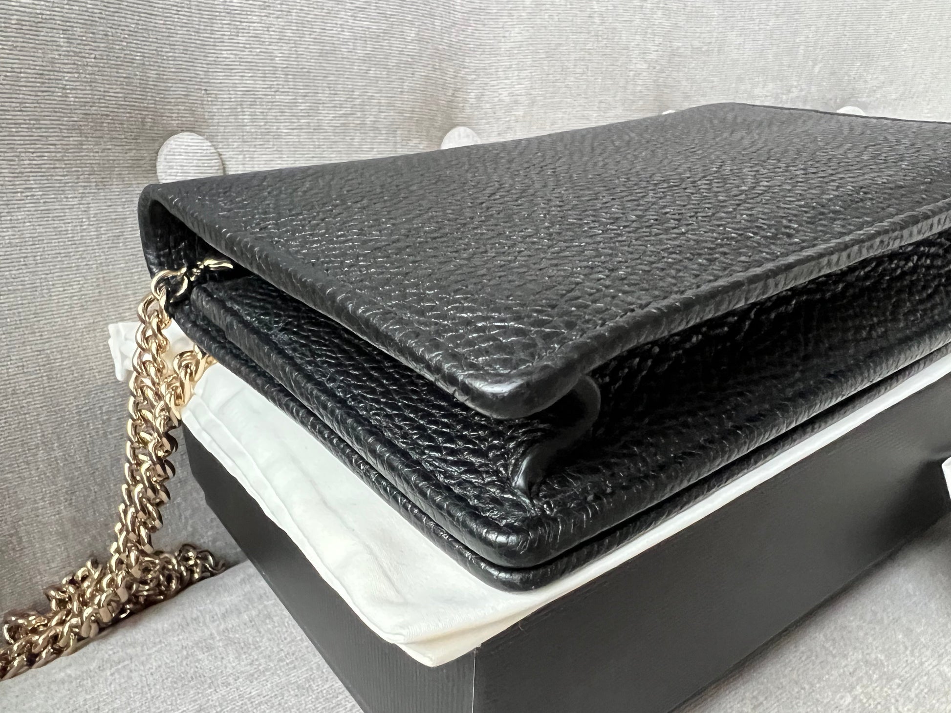 Gucci Soho Chain wallet in Black grained calfskin with gold hardware. Flap/popper closure featuring GG logo. With a zipped inner section, there is plenty of room for coins, cards and bills. Chain strap is detachable. Six credit card slots, a flat pocket, a gusset pocket, a zipped coin purse and scallop feature front pocket.