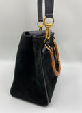 The cutest vintage black suede Gucci crossbody tote with the iconic Gucci bamboo handles. The base is made from a textured leather with gold feet and the crossbody strap is in leather. Inside the bag is lined with a black lining and has a zipped pocket for valuables.