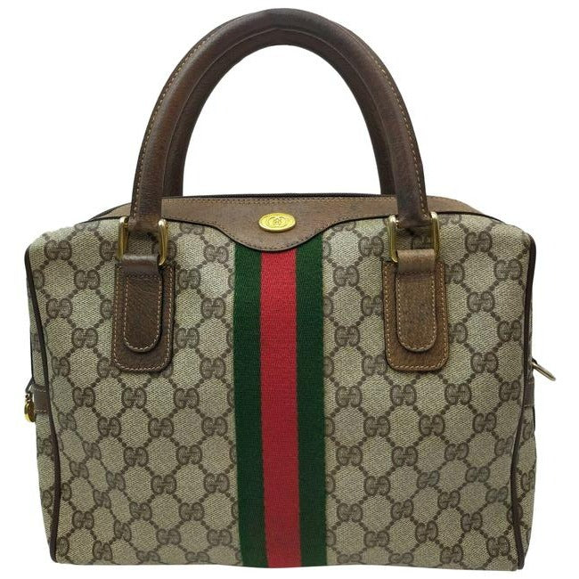 This is a fabulous, mid to late 20th century, vintage, Gucci Accessory Collection, two-way style Boston bag! It is made of brown Guccissima print coated canvas and brown leather with a wide, red and green center stripe on both sides. There are matching brown leather accents throughout the purse- on the straps that lead up to the handles, opening around the zip top closure, piping, and two, rolled handles. The hardware is gold tone. The piece is in mint vintage condition, so don't miss out!