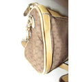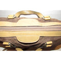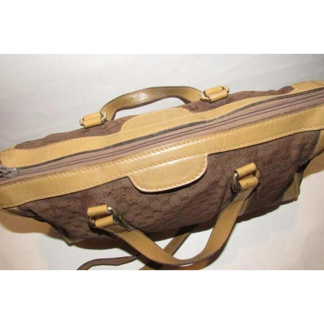 This is a fabulous, extra large size, top zip, 1960's mod, early GUCCI two handle satchel style purse! It is made of brown small G logo print canvas fabric and camel colored leather throughout the purse- on the piping, trim, opening around the zip top closure, and two handles.
