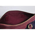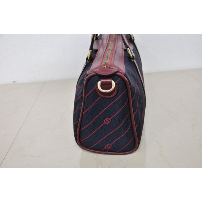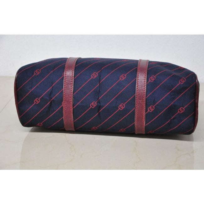 The bag has the diagonal lines and 'G' logo design throughout the navy fabric in a burgundy or dark red color. It has two handles and is called a 'Boston bag' or doctor's satchel. The purse has burgundy or dark red colored leather accents throughout! Inside, it has a burgundy fabric lining. It is a rare design and color from Gucci and has a classic look that will never go out of style.