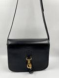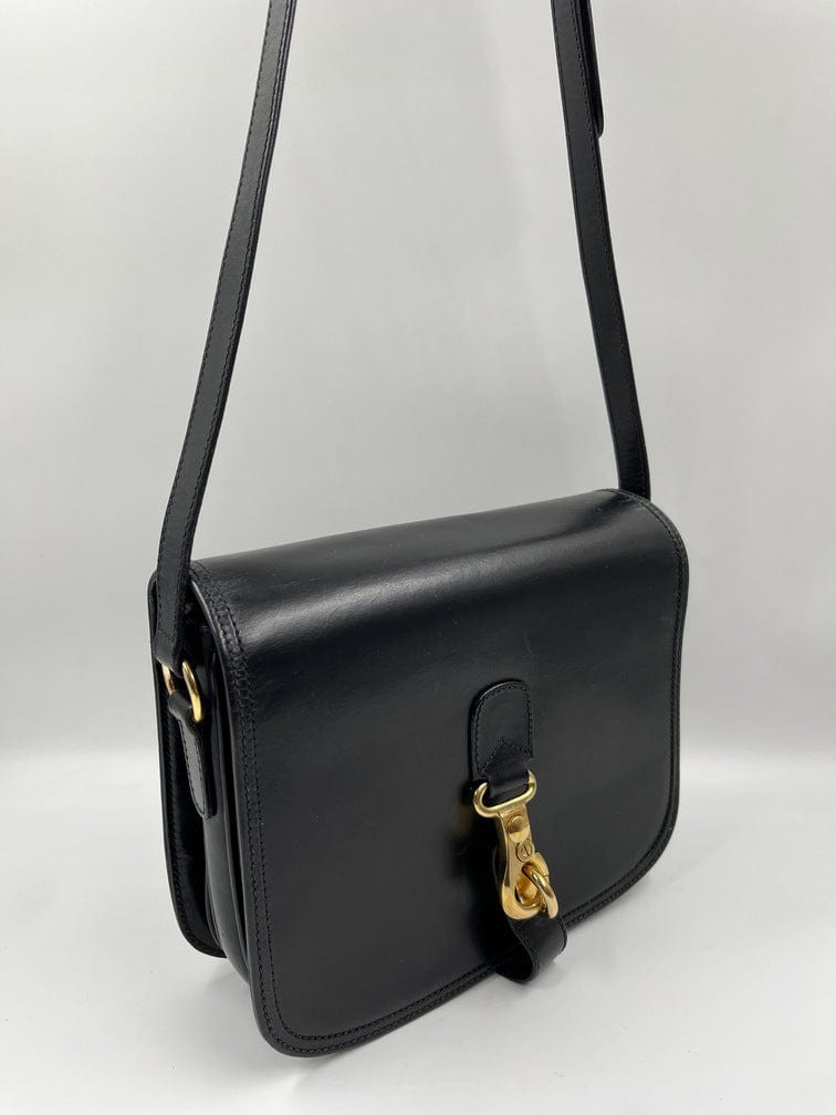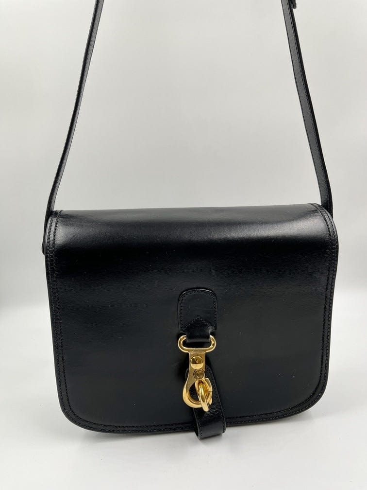 A mega chic black leather vintage Gucci crossbody bag with gold clip hardware detail.