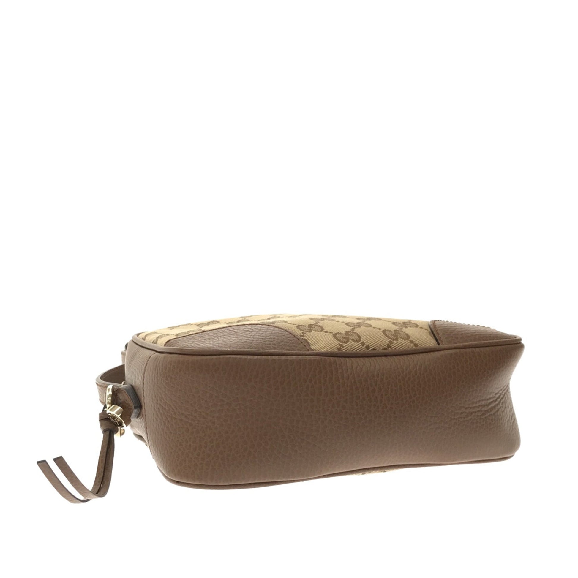 This Gucci Bree crossbody bag is made of light brown GG canvas. The Bag features brown leather trim, gold detailing, an adjustable flat leather shoulder strap, a zippered top opening, and zippered and slip pockets inside. The Bag can be across the body or loosely over the shoulder.