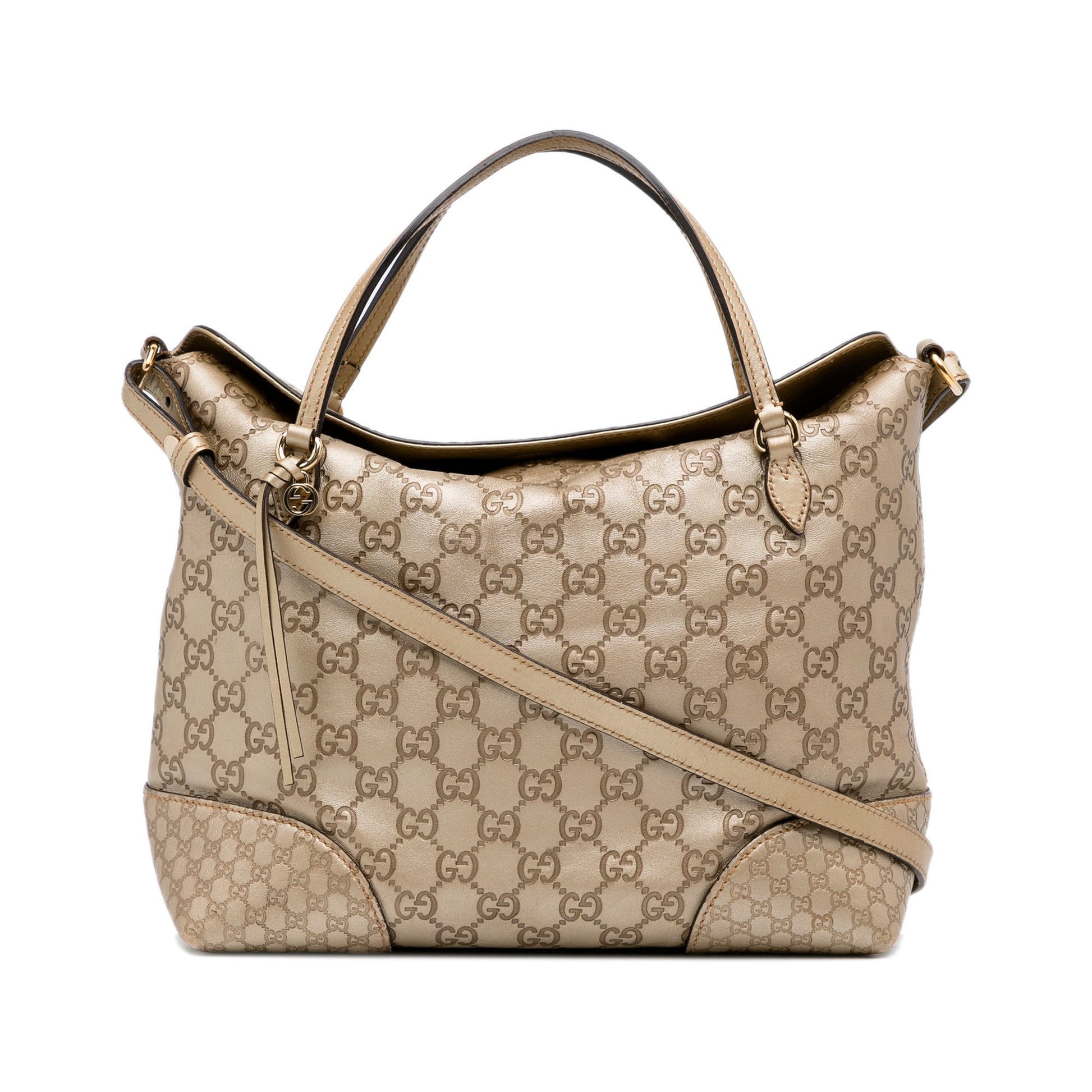 This shoulder bag from Gucci is made of light brown Guccissima leather. It is by the flat handles either in the hand, on the arm or on the shoulder. However, thanks to the detachable shoulder strap, it can also be comfortably crossbody. It offers zippered and slip pockets inside.