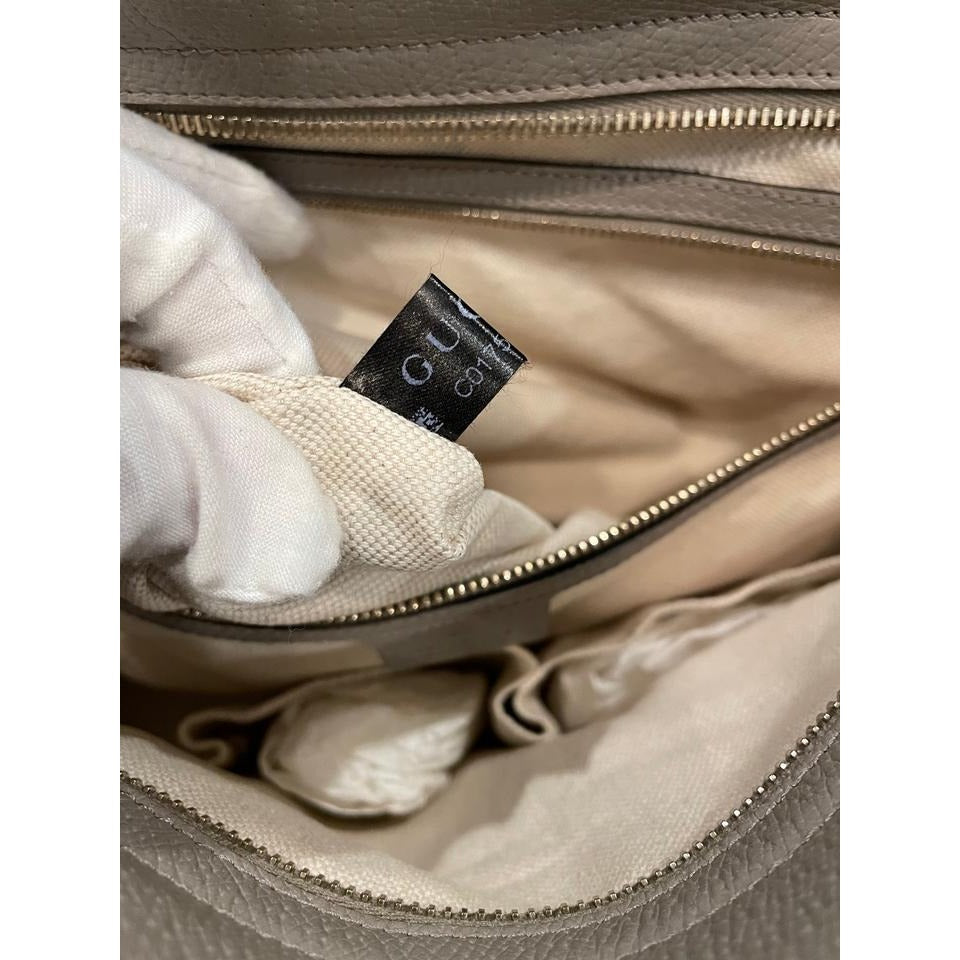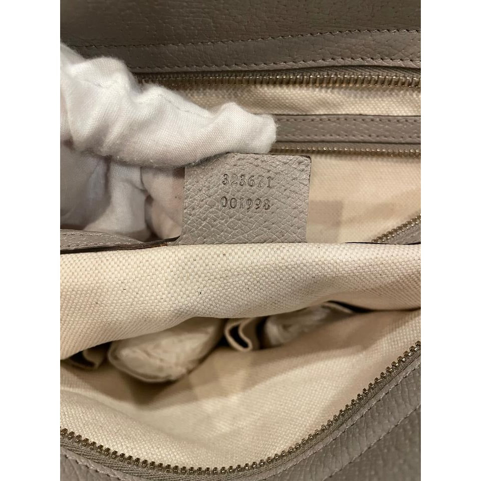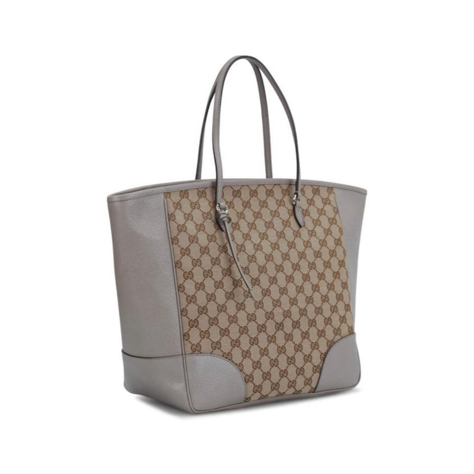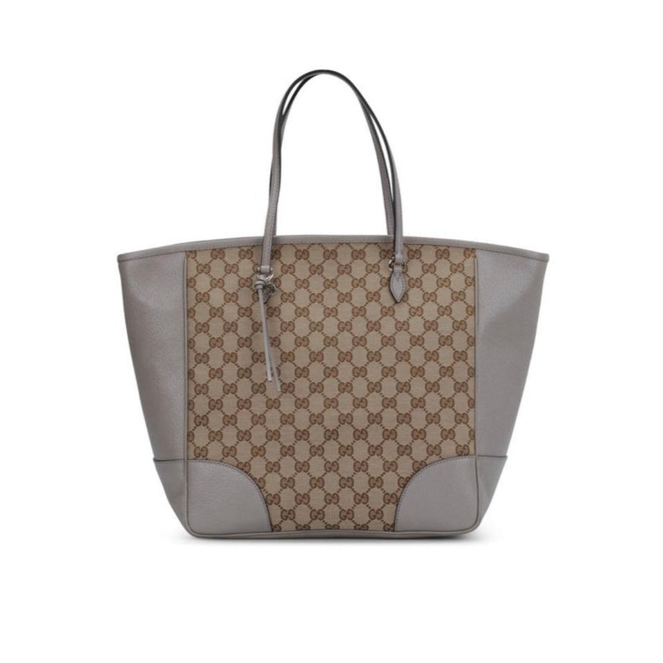 The purse is a classic, zip top closure satchel or tote style shoulder bag with two thin, flat leather straps that allow it to be worn as a shoulder or handheld bag. The body of the purse is made of brown large Guccissima print canvas and silver grey leather . It has leather accents at the top trim, straps, and where the straps attach. It has chrome accents as the footed bottom and on the sides to attach the straps engraved 'Gucci! It is a gorgeous purse with lots of room, perfect for an everyday signature piece! It is timeless and would work with any outfit!
