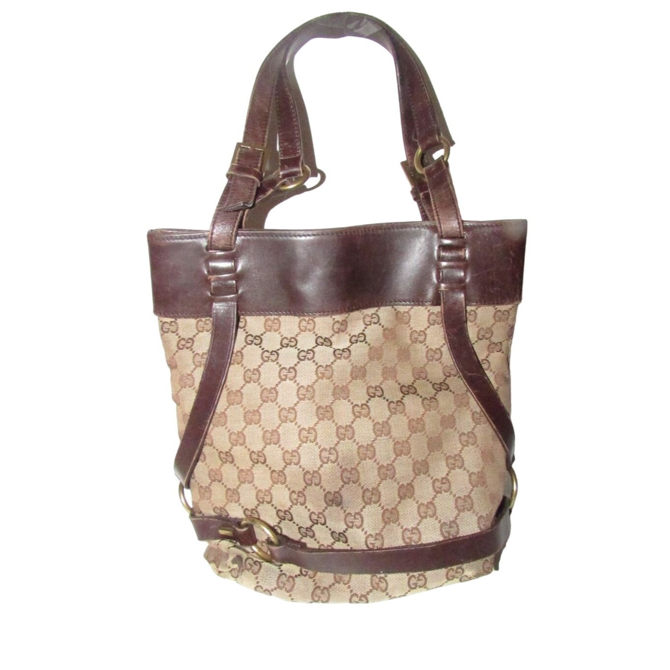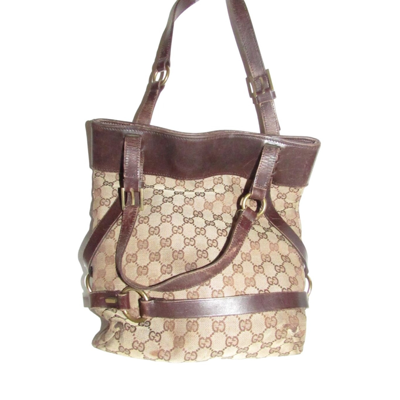 This unusual tote by Gucci is made from brown Guccissima print canvas & brown leather with brass accents. It is a cylindrical shaped tote with brass ring accents joining together brown leather straps that give it form. There are two handles with brass buckles and a wide band of brown leather at the top.