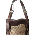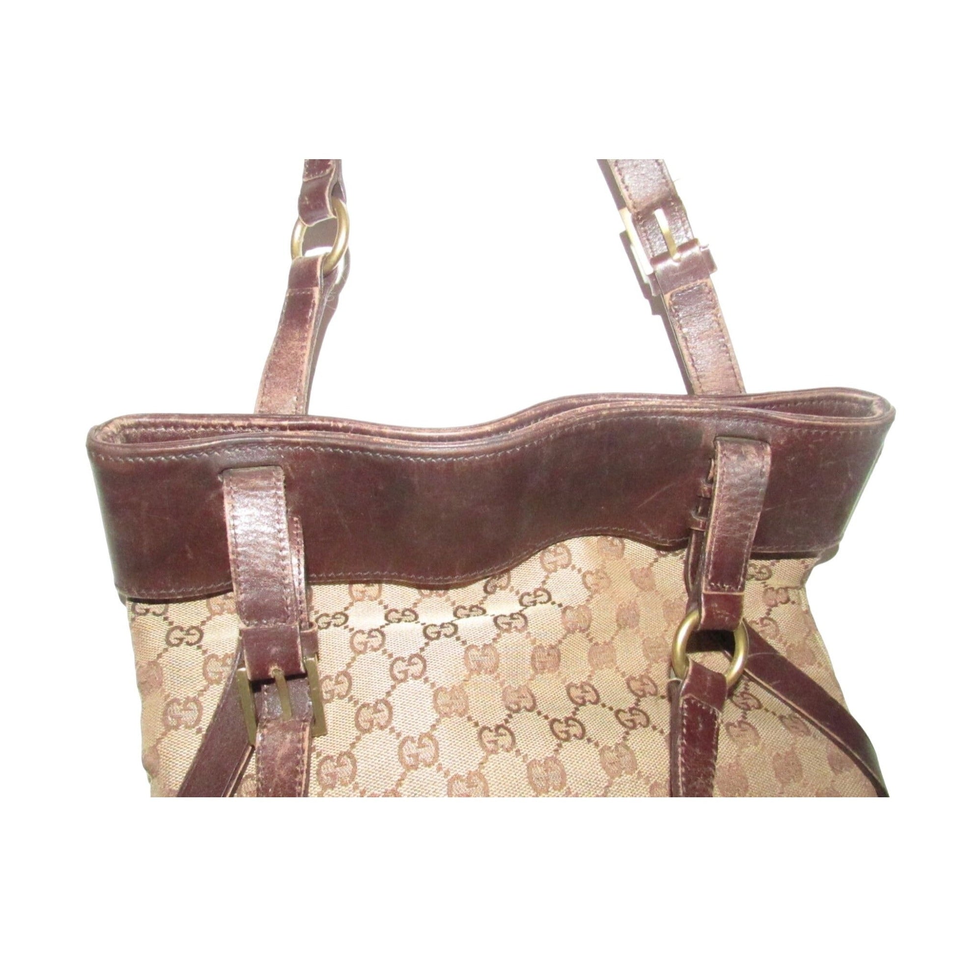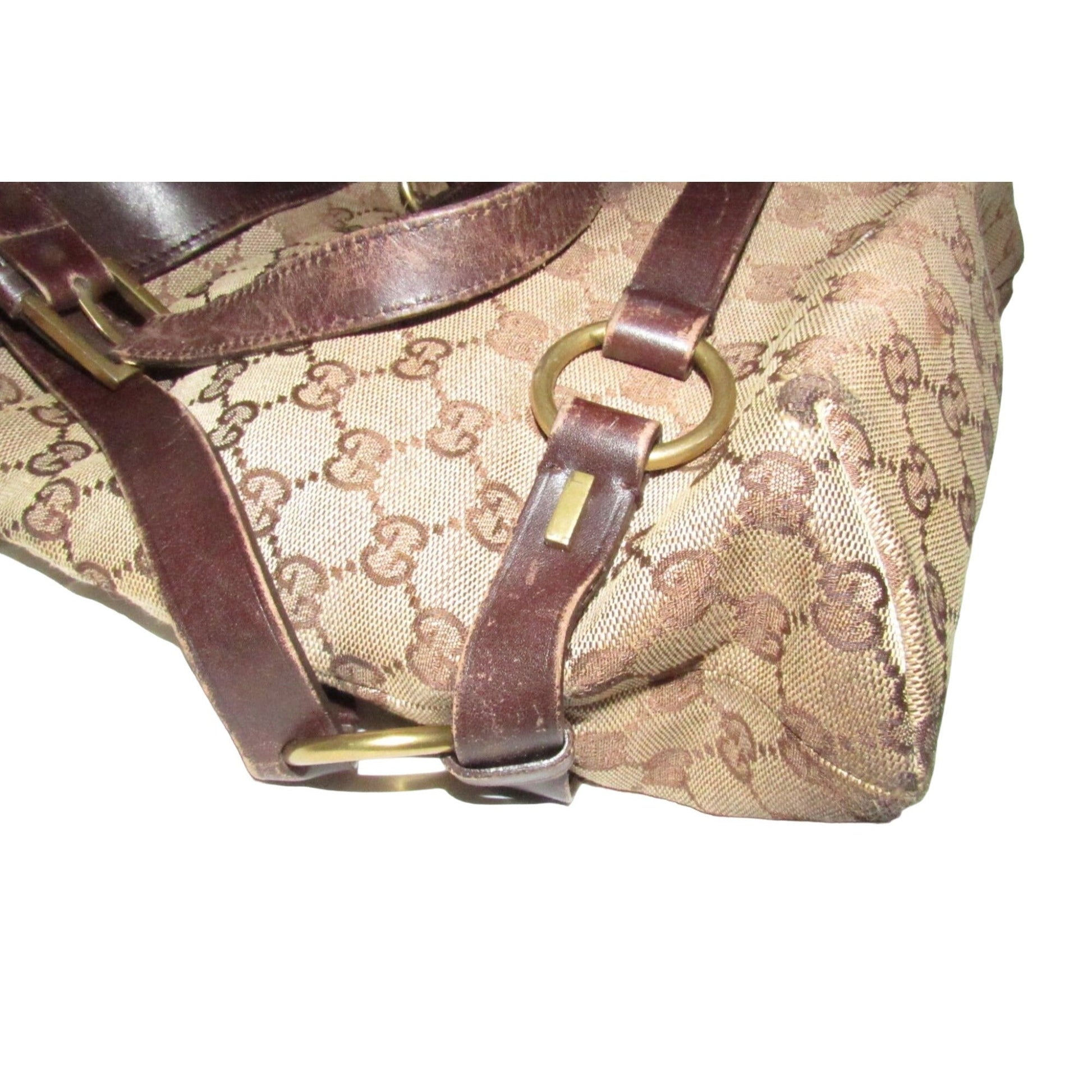For sale is a Gucci brown Guccissima print canvas & leather strappy cylindrical tote with brass accents. It is a large, unique take on a tote bag by Gucci that will look great with lots of outfits!