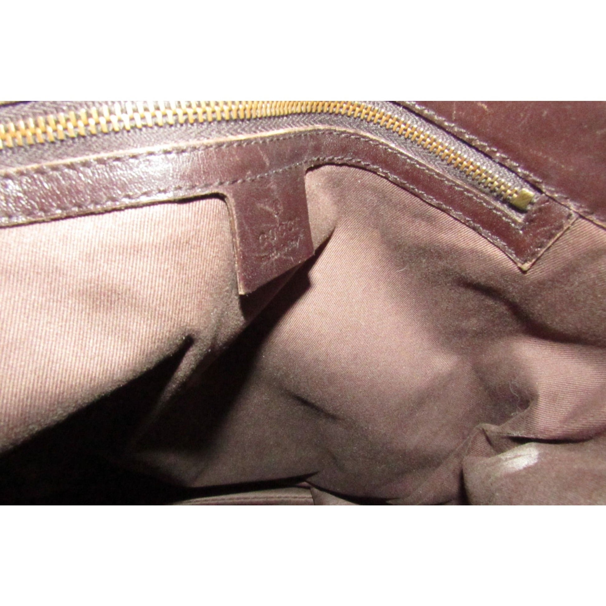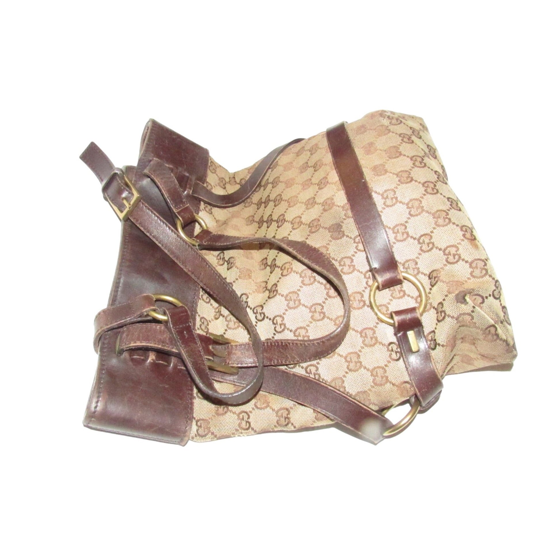 Inside, it is lined with very clean brown fabric. It has one compartment & one zip close pocket. There is a leather embossed tag that read, 'Gucci made in italyon the front and has the Serial #106248 2123 stamped on the back.