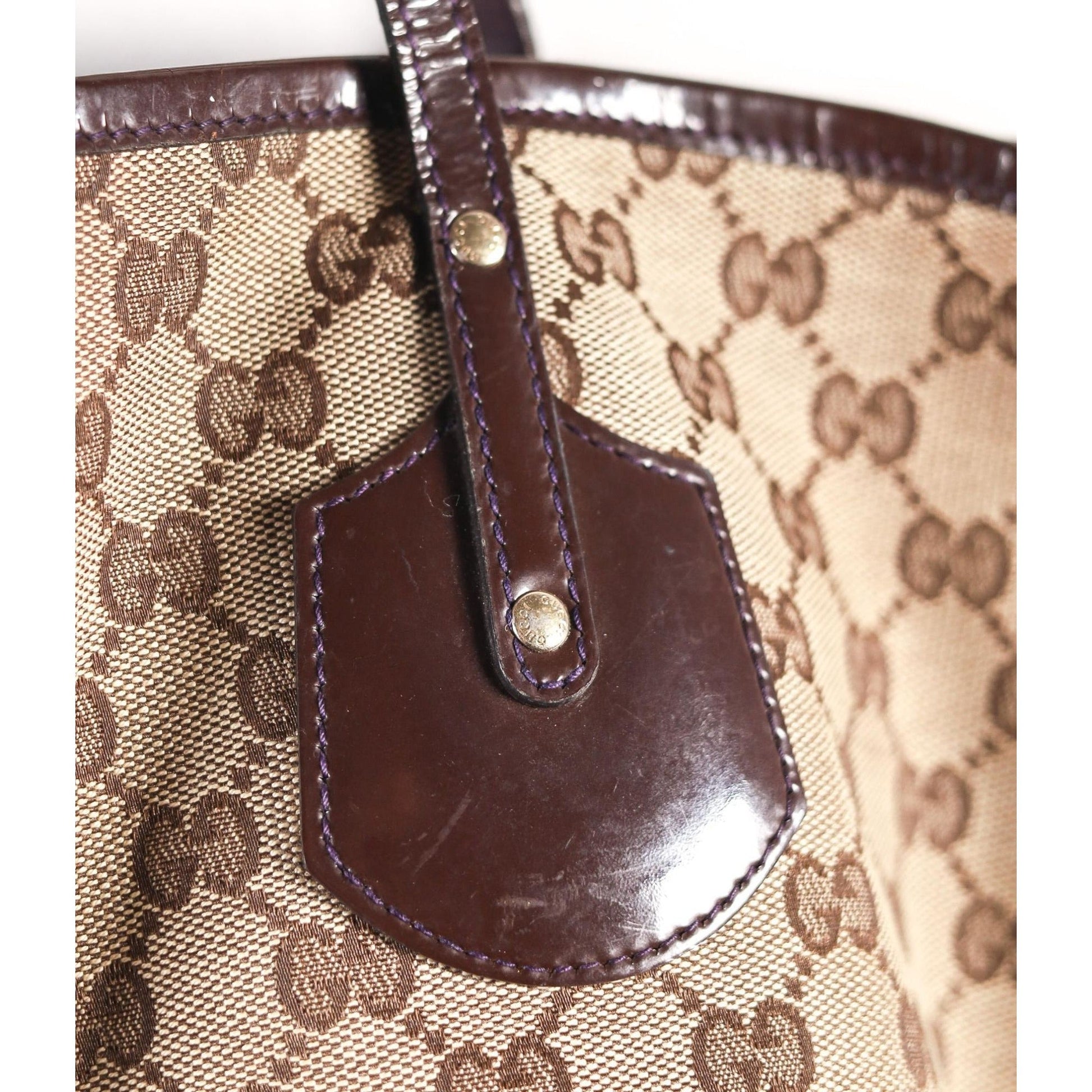 This is a unique take on the classic brown & beige Guccissima print canvas & leather large satchel/tote style handbag. The classic GG design covers the bag & it has leather trim and straps. It is lined with a soft purple fabric that matches the resin GUCCI charm and features a zipper pocket and pouch. There is a leather tag stamped with 'Gucci, made in italy' on the front by the zipper pocket with the serial # on the back.