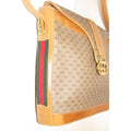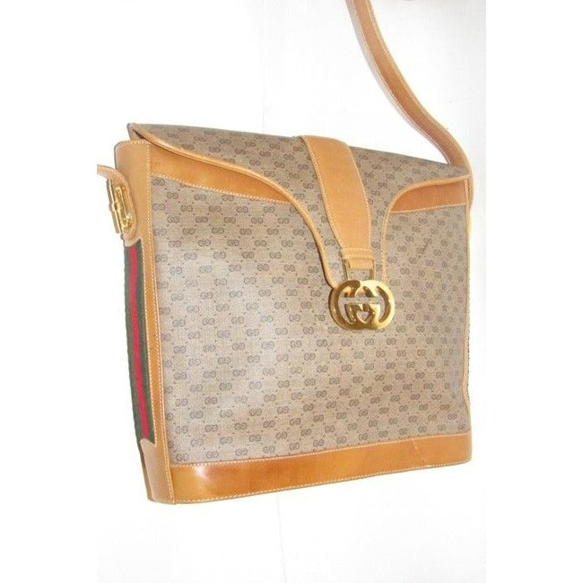 * For sale is an early Gucci, GG Vintage Web, brown small G logo print coated canvas and camel leather, large, envelope snap top, satchel shaped, hobo style shoulder purse with inlaid, red and green striped accents on the sides and bold, gold G logo hardware! The purse is an early, bucket style design from Gucci that is a perfect year round, signature, brown purse!
