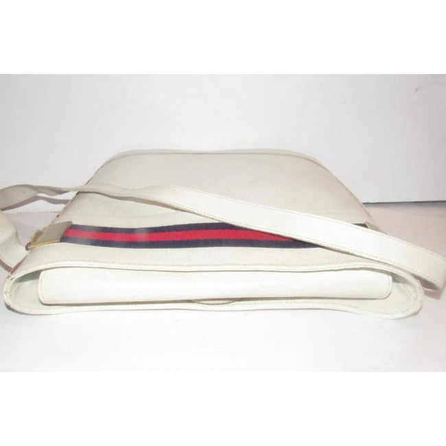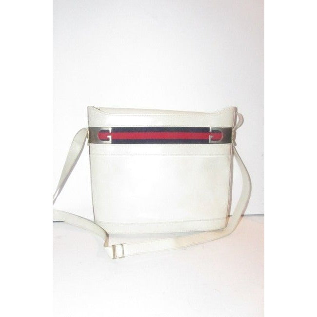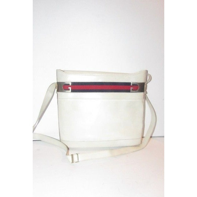 For sale is a RARE, early, Gucci, large, white leather, structured, bucket shaped, satchel/cross body/shoulder style bag with a red and blue Sherry striped accent at the top, gold G accents, and a top flap snap closure! It is a rare, early Gucci style in a hard to find color combination that would be great used as your signature white purse!