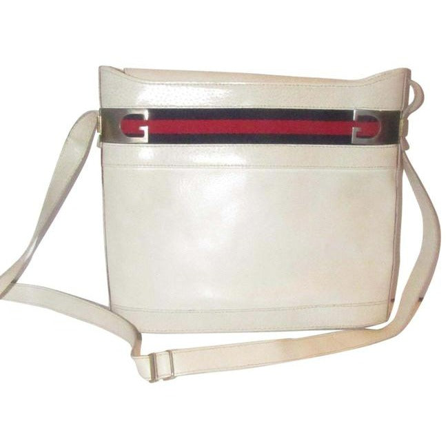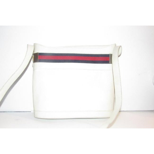 The bag is a large, structured, cylindrical or bucket shaped, satchel style purse that can be worn as a cross body or shoulder style bag. It is made of supple white leather. The purse has a wide, red and blue fabric Sherry striped accent at the top with gold 'G' accents as end caps at the top ends! At the top it has a leather flap that snaps to secure it. The strap is adjustable in length.