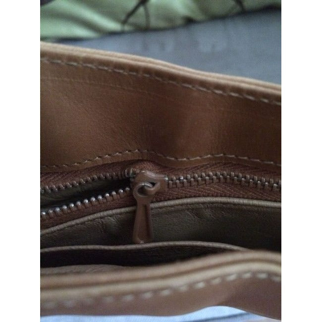 The bag has minimal wear to the leather & lining. The lining is also nay and very clean- see pictures. The purse has an expandable, accordion style bottom and multiple pockets to keep you organized. It is not a huge looking purse, but because of the expandable bottom and pockets, it can hold more than you would think!