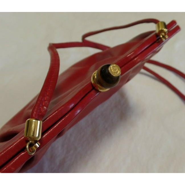 It is a pouch shaped, two-way style cross body, shoulder purse, or clutch made with a supple true red leather. It has a hinged frame and kiss top closure! The kiss top closure clasp is made of gold and tiger's eye and is engraved 'GG'. The strap is long and thinner and made of leather- it can be collapsed into the purse or used! This is a fabulous piece for an everyday pop of color or dressier purse!