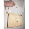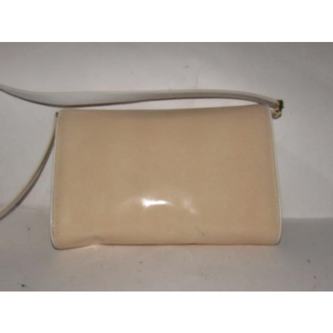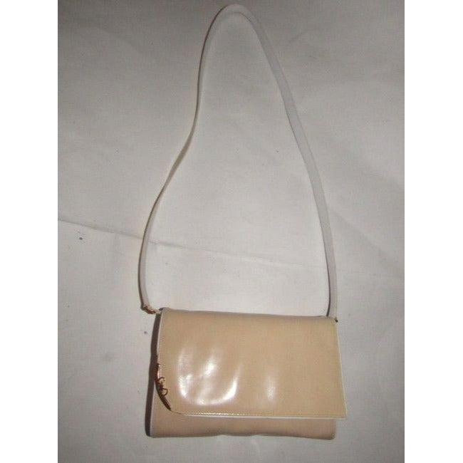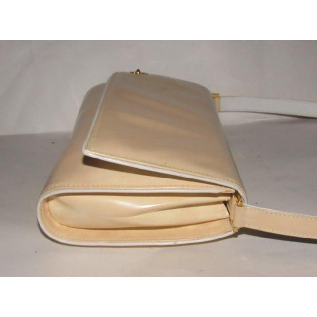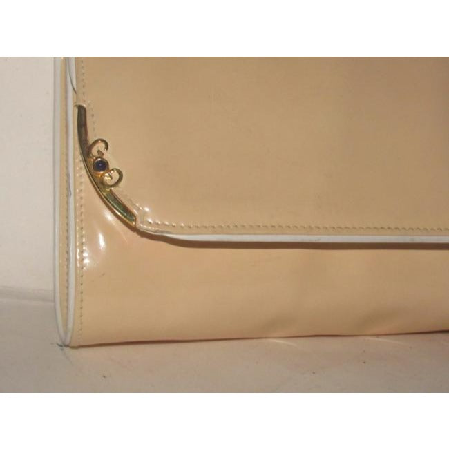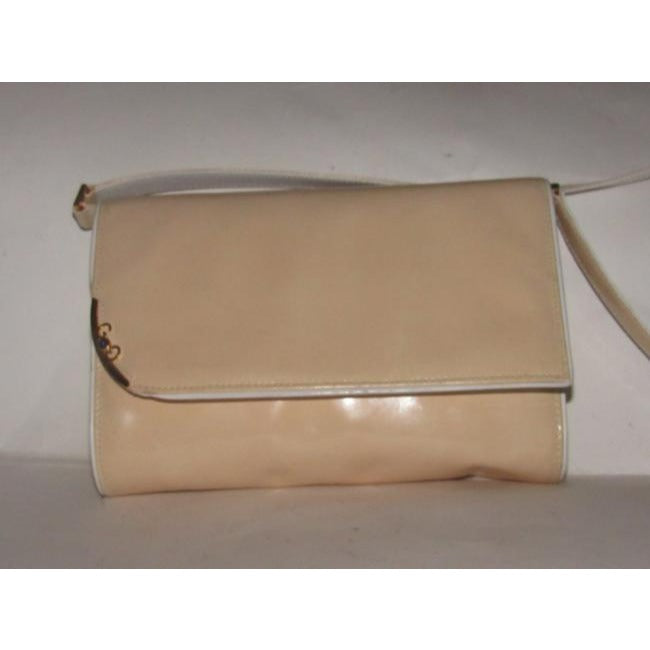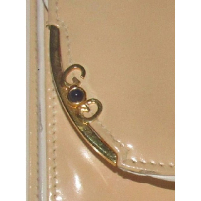 This early two-way style purse by Gucci has a removable strap and an asymmetrical, envelope top flap that snaps to secure it. It is made of a unique glossy beige or tan colored leather with glossy white leather accents and trim. The purse has pleated, expandable sides, so it can hold more than you might think. On one side of the asymmetrical envelope flap top, there is a beautiful, gold and blue lapis, Gucci, GG logo accent.