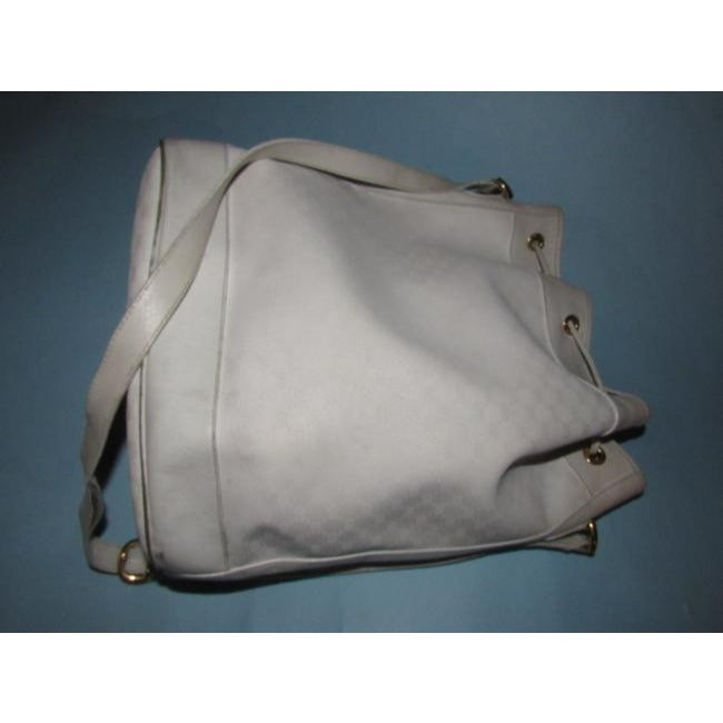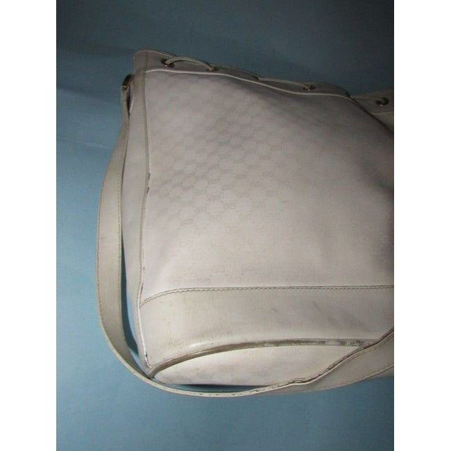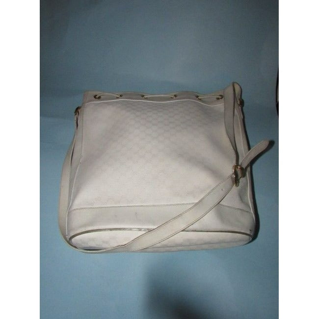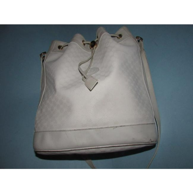 The bag is made of a white small G logo, coated canvas and white leather accents. It is a drawstring bucket / shoulder/ cross body style with lots of room. It has all of the details an authentic Gucci should, like stamped hardware, and serial numbers of 001.116.0933- see pictures. It has an interior zip pocket and an adjustable leather strap!