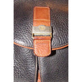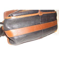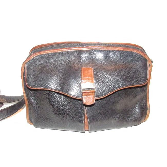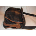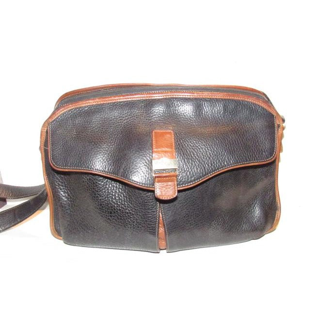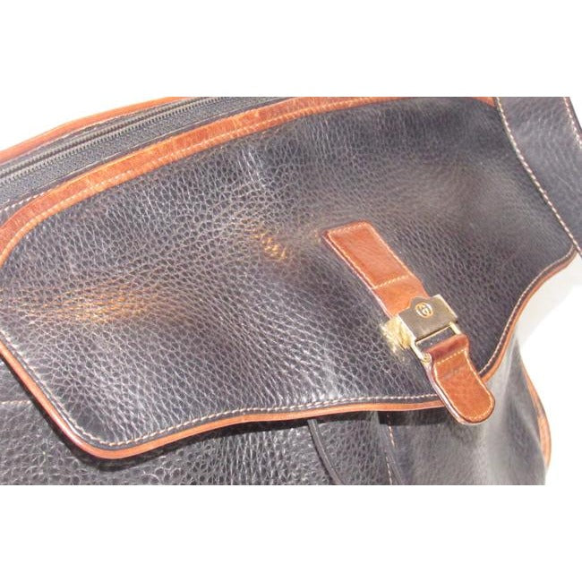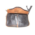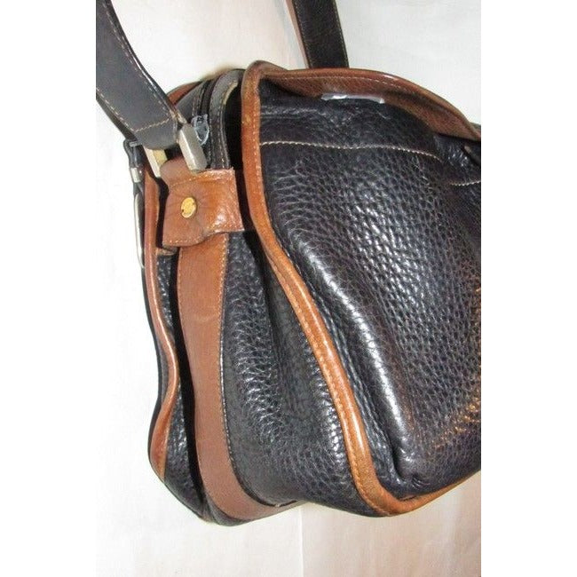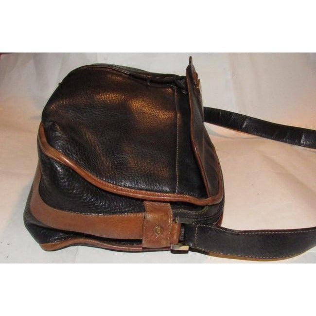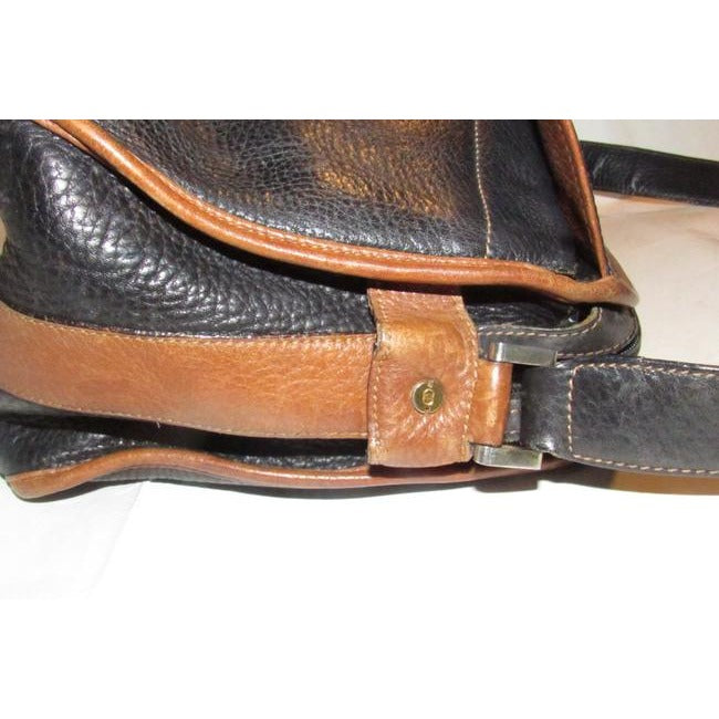 The bag is a satchel style purse by GUCCI that makes great use of space! It is made from black pebbled leather and brown smooth leather in a color block design. It has a zip top closure with two front exterior pockets with a drawstring closure and an envelope flap top. It has a wide, leather shoulder strap that is not adjustable.