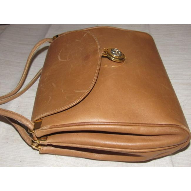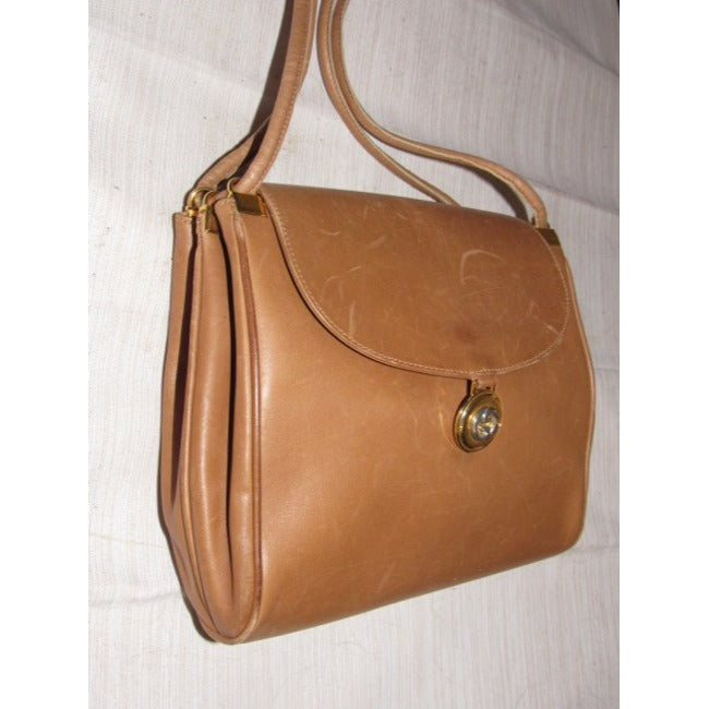 It has two straps that are attached at the top and an envelope top snap closure, in a rectangular shape with expandable sides. Below the snap on the outside there is a chunky, circular, two-tone GG logo accent. The bag is made of a buttery soft, camel leather, so it has some shallow scratches that should come out with polishing. On the sides, it has a kind of accordion cut for more room.