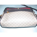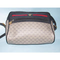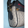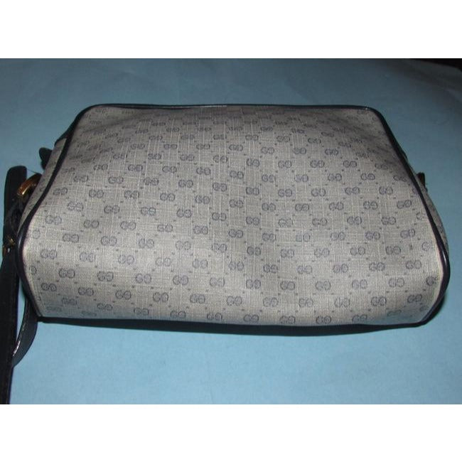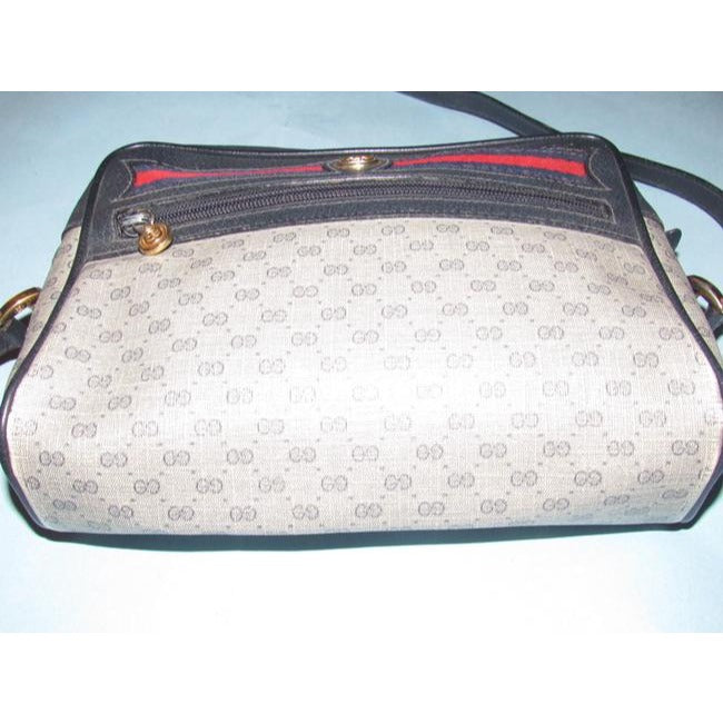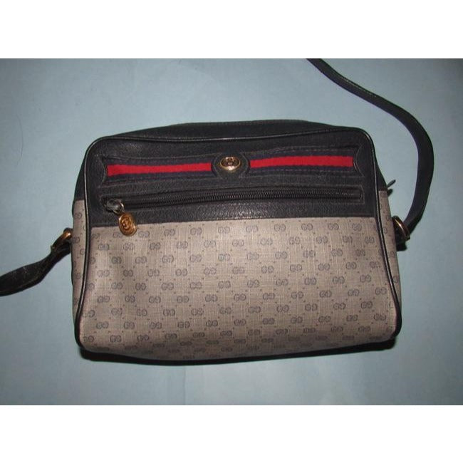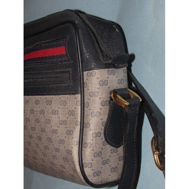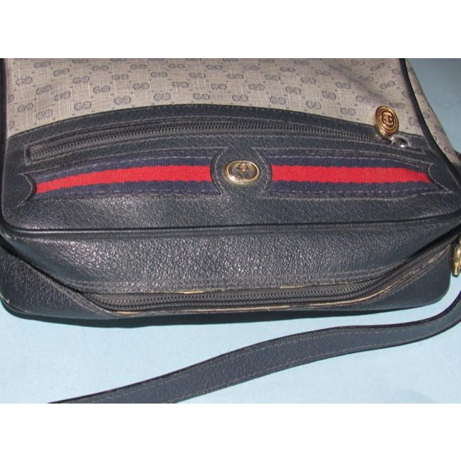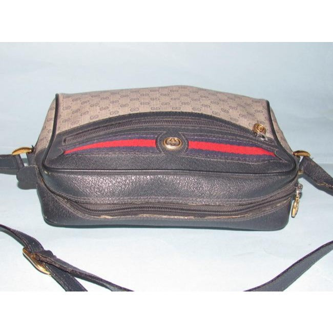 * For sale is a Gucci, navy blue small G logo print coated canvas & leather, roomy, cross body/shoulder bag with front zip pocket and with red/blue striped accent! It is a classic style that would be great used as a signature purse or as your everyday blue purse!