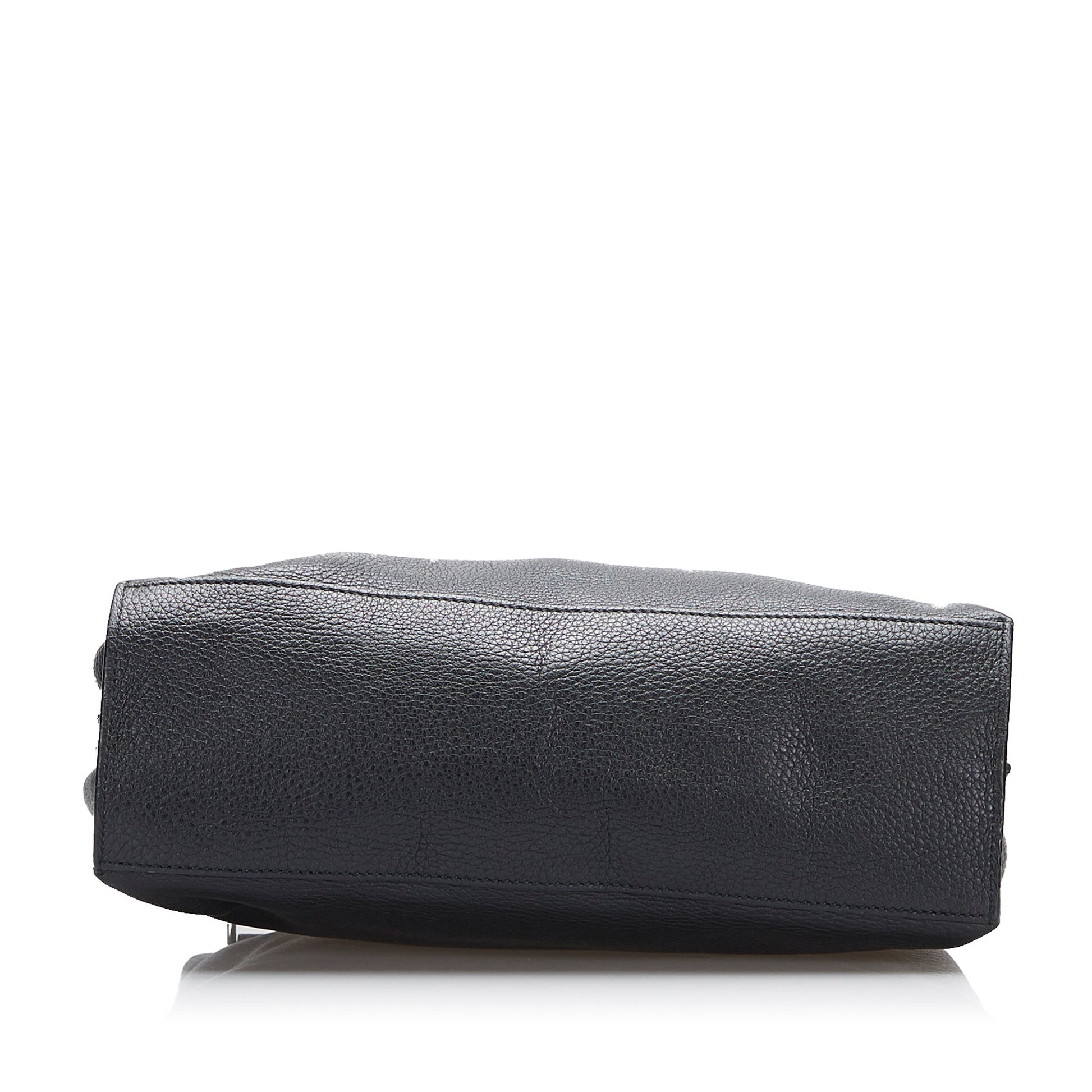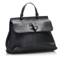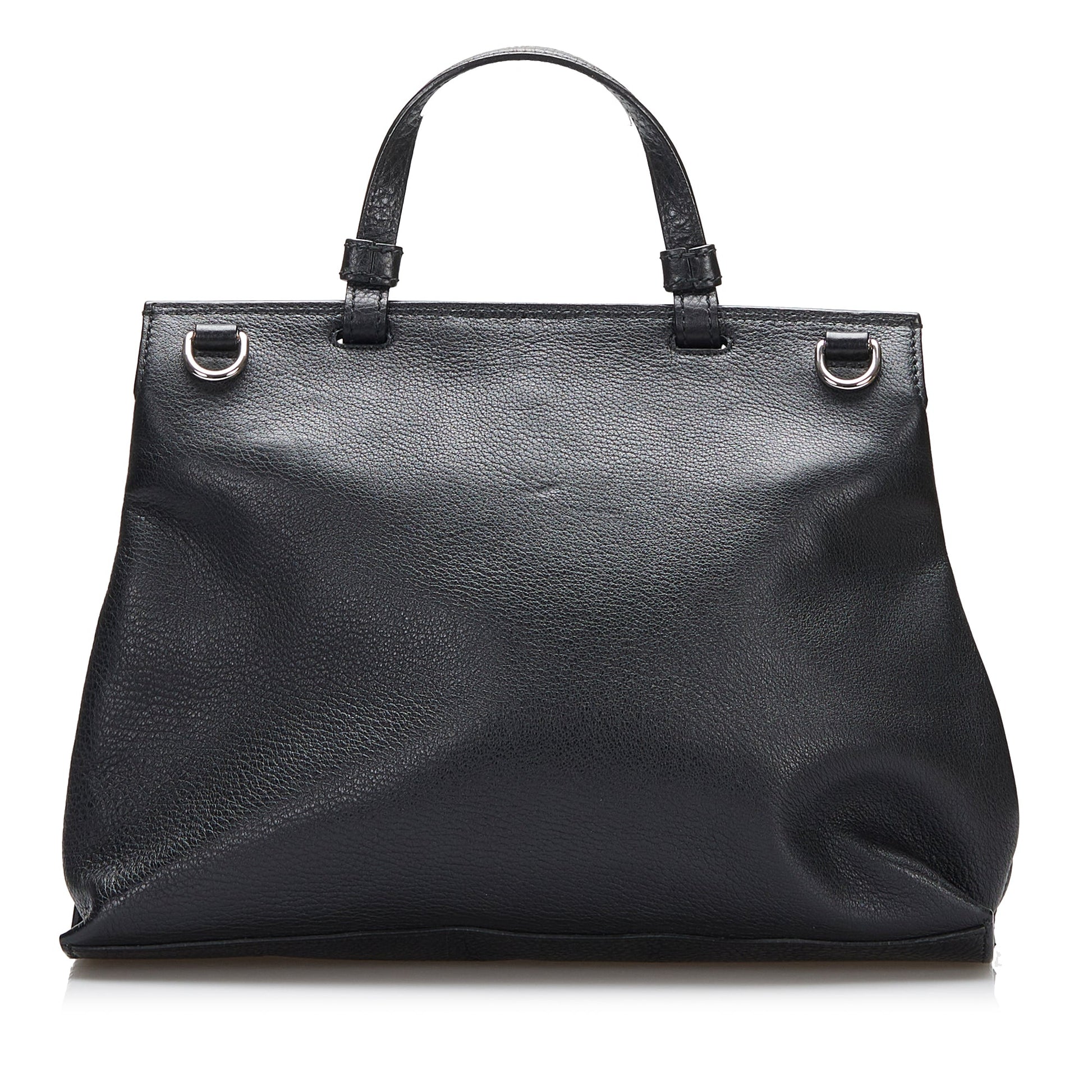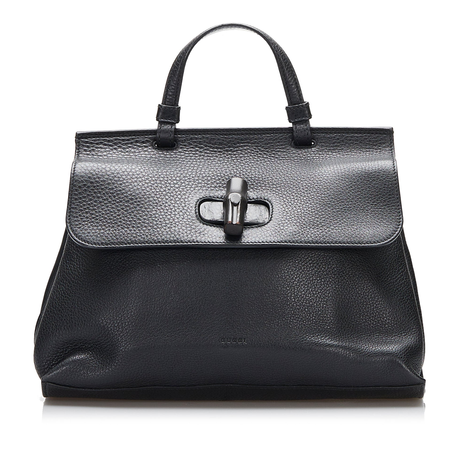 The Daily satchel features a leather body, a flat top handle, a detachable flat leather strap, a front flap with a bamboo bullet twist lock closure, and interior zip and slip pockets.