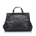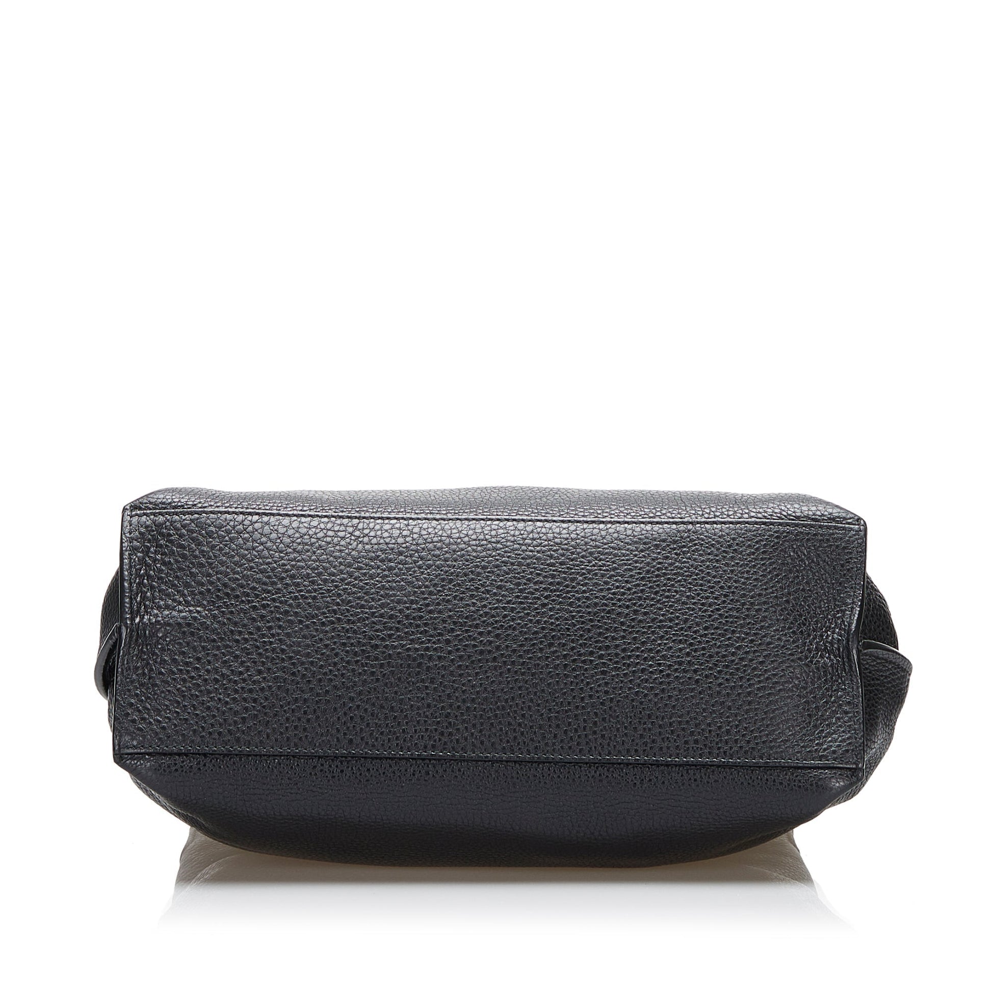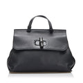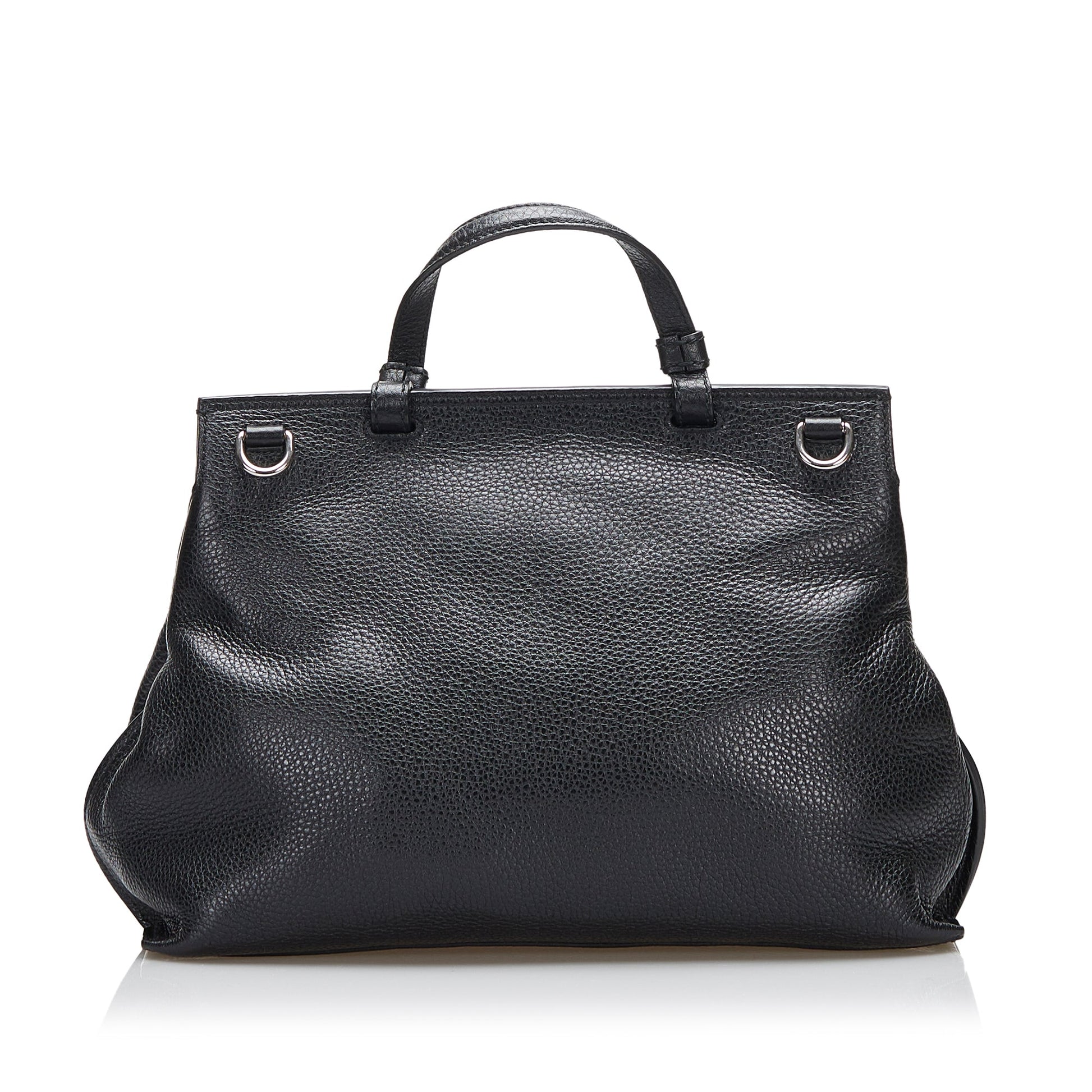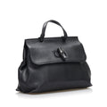 The Daily features a leather body, a flat leather top handle, a detachable flat leather strap, a front flap with a bamboo bullet twist lock closure, and interior zip and slip pockets.