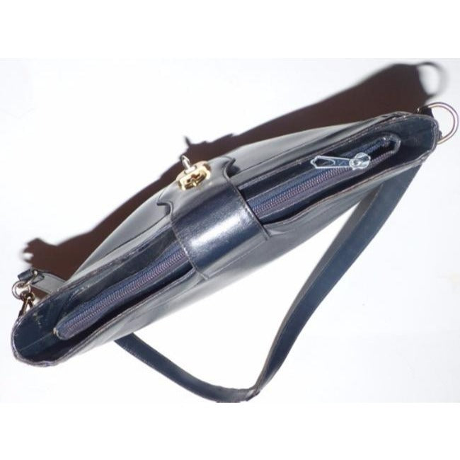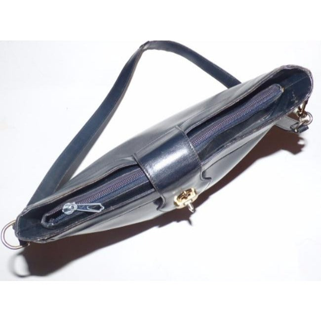 The bag is a shoulder style purse by GUCCI in a rare, all leather style. It is made from polished, navy blue leather with gold tone hardware and has a zip top plus a flap top closure that looks like a padlock! There are a few layers of zip closure and slot compartments to allow it to hold more than you may think. The very clean, blue suede lined interior has lots of slit and zip pockets to keep you organized!