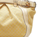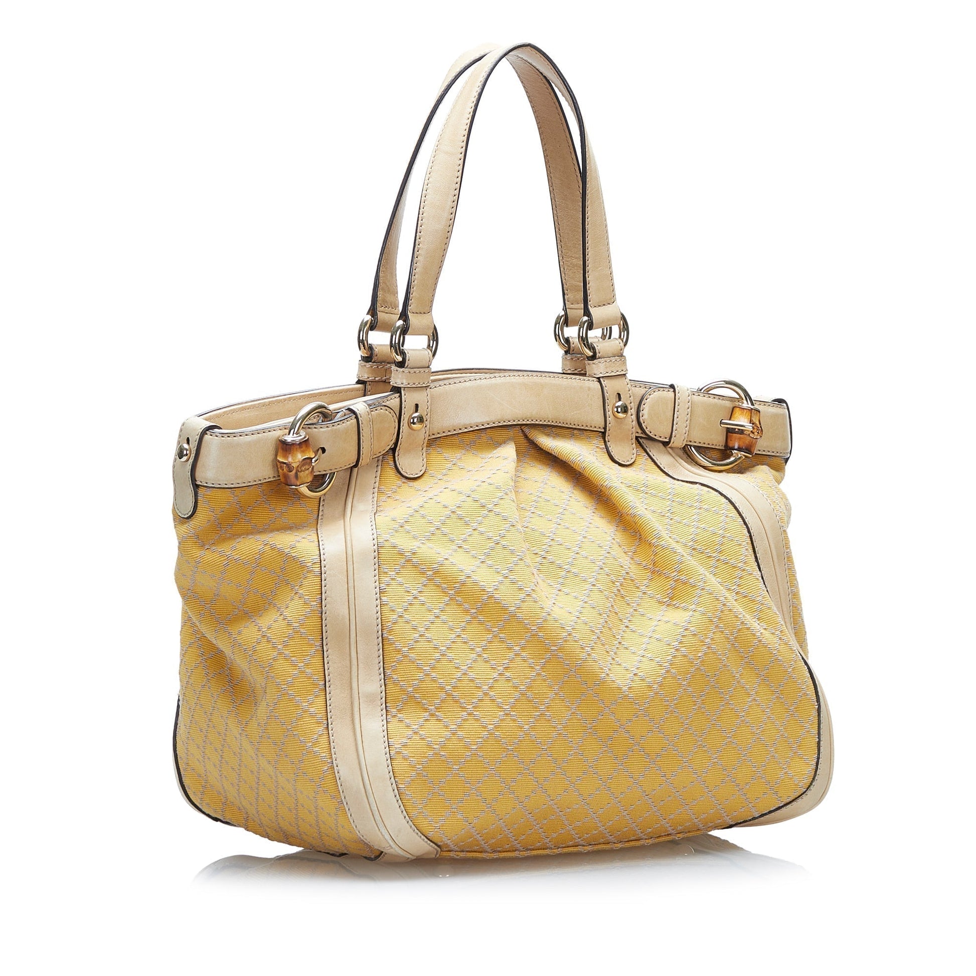 This handbag features a canvas body with leather trim, flat leather straps, top zip closure, and interior zip and slip pockets.