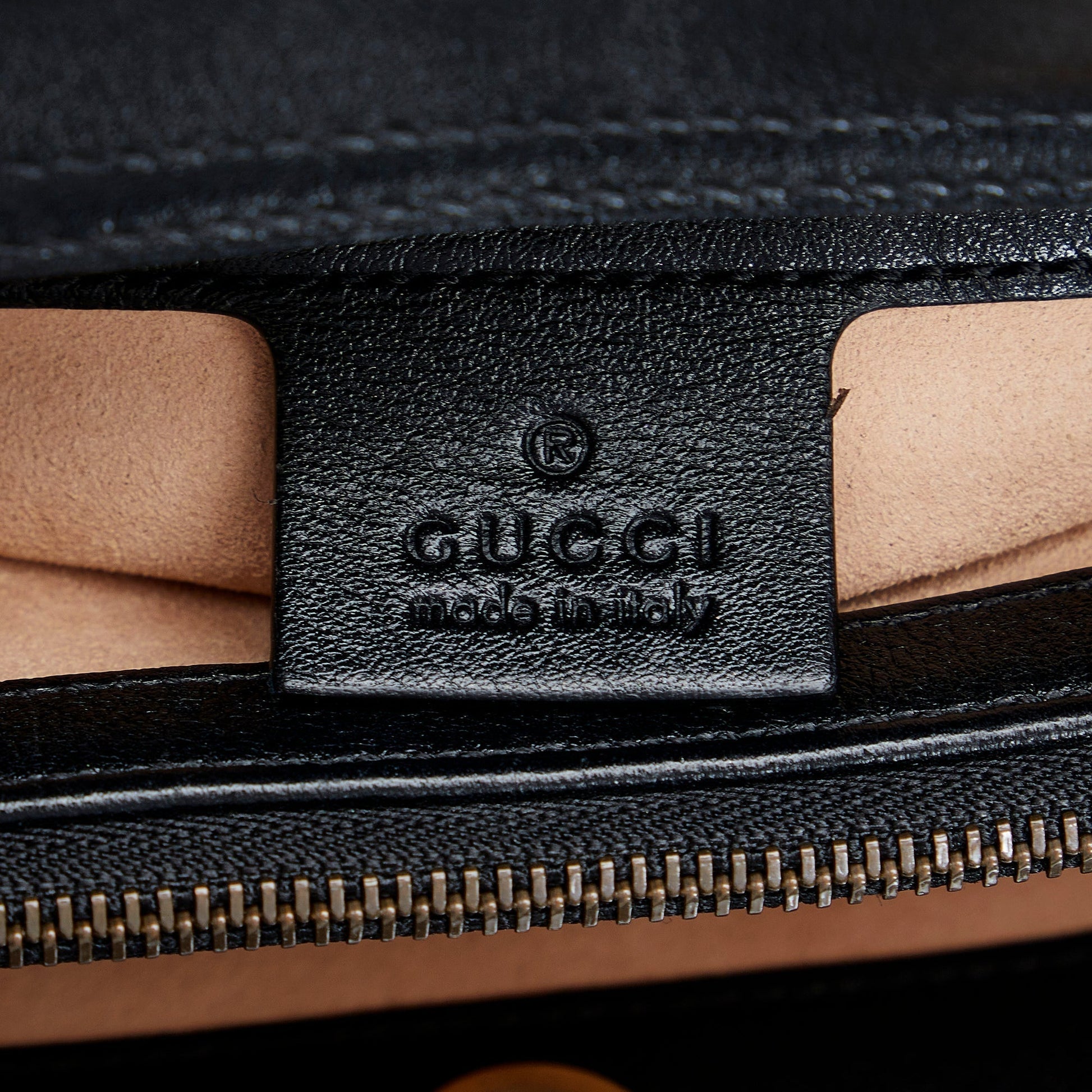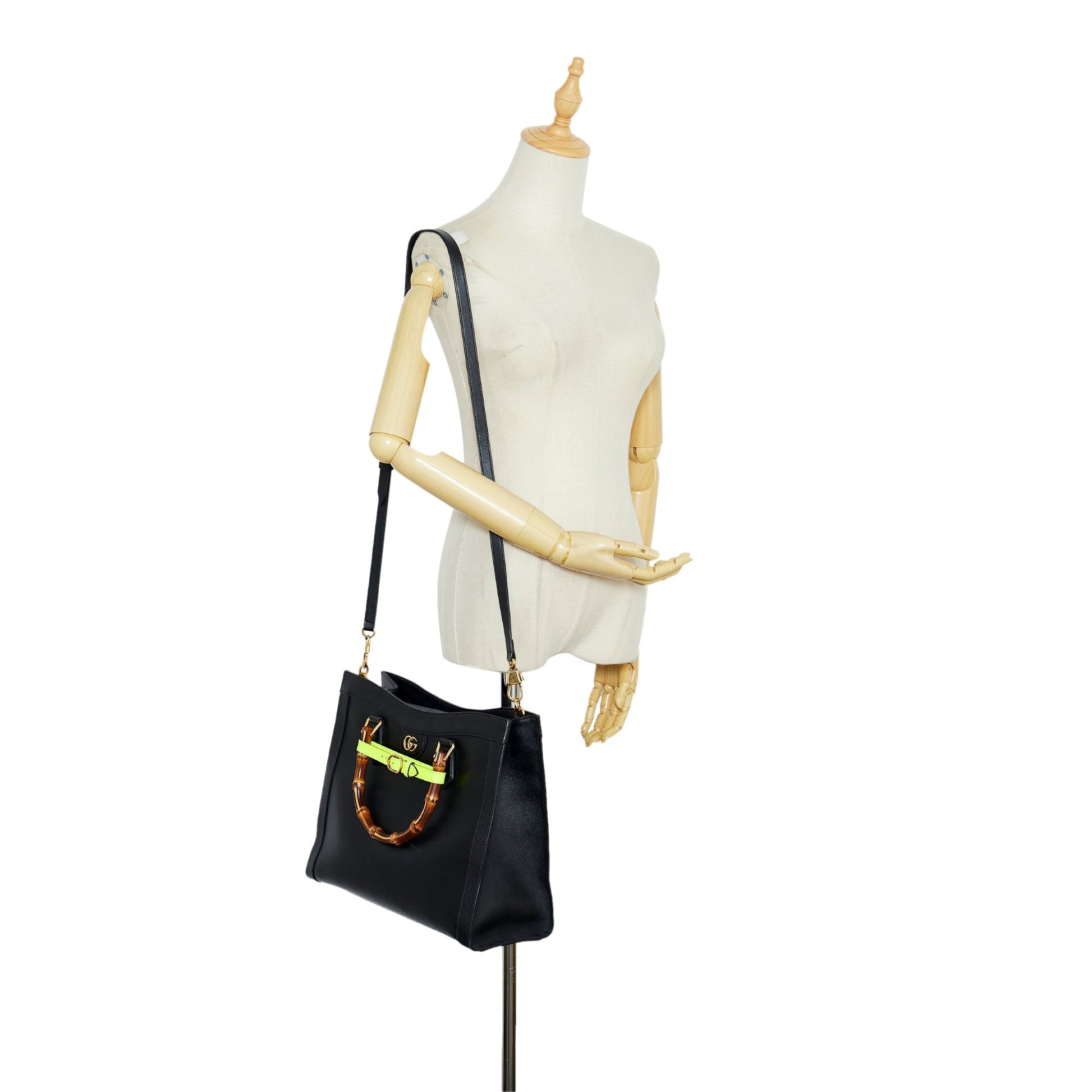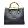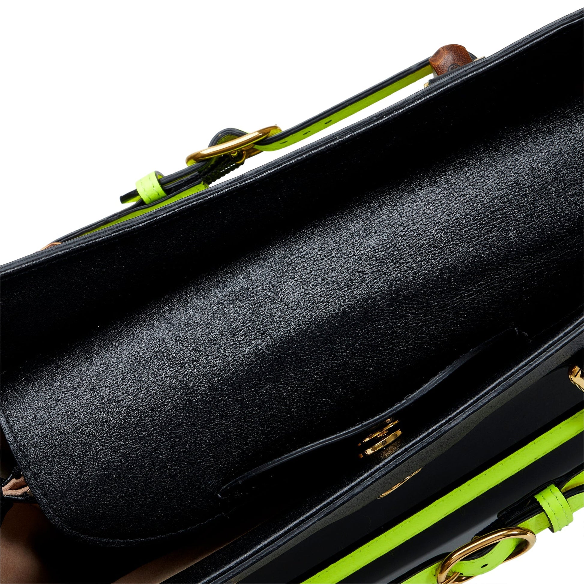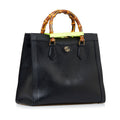 This satchel features a leather body, a bamboo handle, a detachable flat leather strap, an open top with magnetic snap button closure, and an interior zip pocket. Comes with box and dust bag.