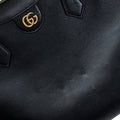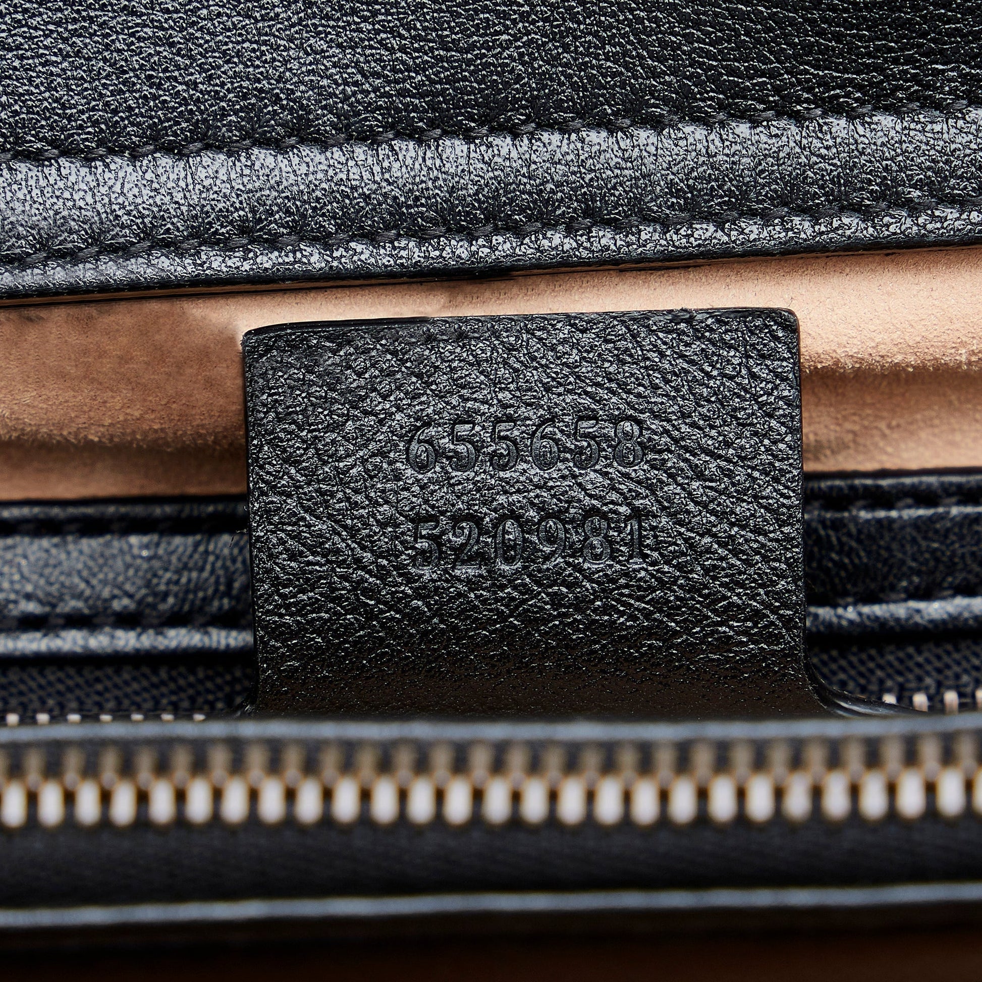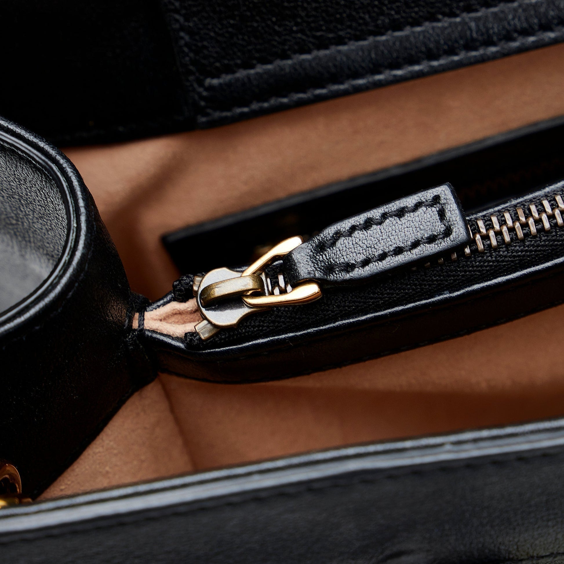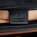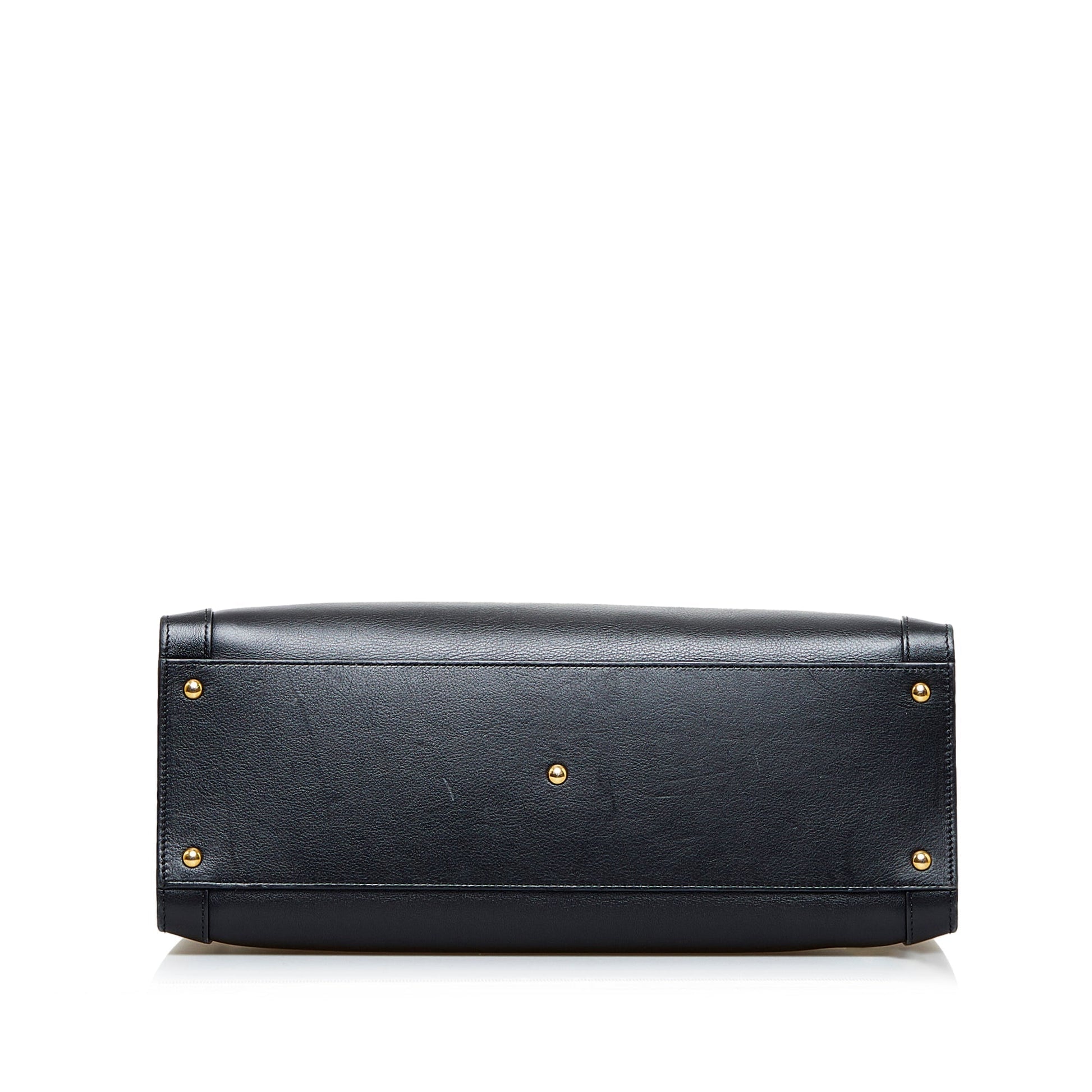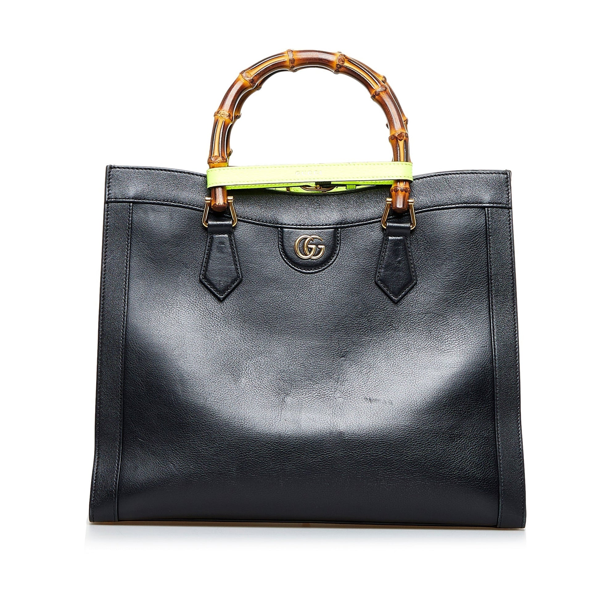 This satchel features a leather body, a bamboo handle, a detachable flat leather strap, an open top with magnetic snap button closure, and an interior zip pocket. Comes with box and dust bag.