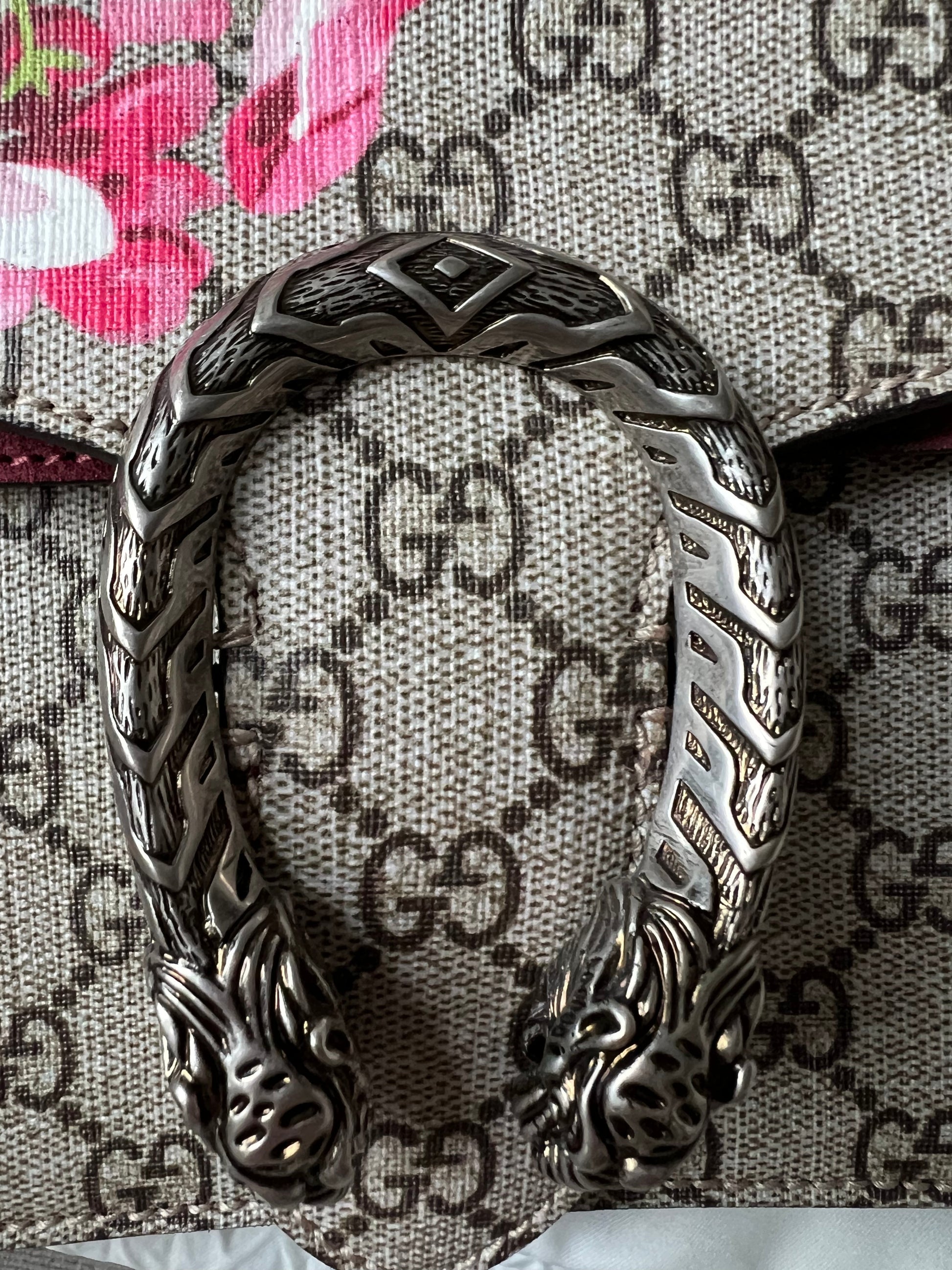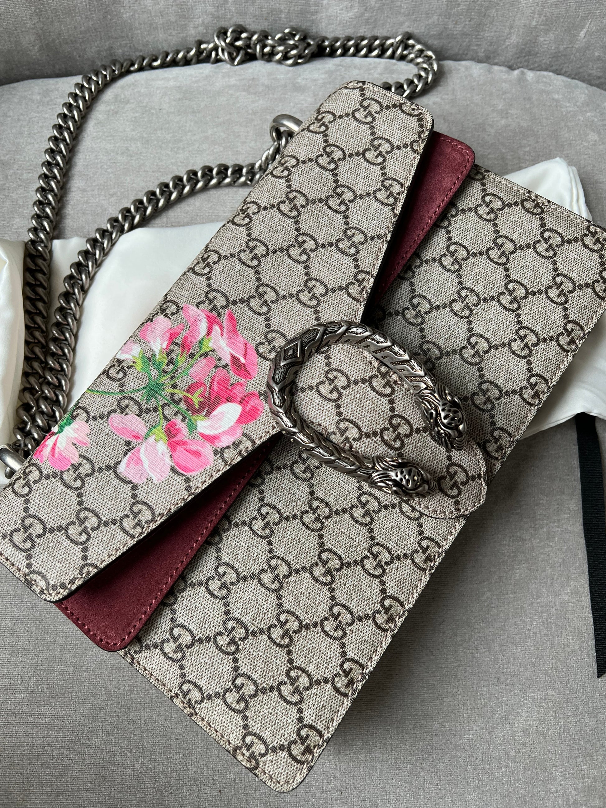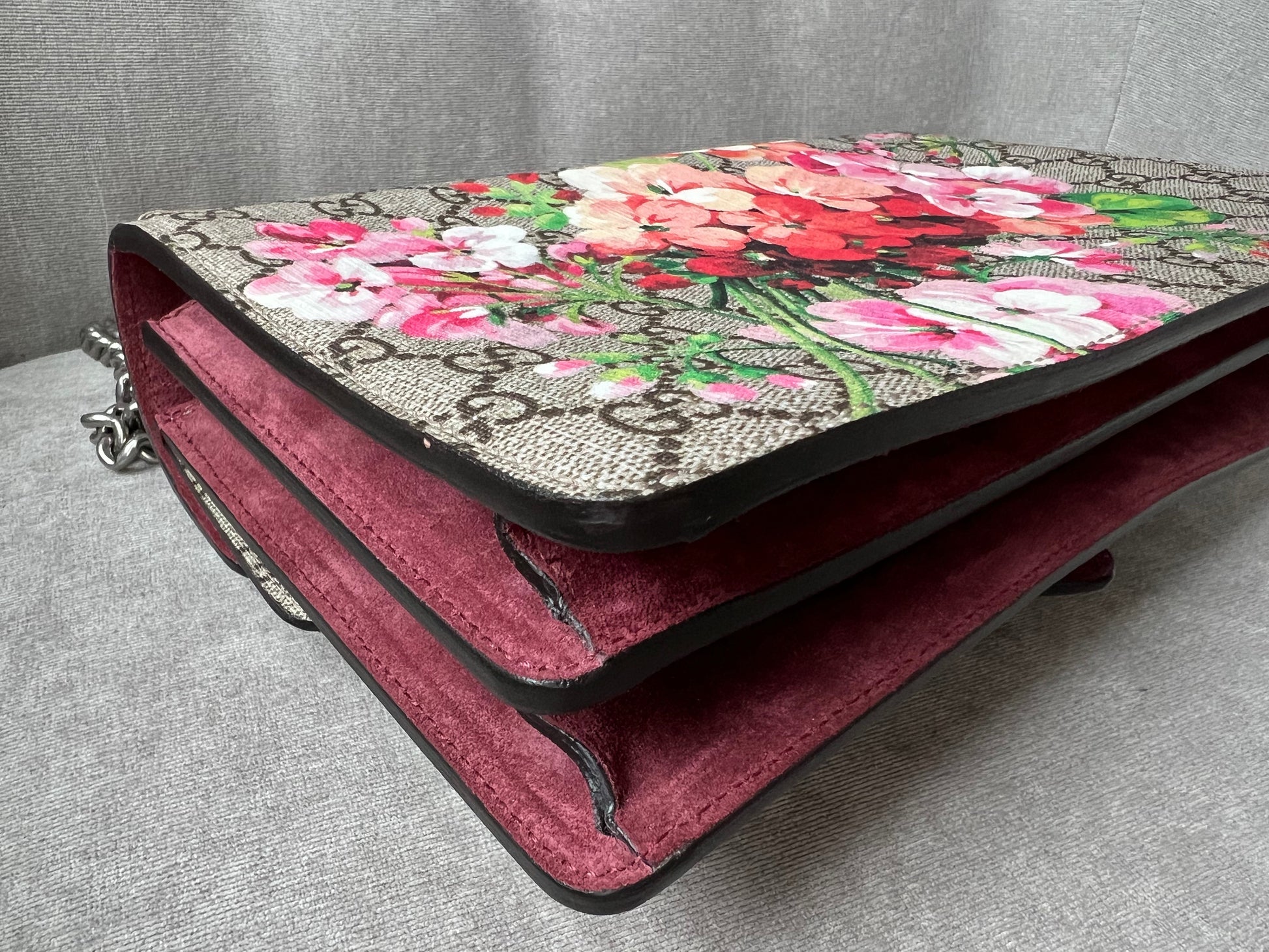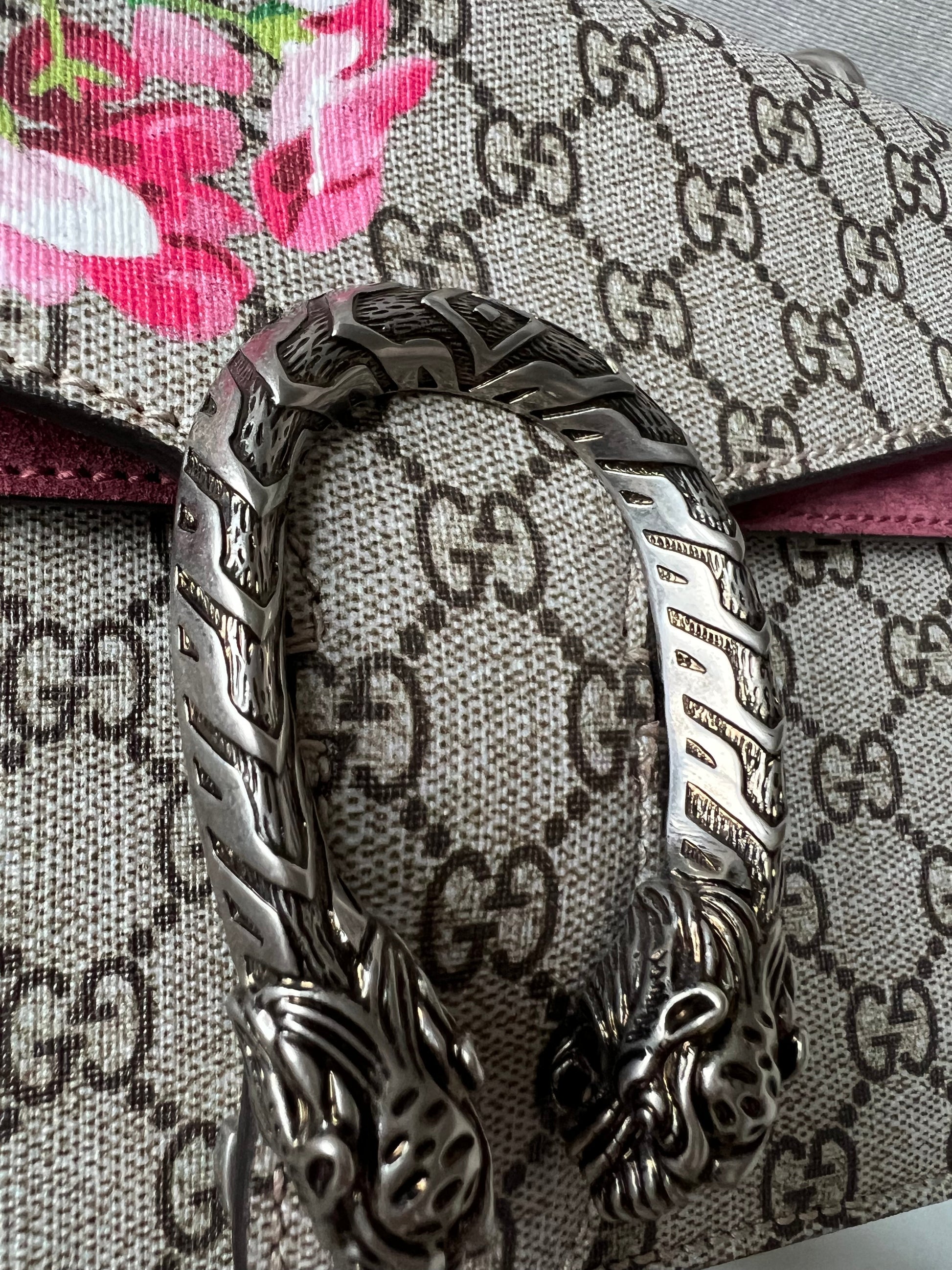 Gucci Small Dionysus GG Shoulder Bag in Blooms Supreme Canvas. The small Dionysus shoulder bag is presented in the signature GG pattern with blooms print, trimmed with deep pink suede details. Featuring the tiger head closure, this iconic style is perfect for day or evening use. The sliding chain strap can be lengthened or doubled up over the shoulder or in the crook of the arm. Note the strap is not long enough to be cross body.