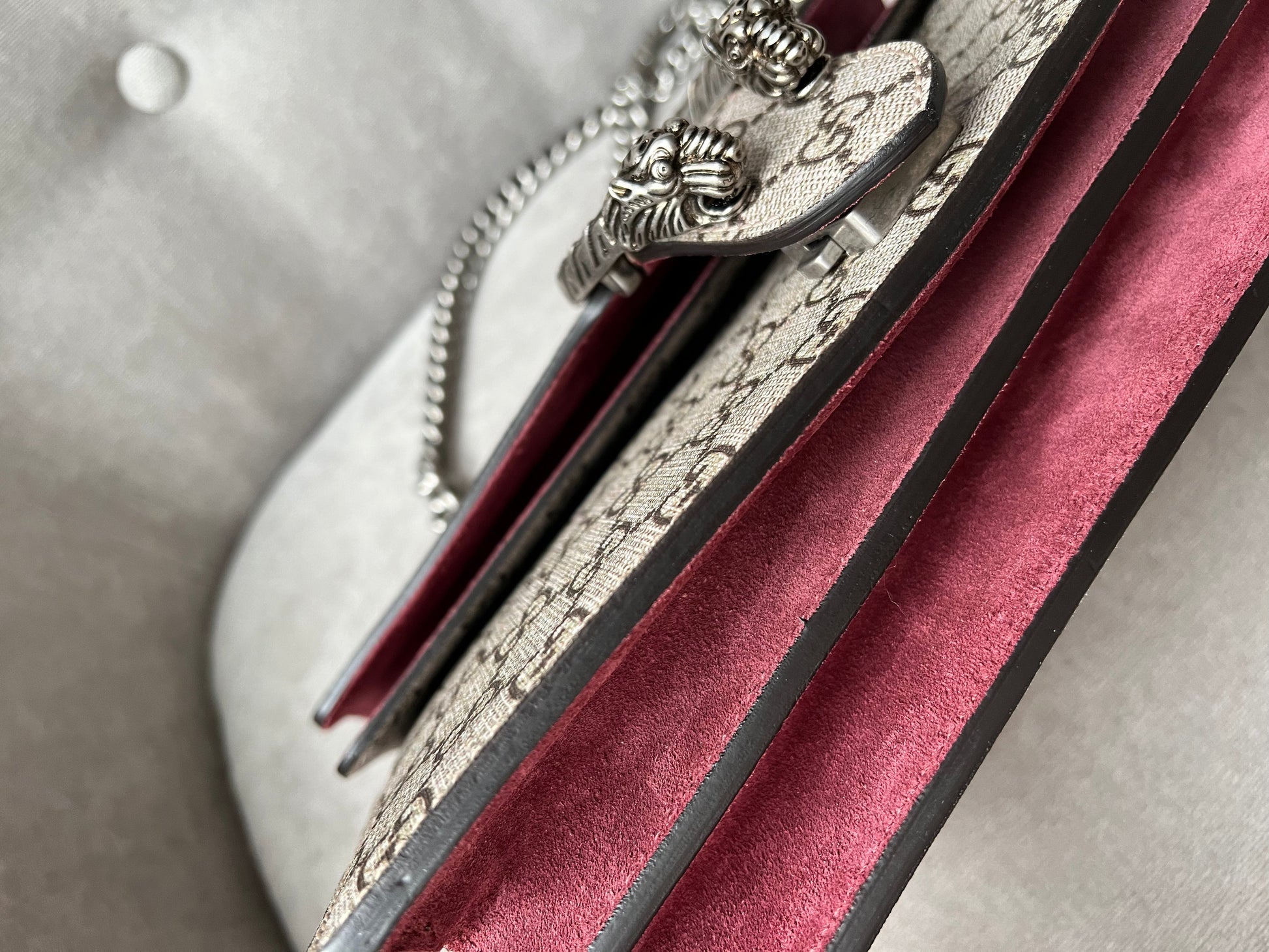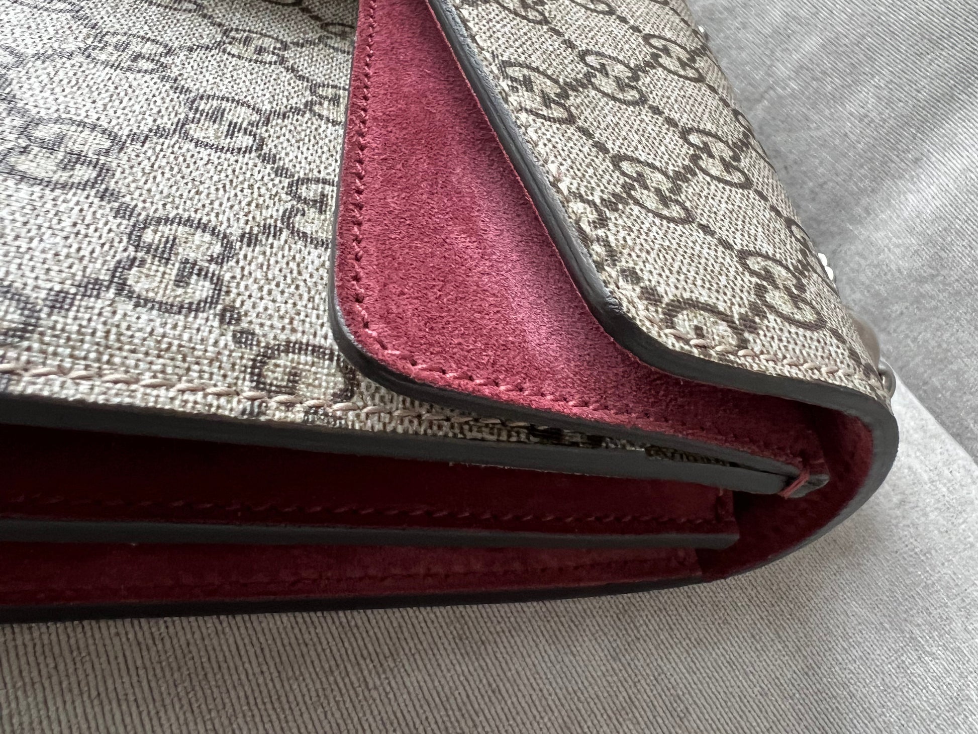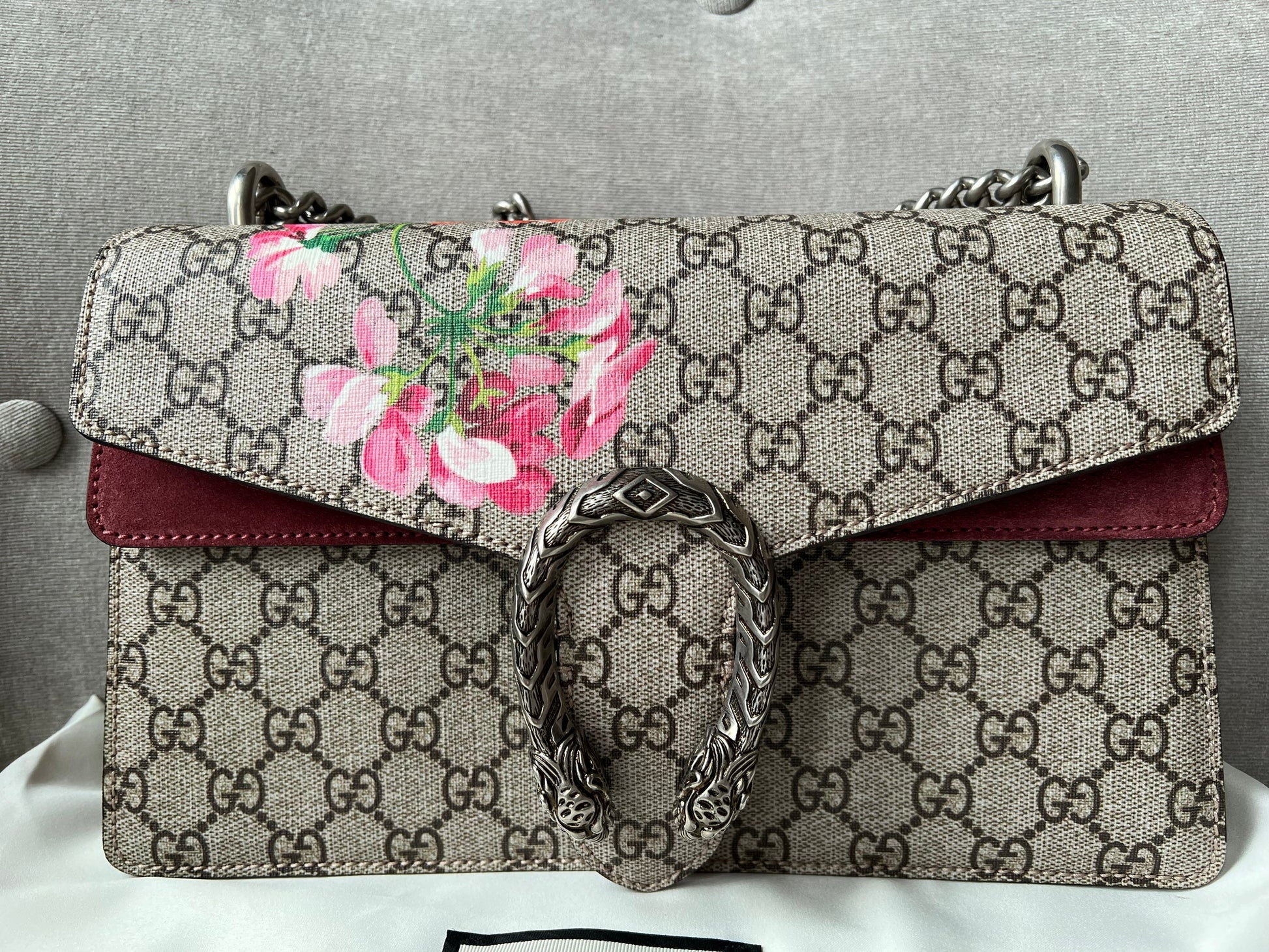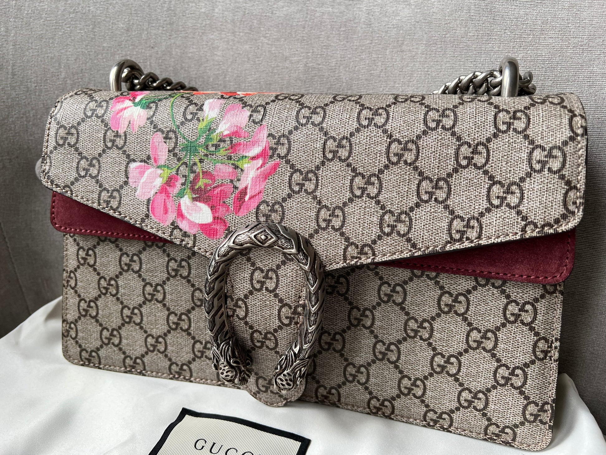 Gucci Small Dionysus GG Shoulder Bag in Blooms Supreme Canvas. The small Dionysus shoulder bag is presented in the signature GG pattern with blooms print, trimmed with deep pink suede details. Featuring the tiger head closure, this iconic style is perfect for day or evening use. The sliding chain strap can be lengthened or doubled up over the shoulder or in the crook of the arm. Note the strap is not long enough to be cross body.