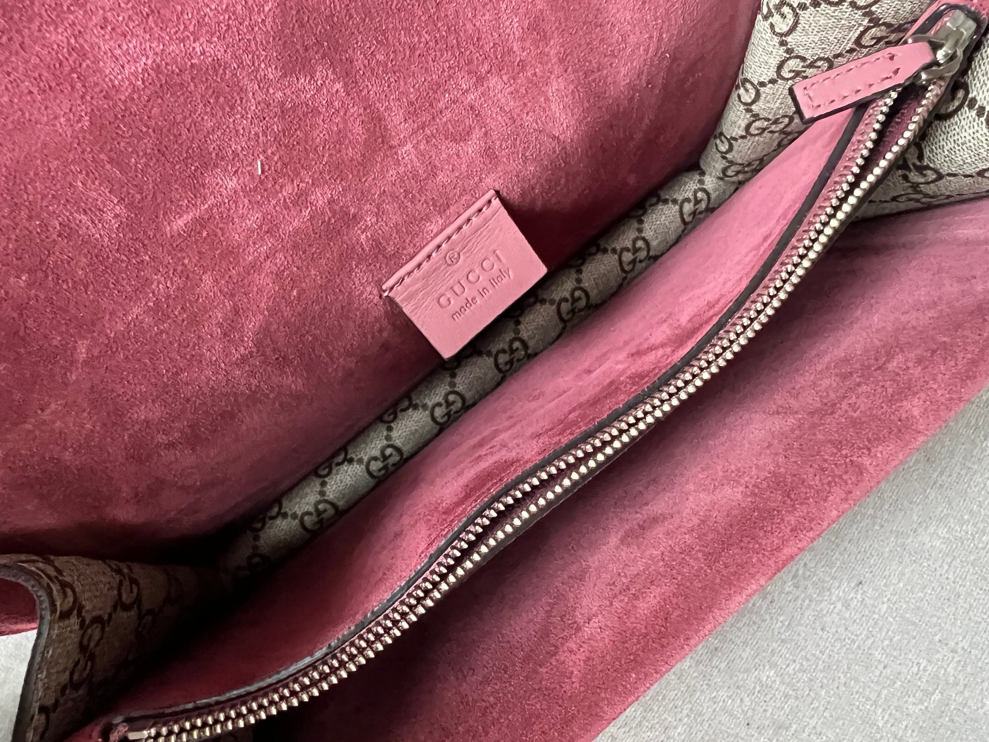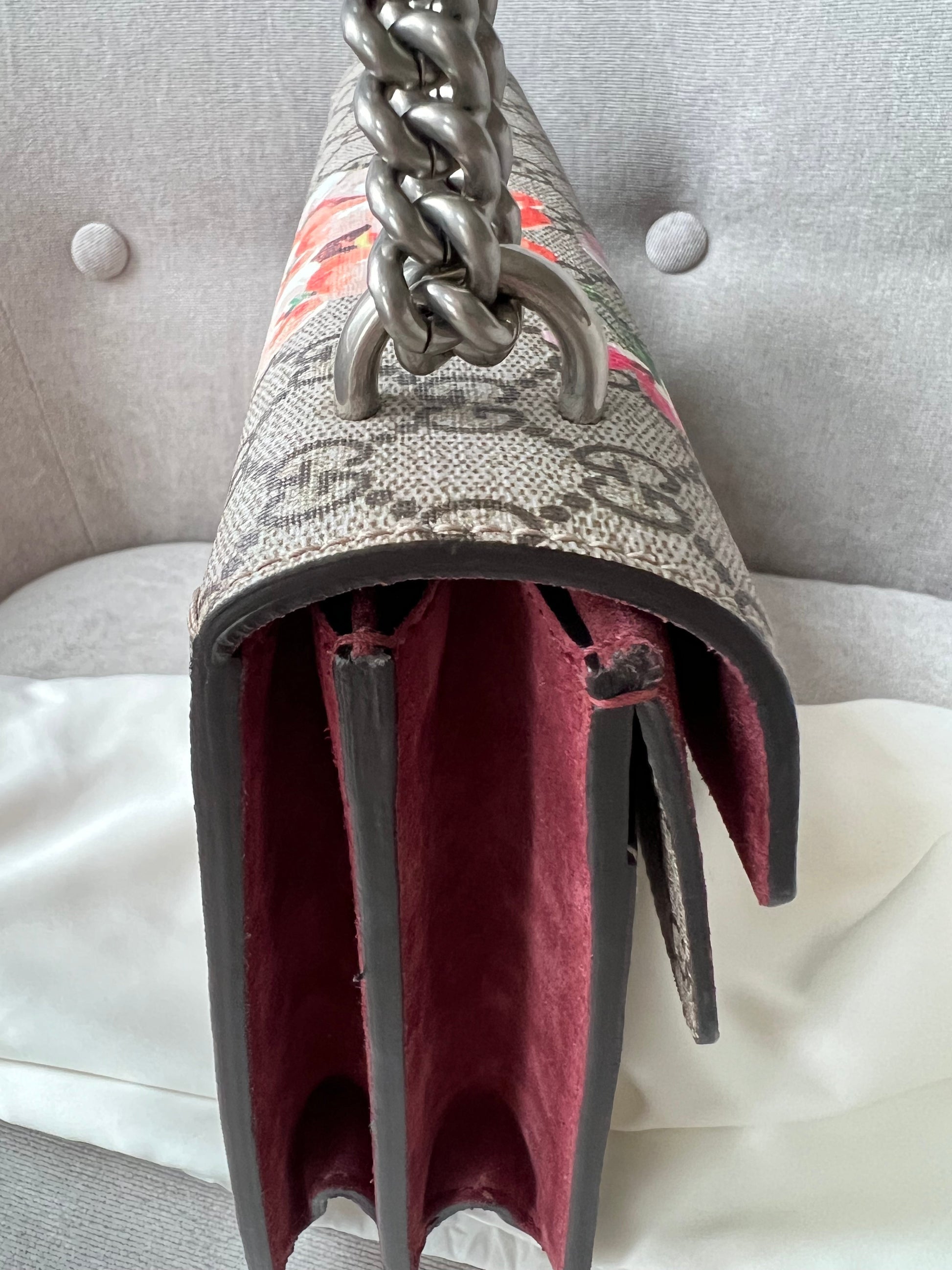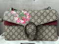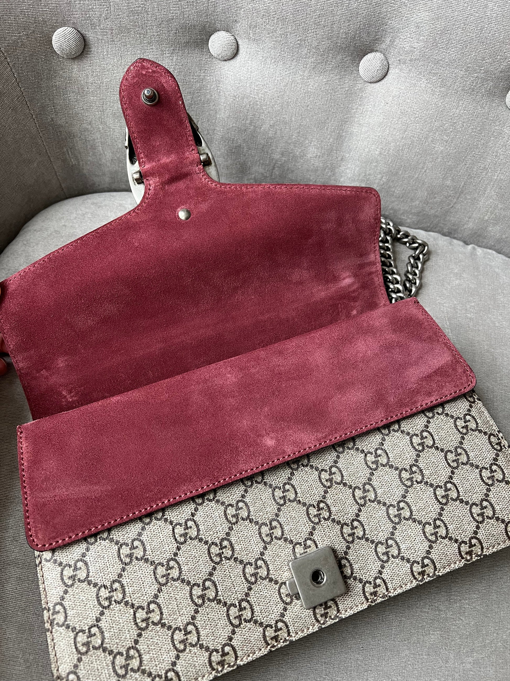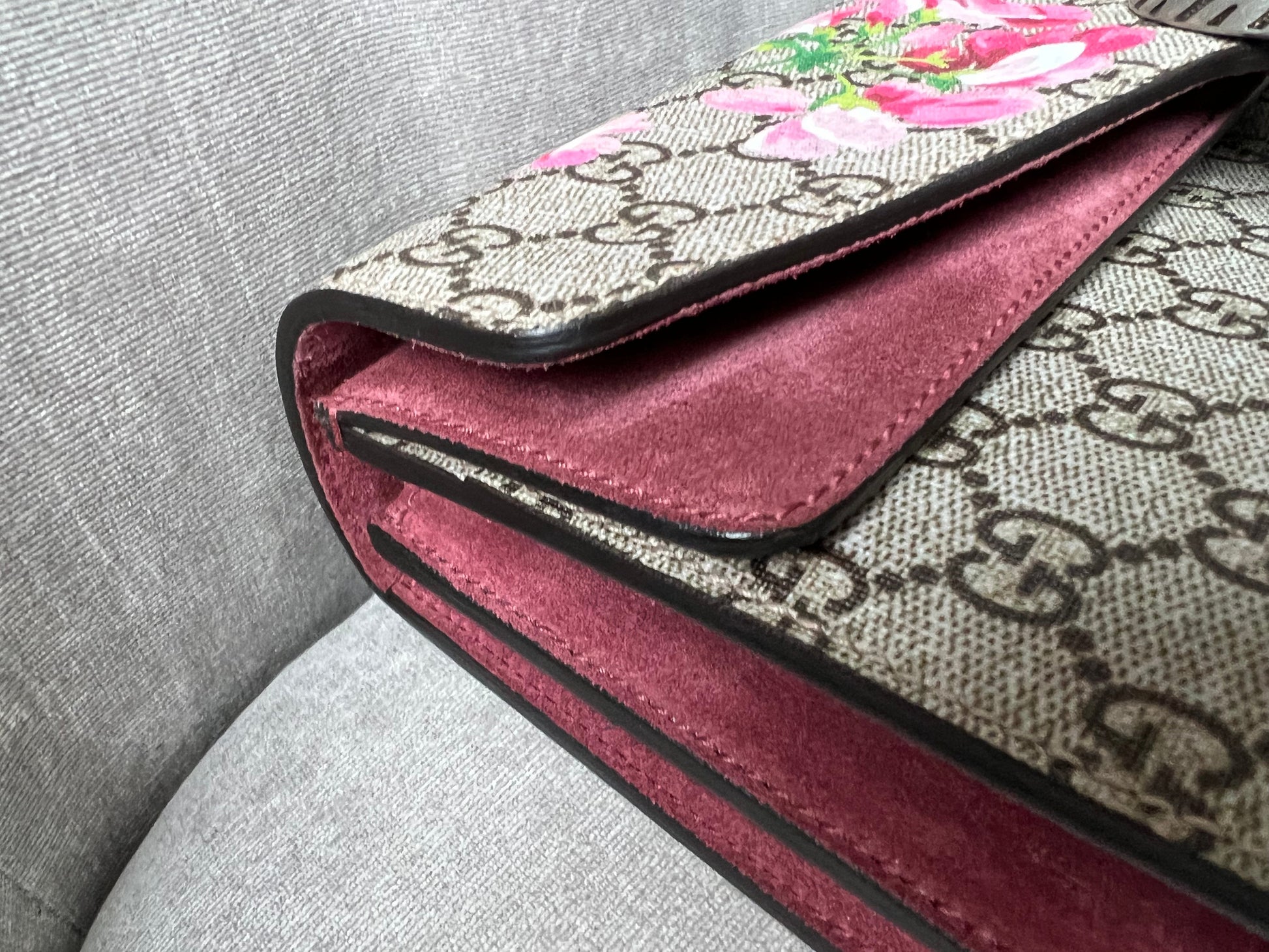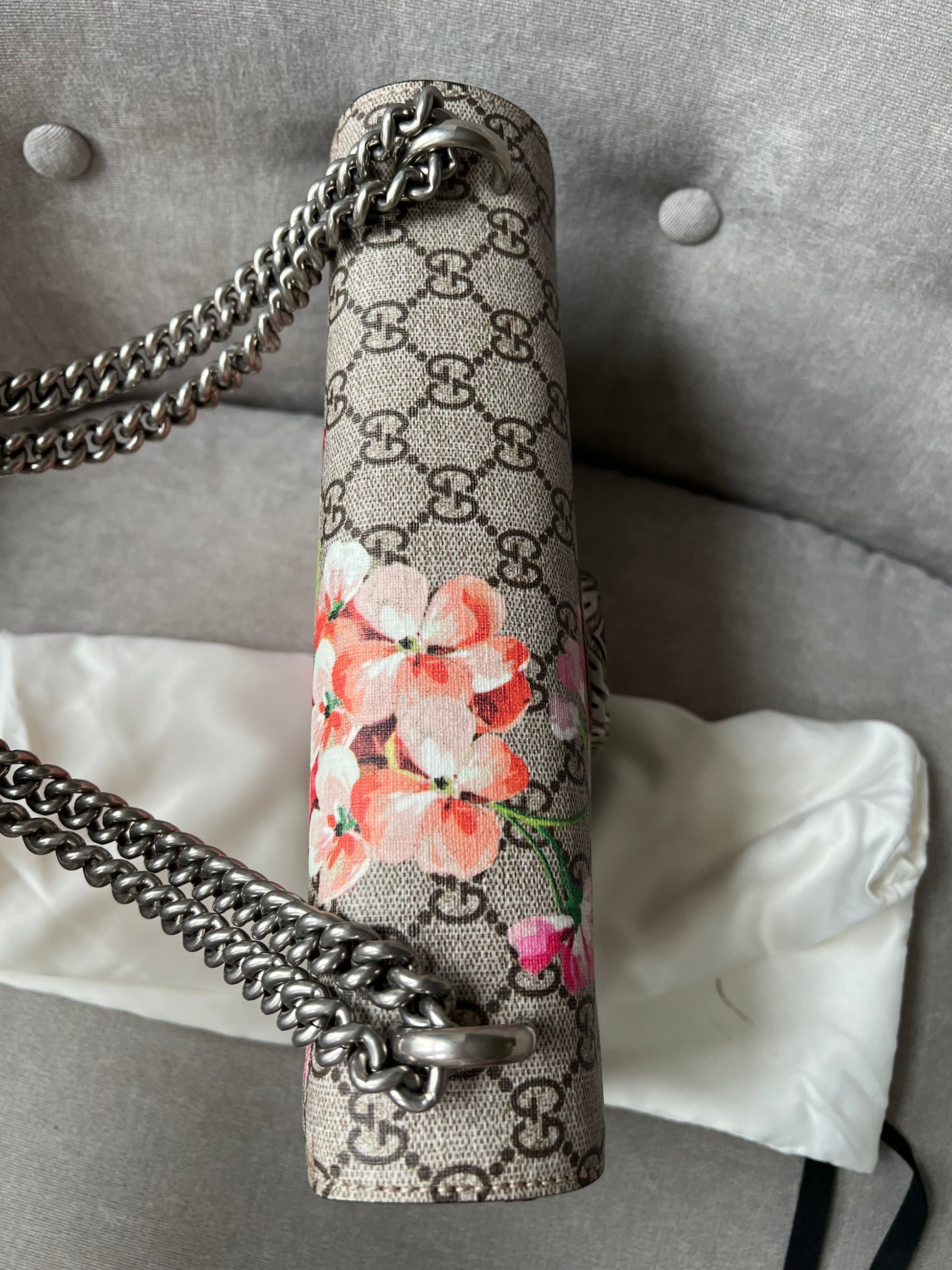 Gucci Small Dionysus GG Shoulder Bag in Blooms Supreme Canvas. The small Dionysus shoulder bag is presented in the signature GG pattern with blooms print, trimmed with deep pink suede details. Featuring the tiger head closure, this iconic style is perfect for day or evening use. The sliding chain strap can be lengthened or doubled up over the shoulder or in the crook of the arm. Note the strap is not long enough to be cross body.