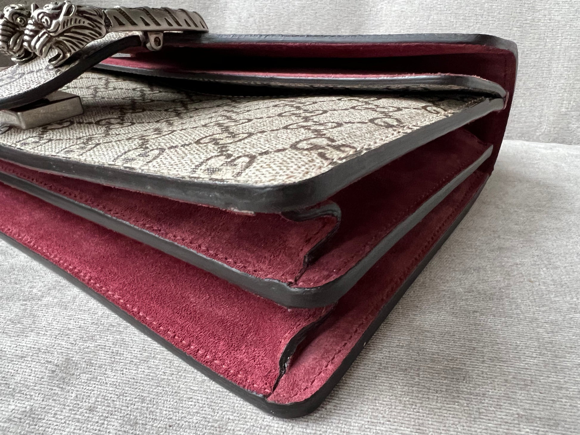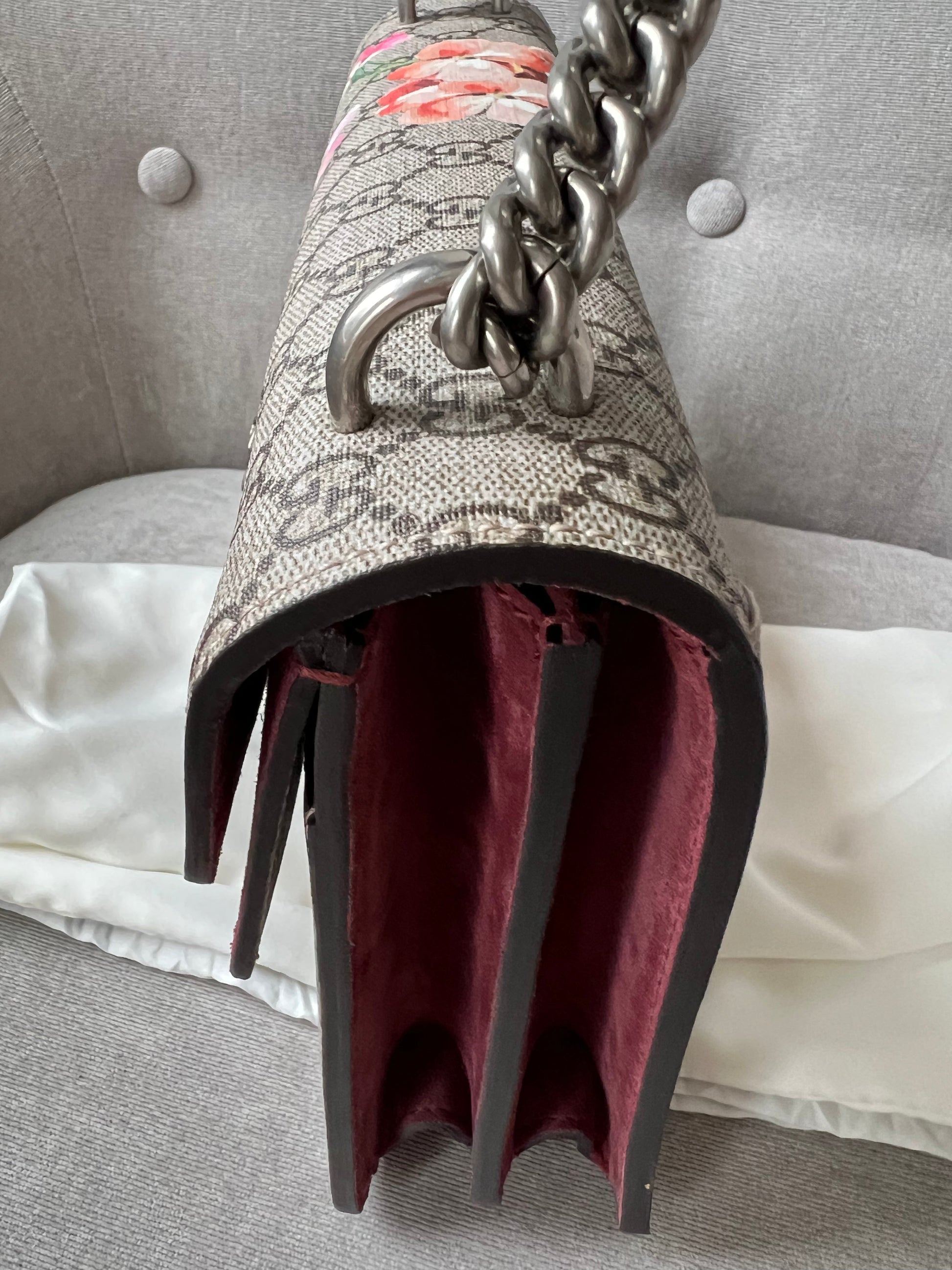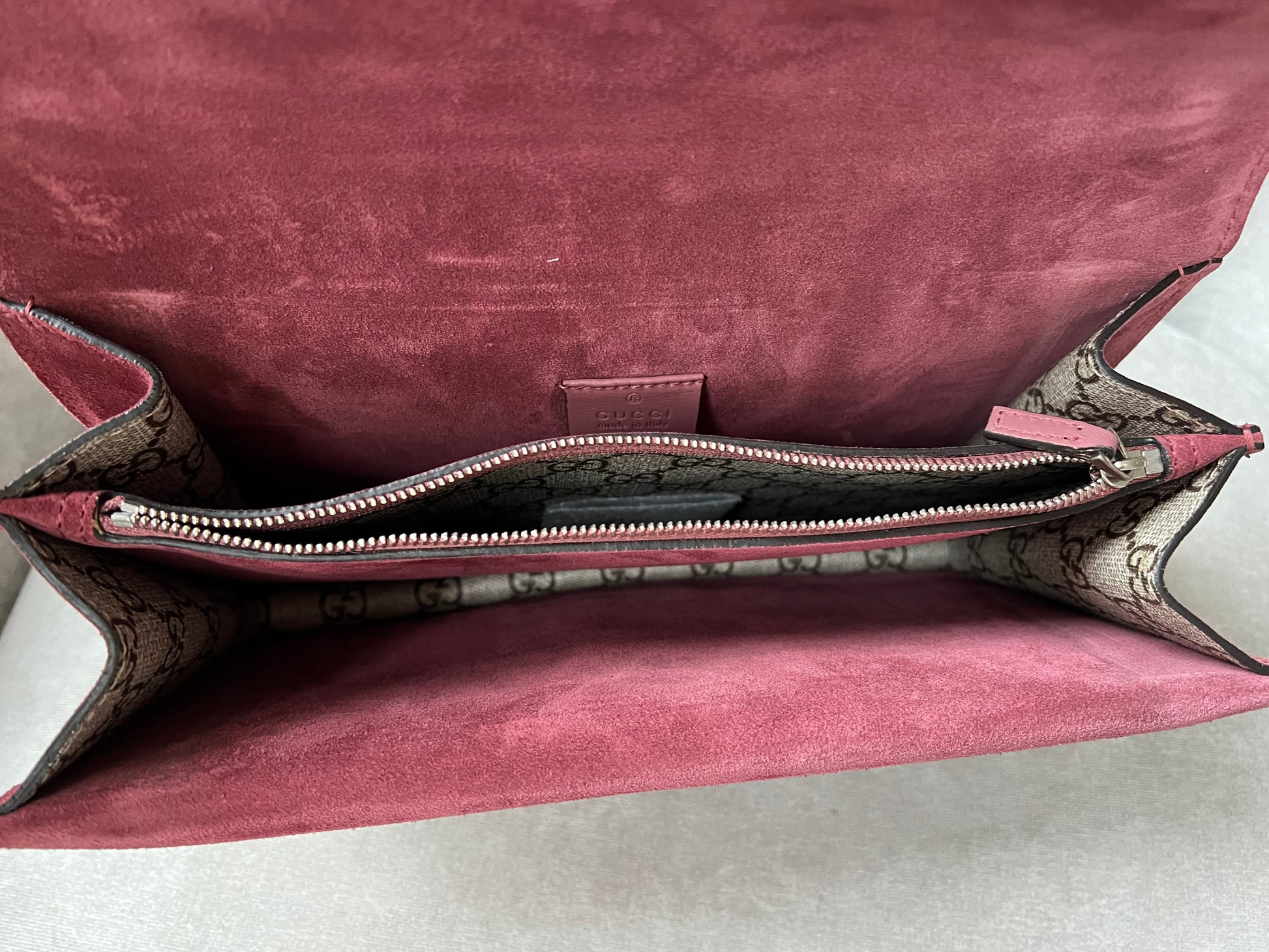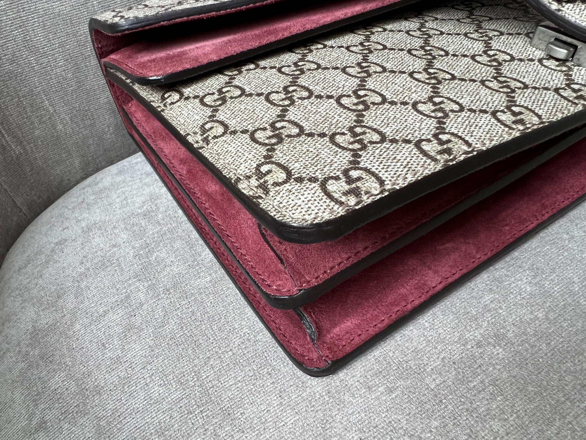 Gucci Small Dionysus GG Shoulder Bag in Blooms Supreme Canvas. The small Dionysus shoulder bag is presented in the signature GG pattern with blooms print, trimmed with deep pink suede details. Featuring the tiger head closure, this iconic style is perfect for day or evening use. The sliding chain strap can be lengthened or doubled up over the shoulder or in the crook of the arm. Note the strap is not long enough to be cross body.