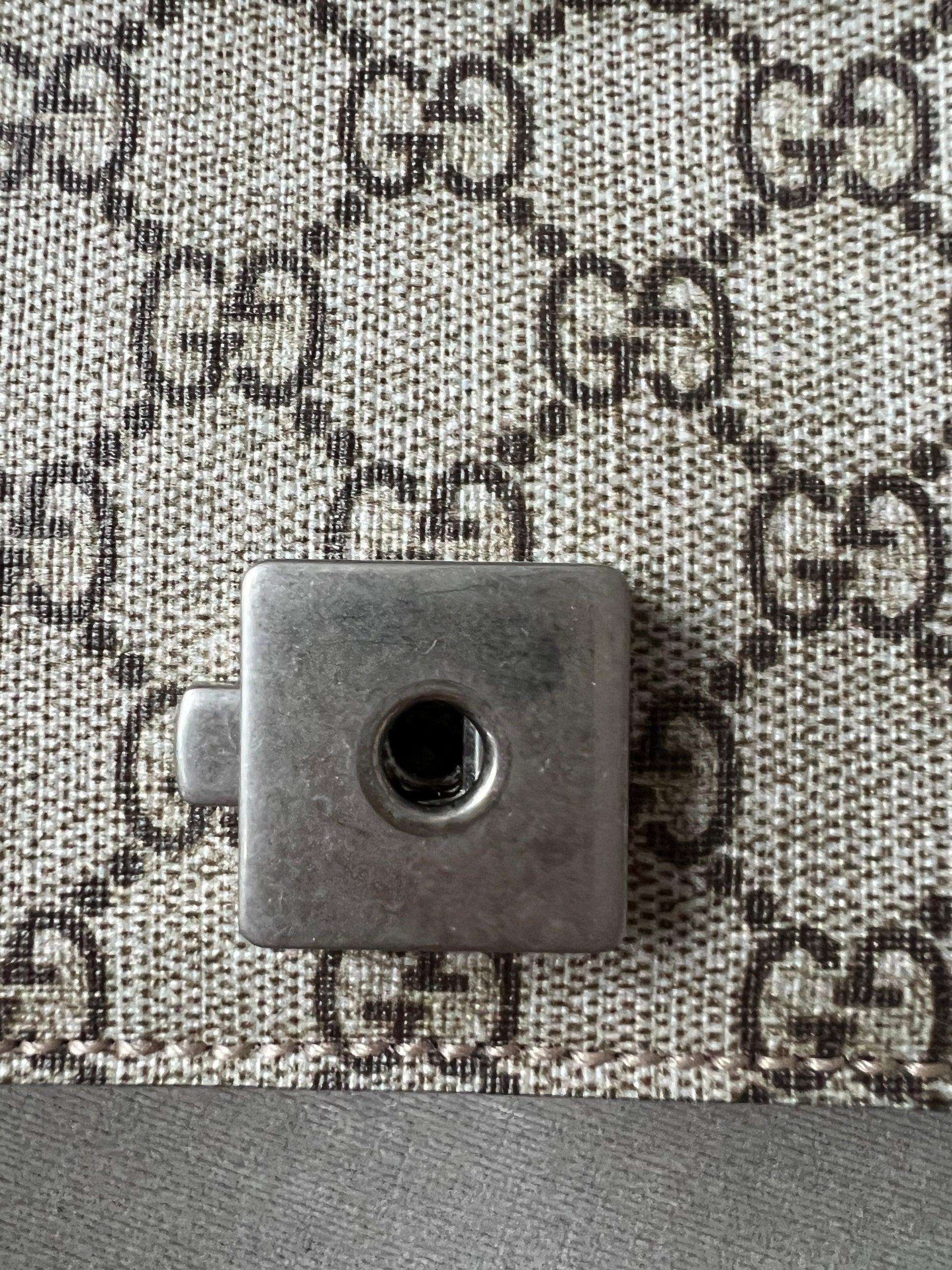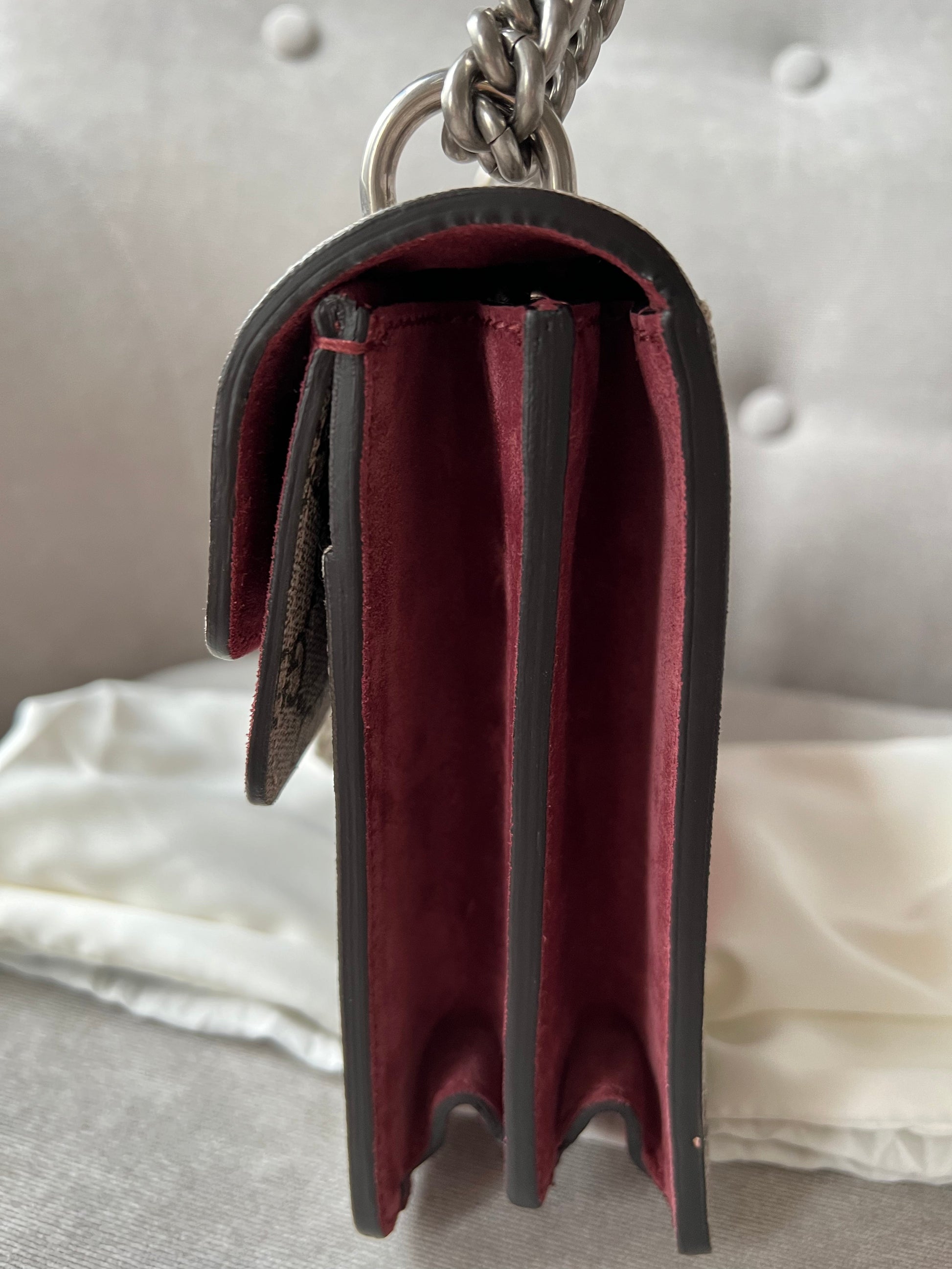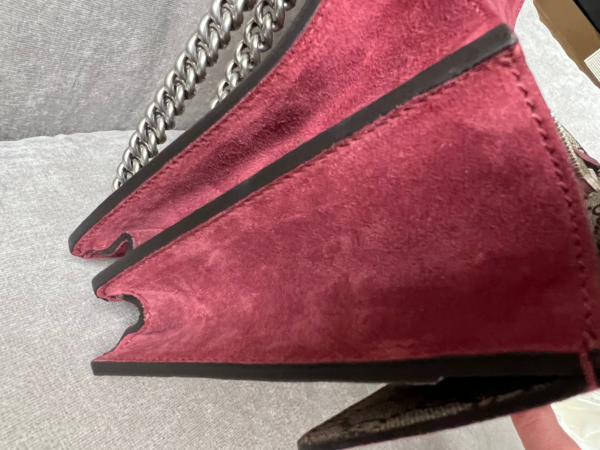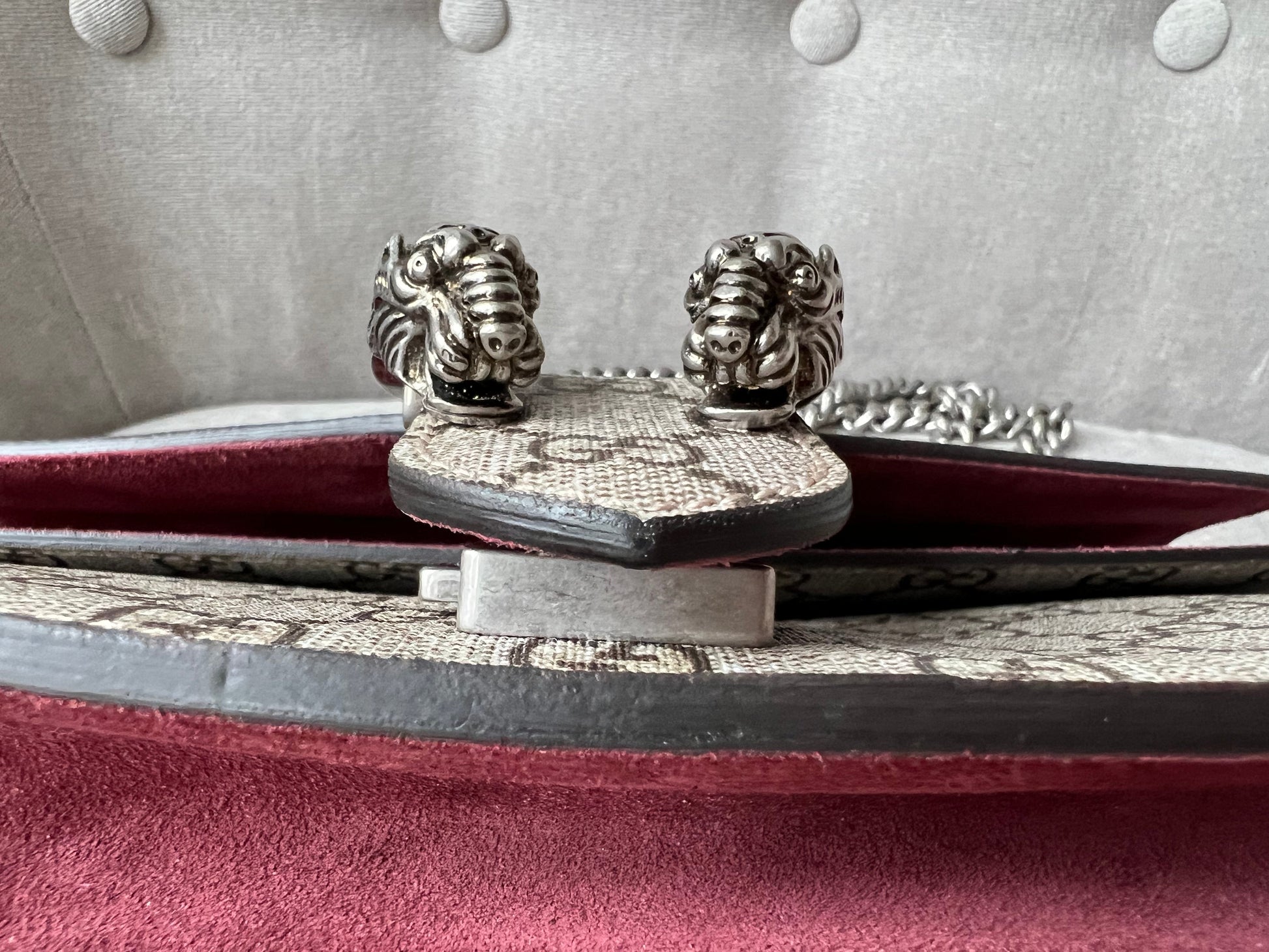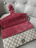Gucci Small Dionysus GG Shoulder Bag in Blooms Supreme Canvas. The small Dionysus shoulder bag is presented in the signature GG pattern with blooms print, trimmed with deep pink suede details. Featuring the tiger head closure, this iconic style is perfect for day or evening use. The sliding chain strap can be lengthened or doubled up over the shoulder or in the crook of the arm. Note the strap is not long enough to be cross body.