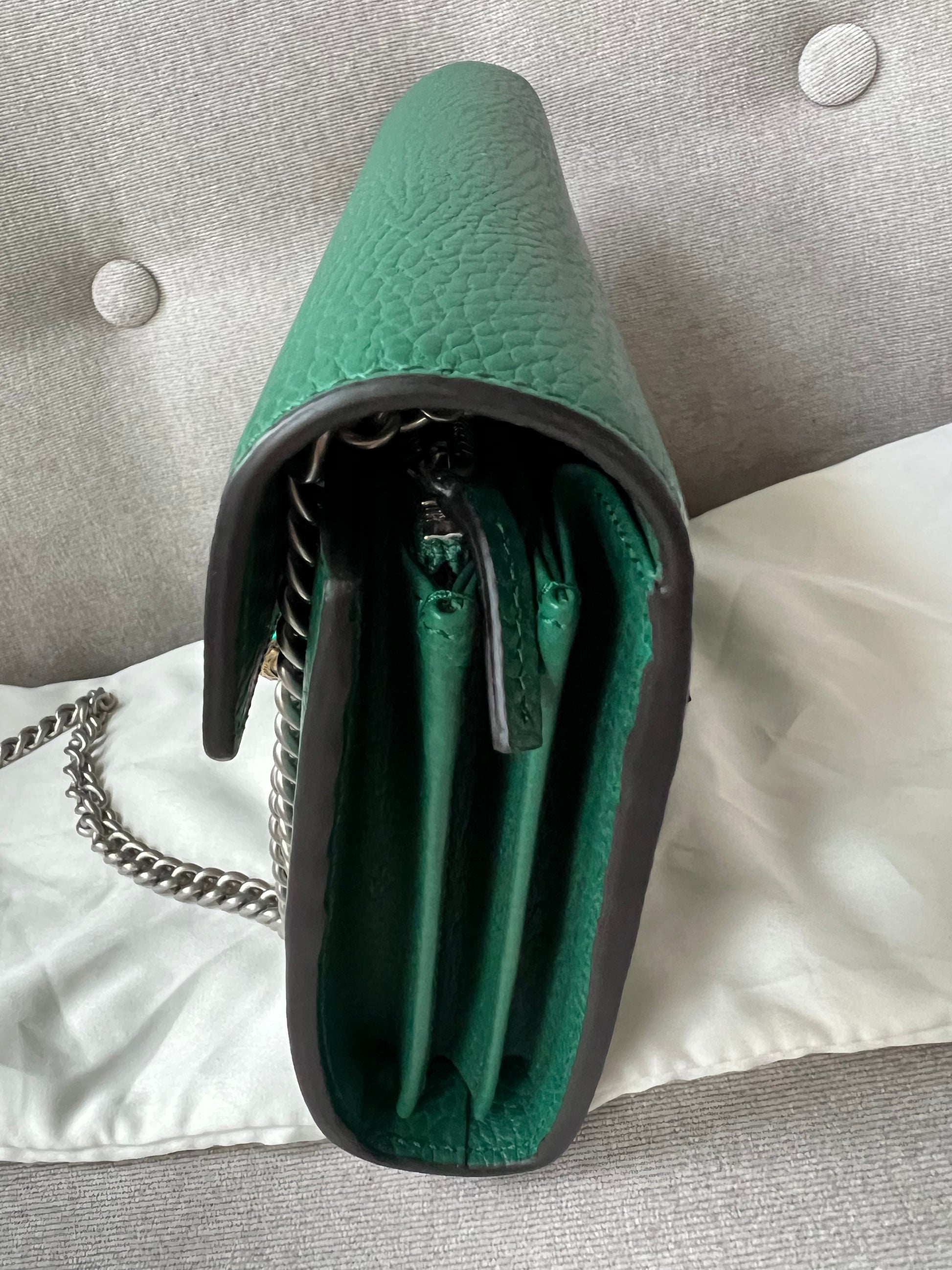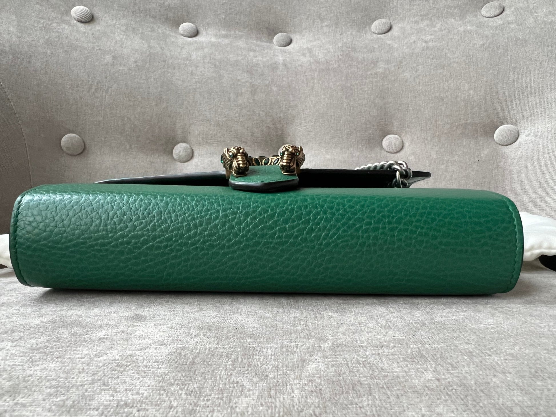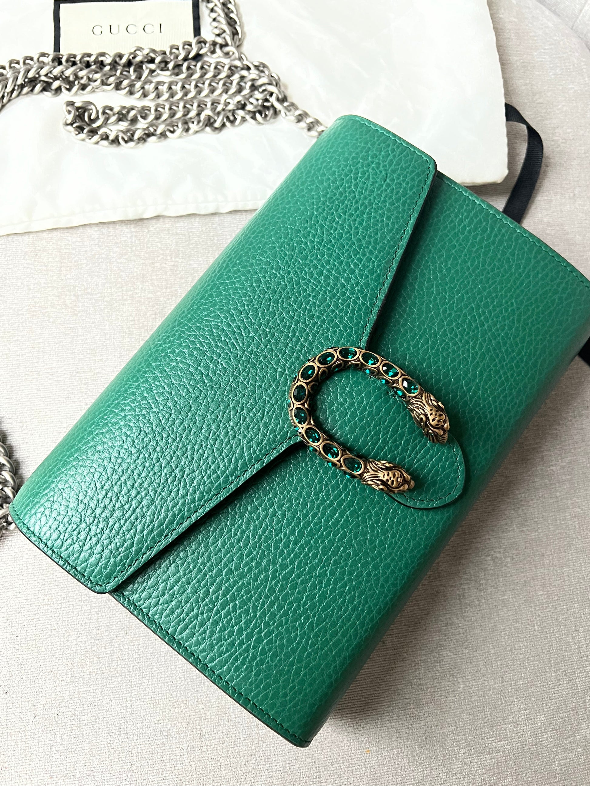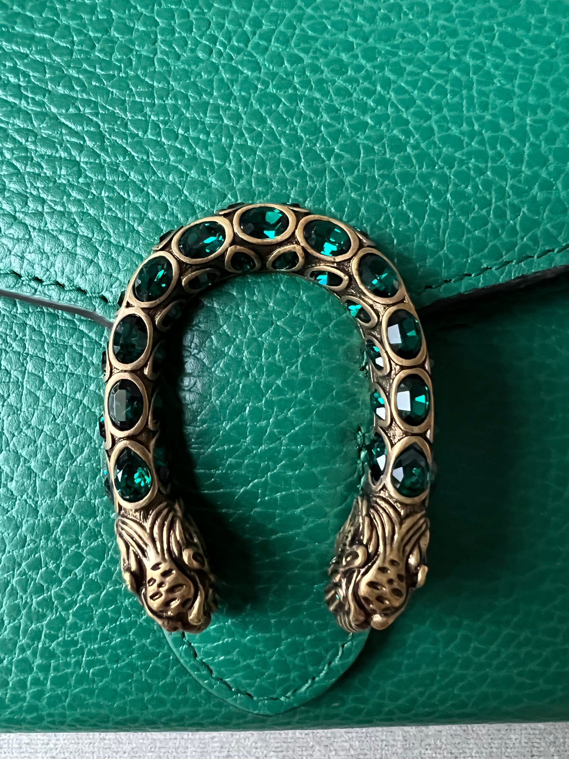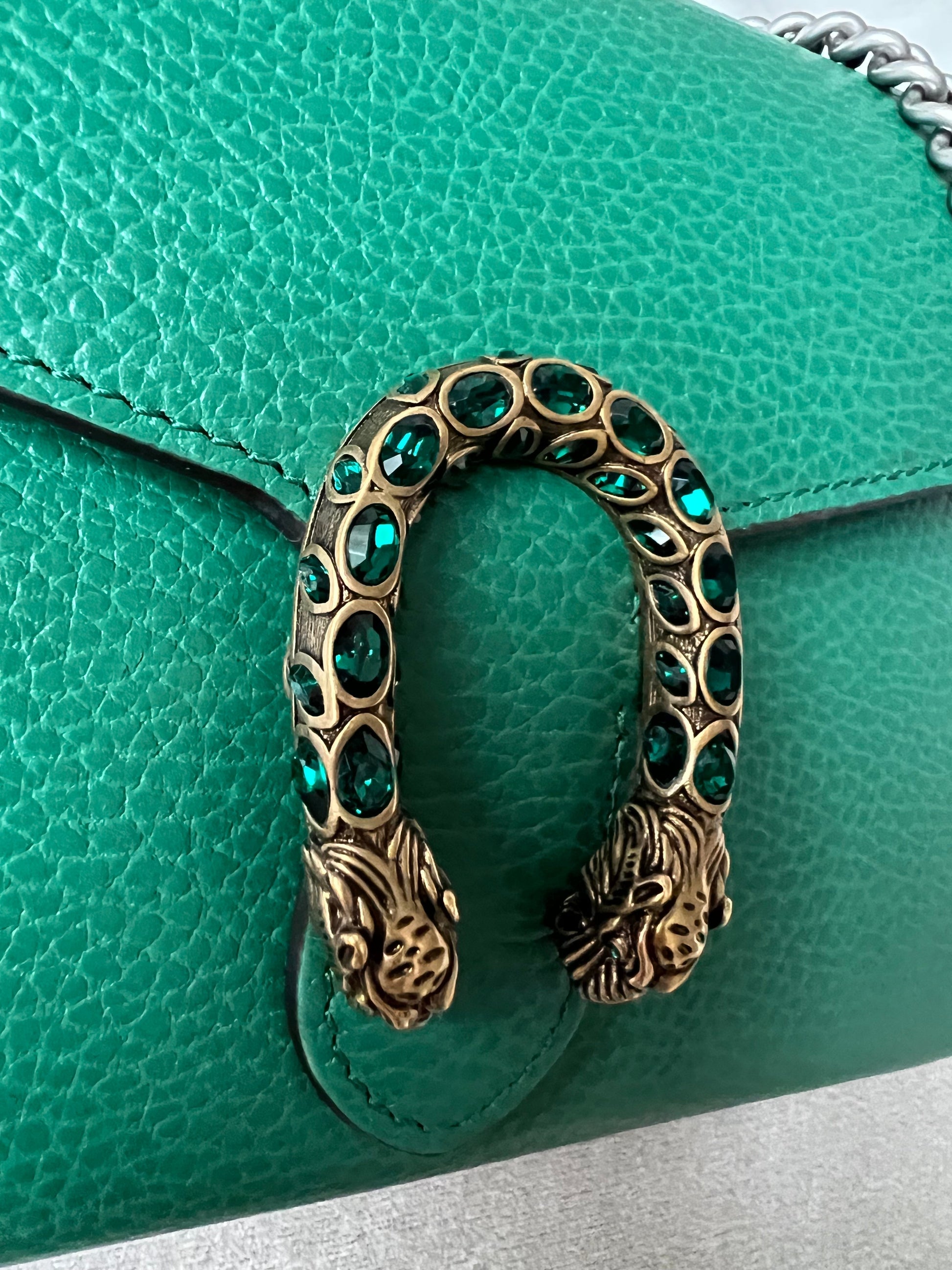 Gucci Dionysus Mini Chain bag in emerald green grained calf leather with antique silver hardware. This chain wallet style features the textured tiger head press stud closure. The tiger head is enriched with Swarovski crystal stones. Ideal for evening or event wear. Can be carried over the shoulder or cross body, or carried as a handheld clutch with the detachable strap removed.