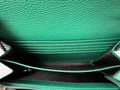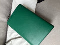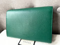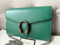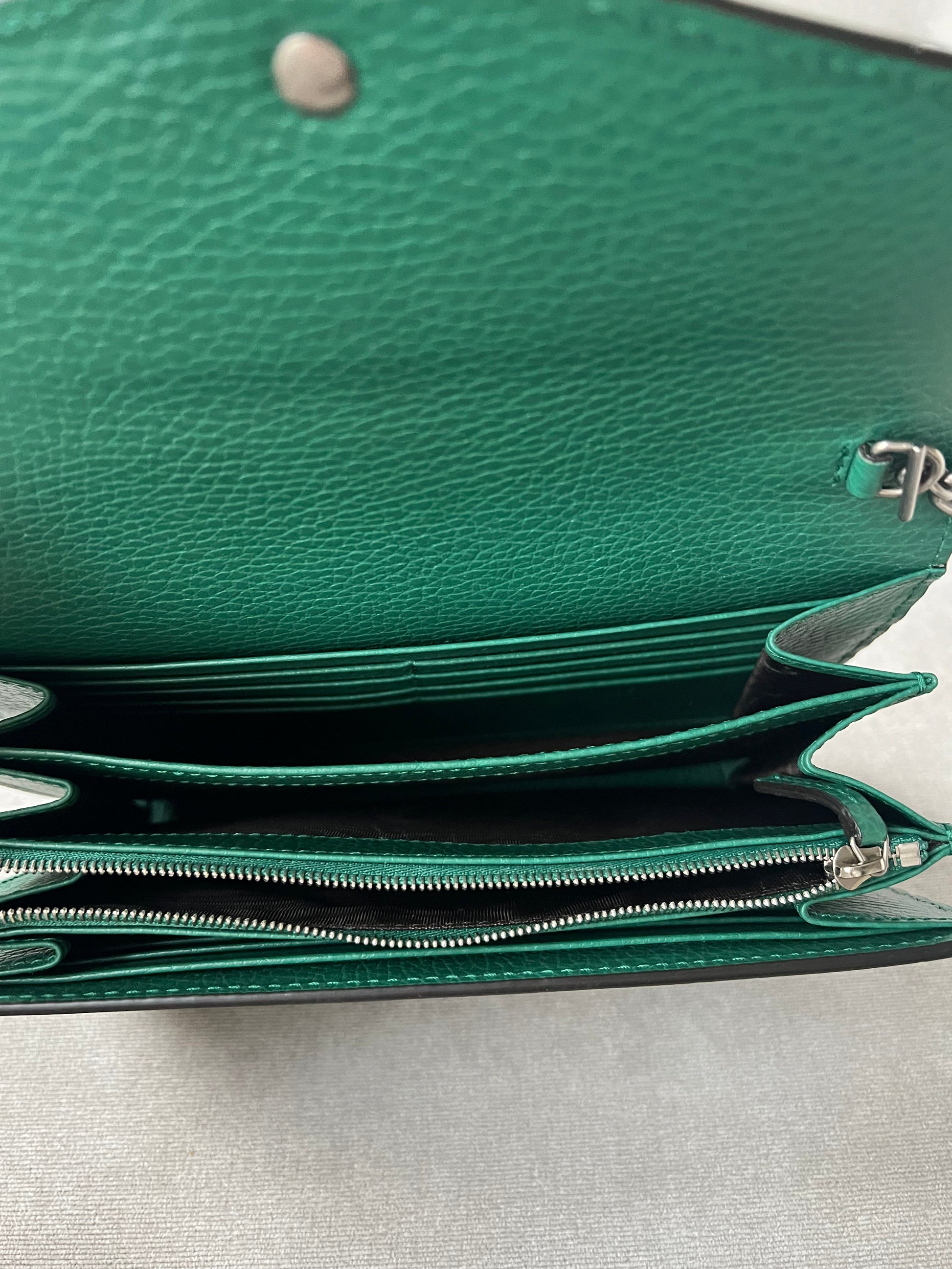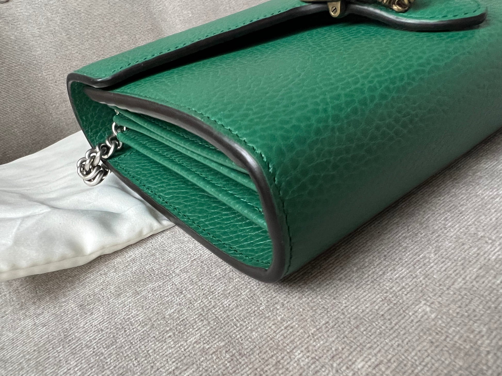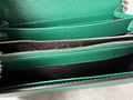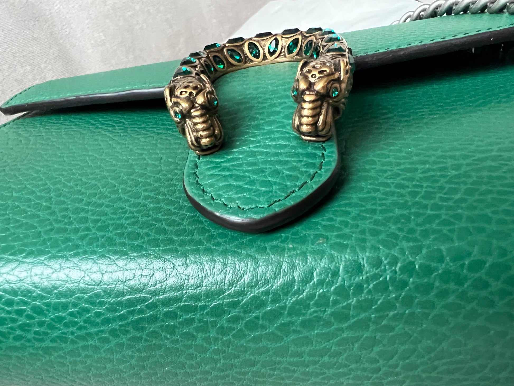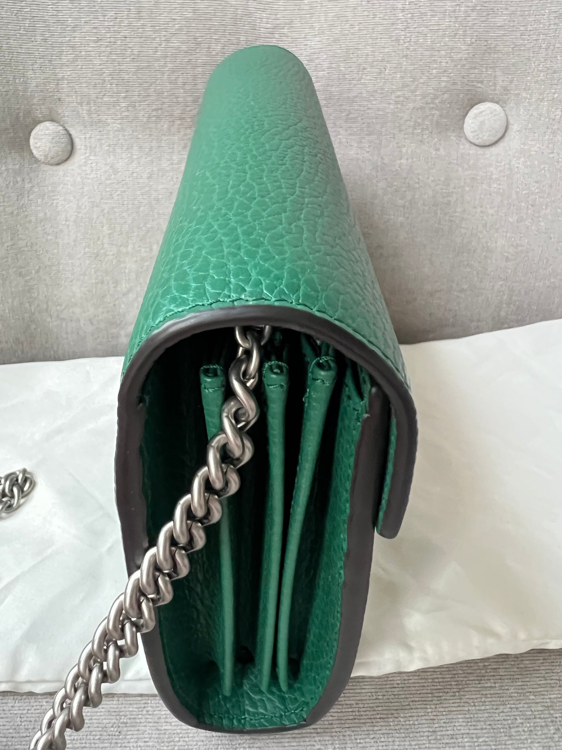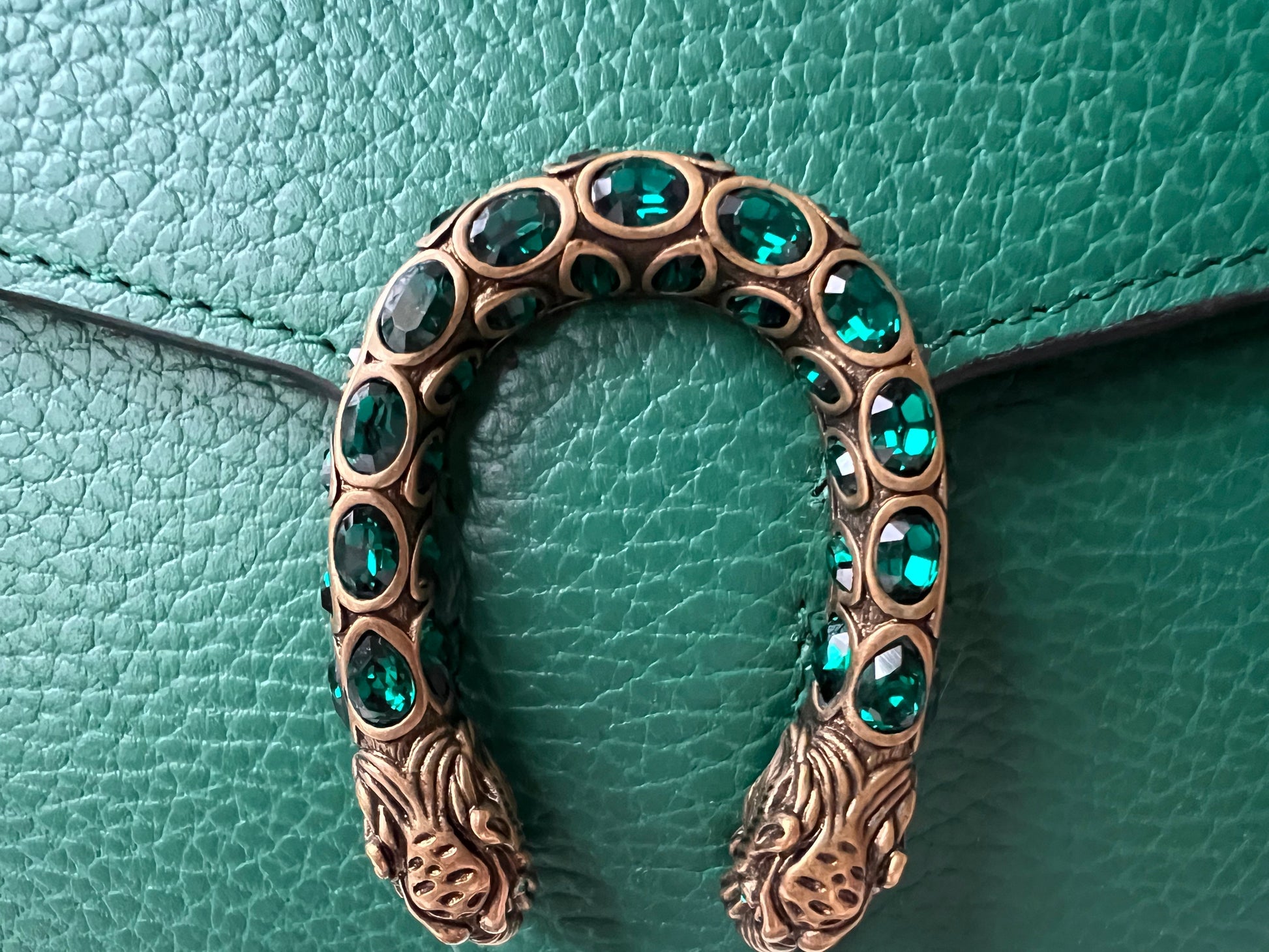 Gucci Dionysus Mini Chain bag in emerald green grained calf leather with antique silver hardware. This chain wallet style features the textured tiger head press stud closure. The tiger head is enriched with Swarovski crystal stones. Ideal for evening or event wear. Can be carried over the shoulder or cross body, or carried as a handheld clutch with the detachable strap removed.