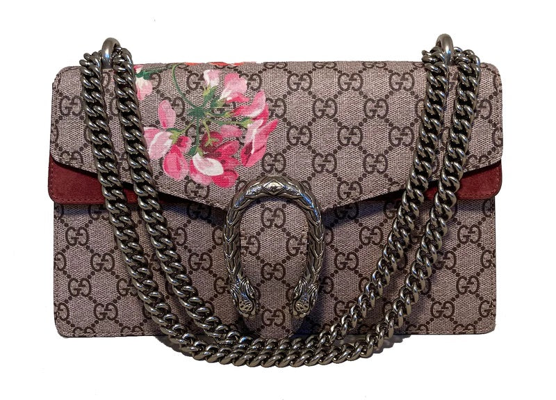 Gucci Dionysus small GG Blooms shoulder bag very good condition. clean exterior. 2 small pen marks on interior lining. one small area of suede on interior lining. otherwise excellent. measurements: 11"x7"x3.5" 8.5-14.5" strap