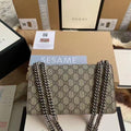 structured GG Supreme canvas bag with our textured tiger head closure-a unique detail referencing the Greek god Dionysus, who in myth is said to have crossed the river Tigris on a tiger sent to him by Zeus. The sliding chain strap can be multiple ways, changing between a shoulder and a top handle bag.